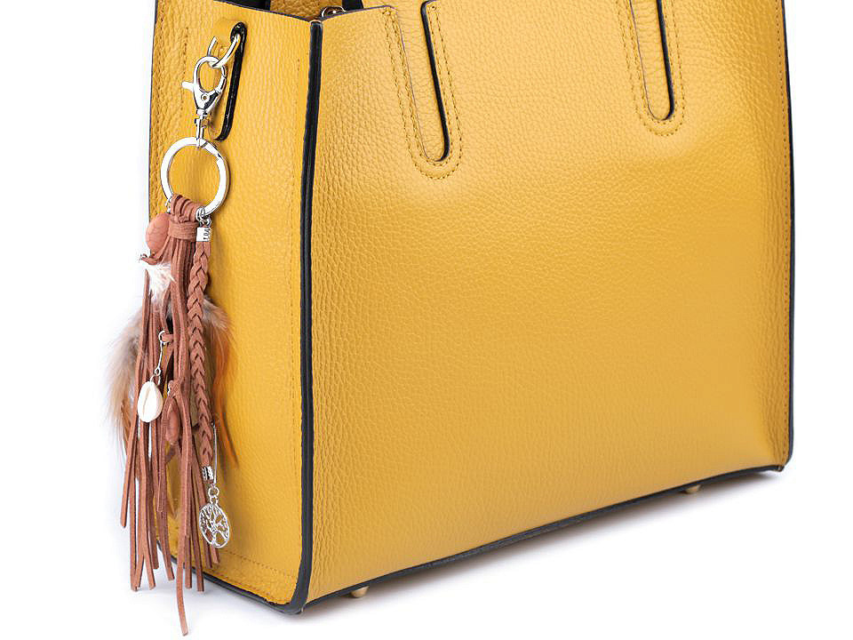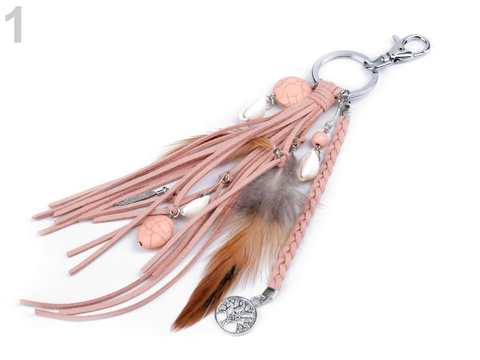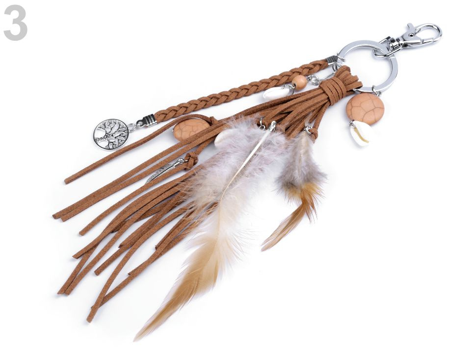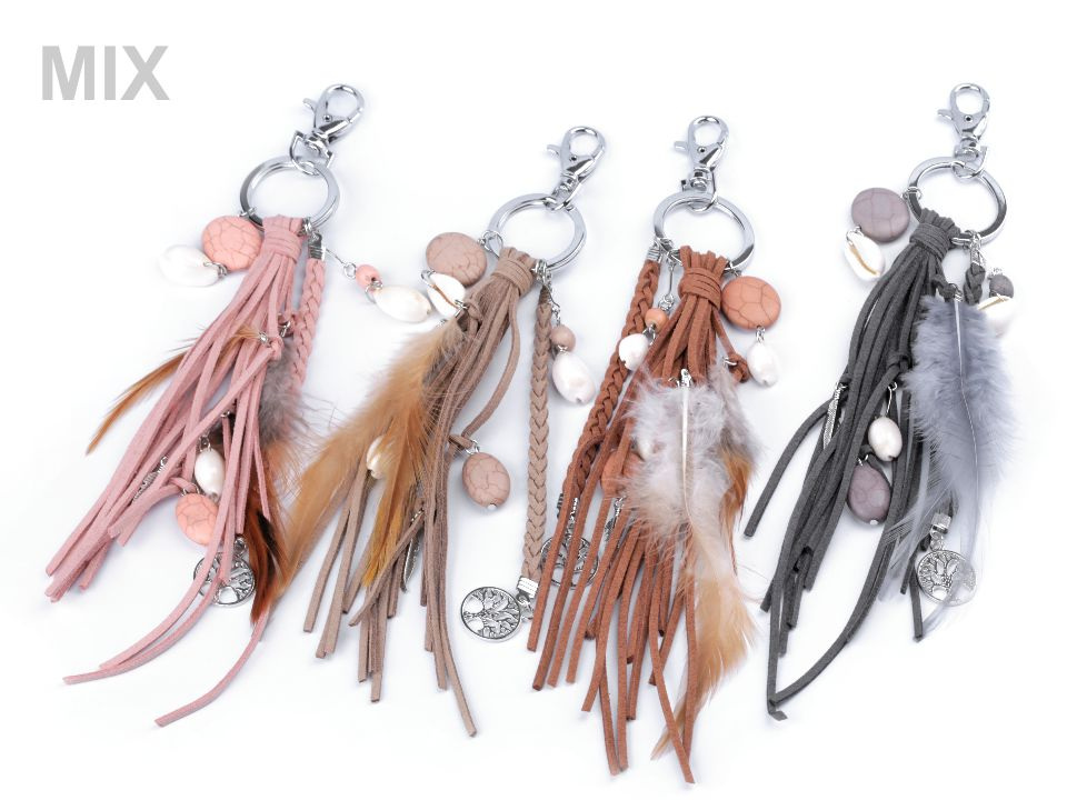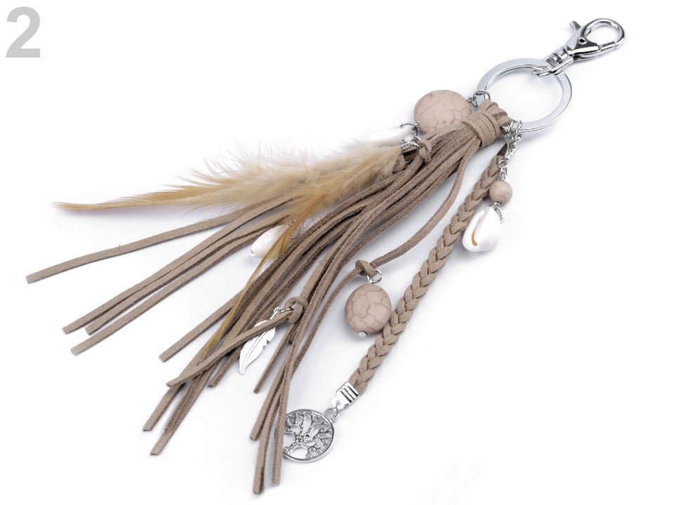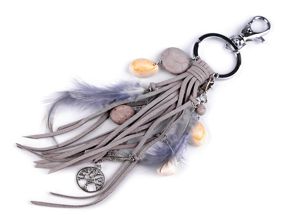 Nepřehlédnutelný přívěsek v boho stylu je ozdobený pírkem, mušlemi, korálky a kovovým přívěskem stromu života. Jeho základ tvoří bohatý střapec z eko kůže. Díky otočné karabince nebo rozevíracího kroužku si můžete tento stylový doplněk připnout na tašku, batoh, kabelku nebo klíče.