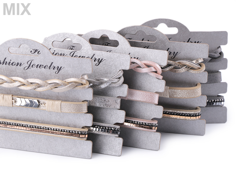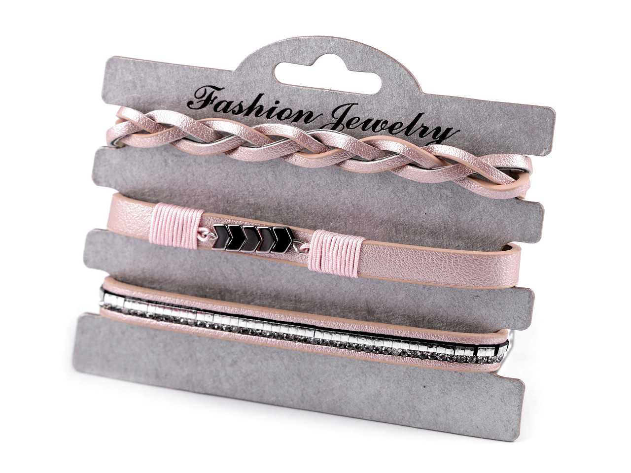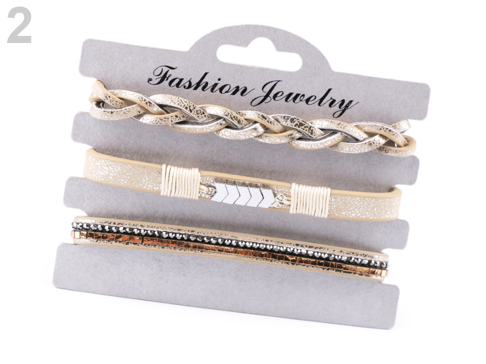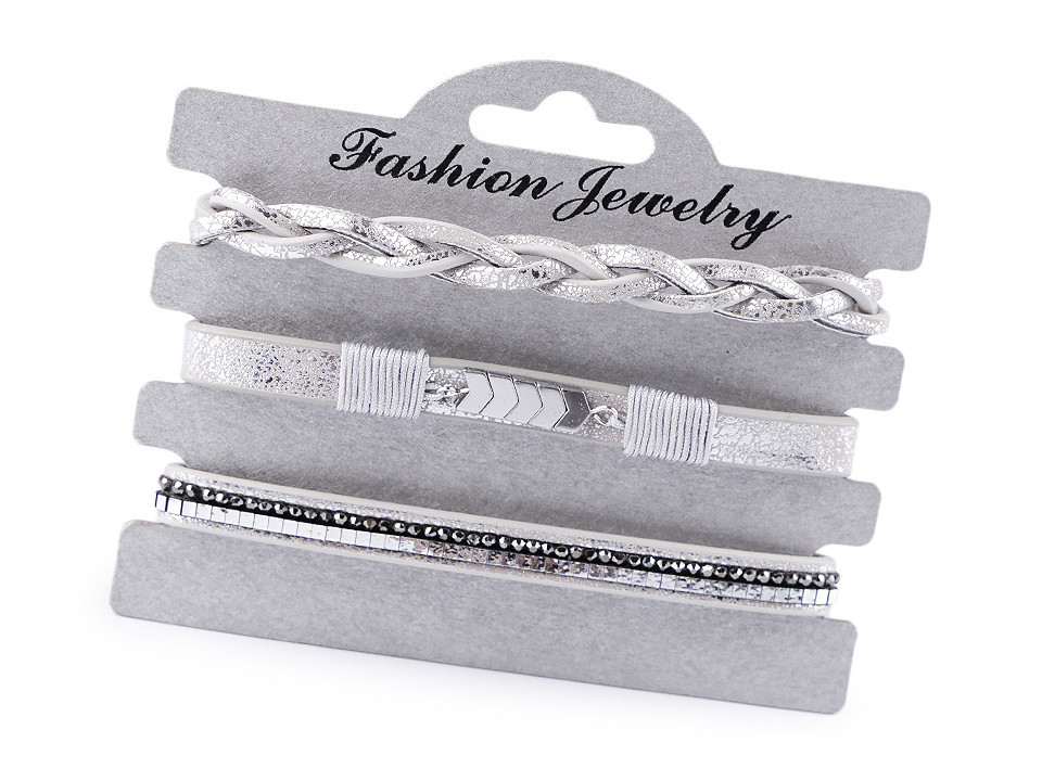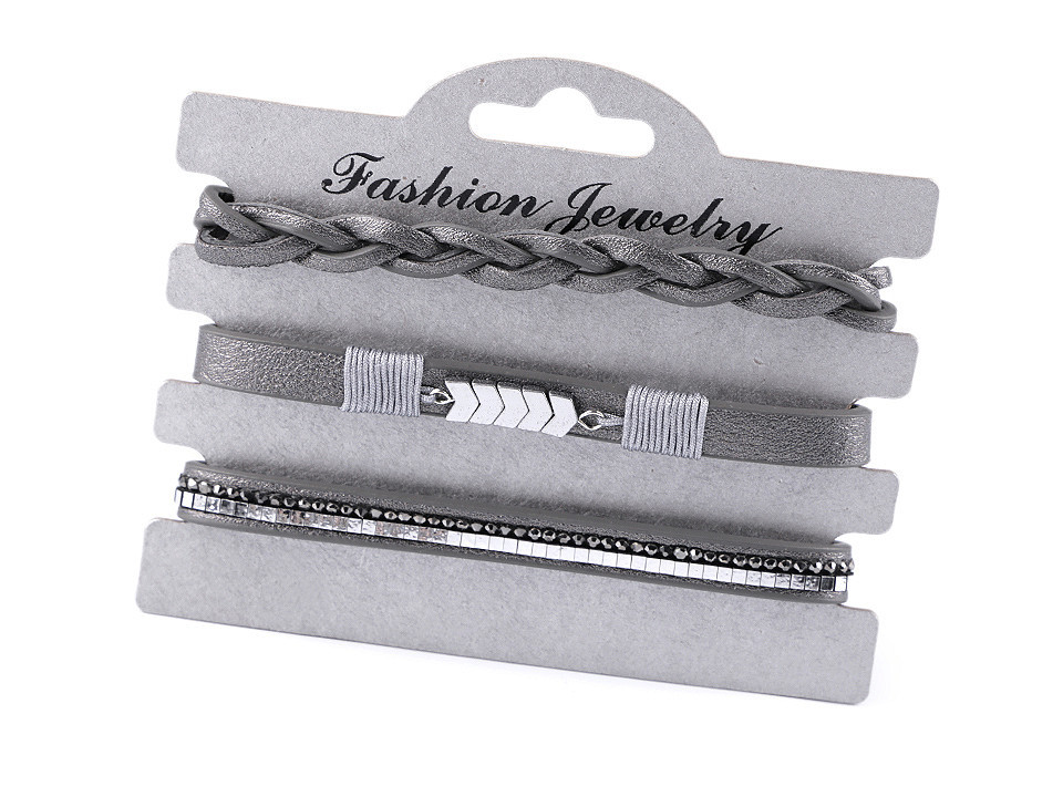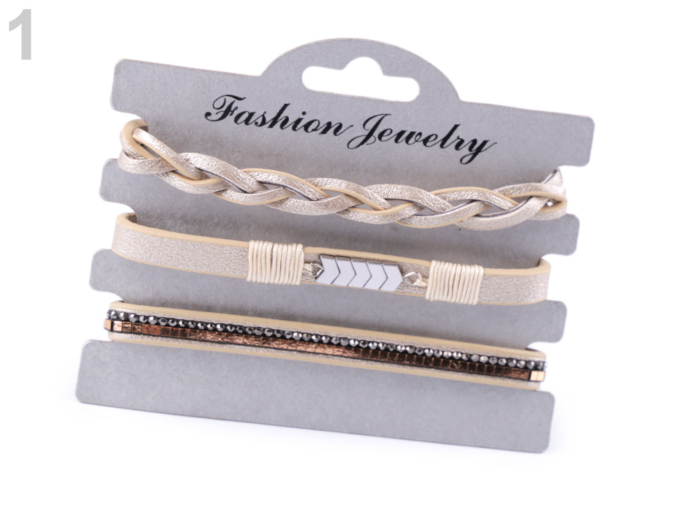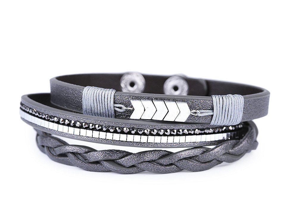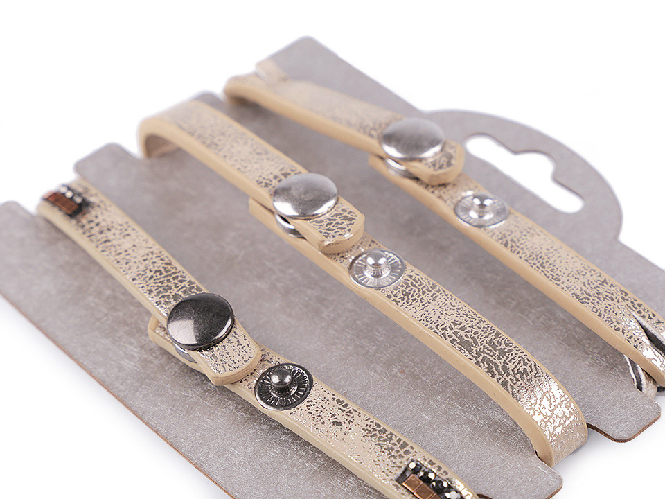 Elegantní a nepřehlédnutelná sada 3 navzájem sladěných náramků z eko kůže s metalickým leskem. Můžete je nosit najednou nebo samostatně. Náramky mají pevné zapínání na dvě patentky, které lze nastavit na dvě různé délky. Kratší délka je 18,5 cm, delší je 20 cm.