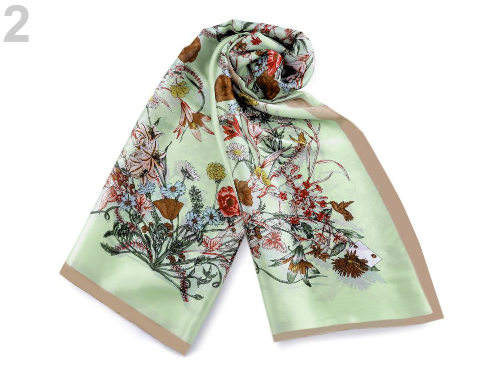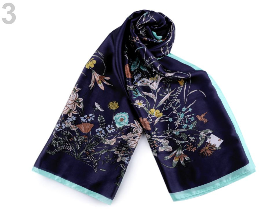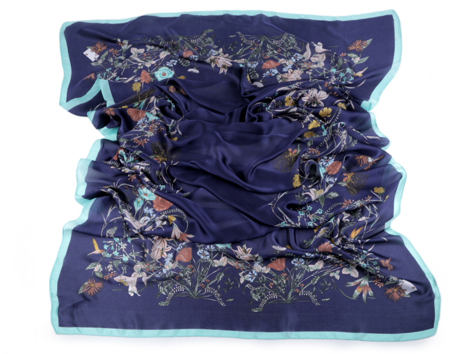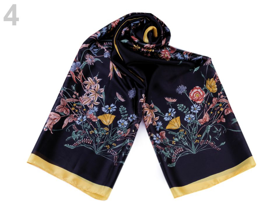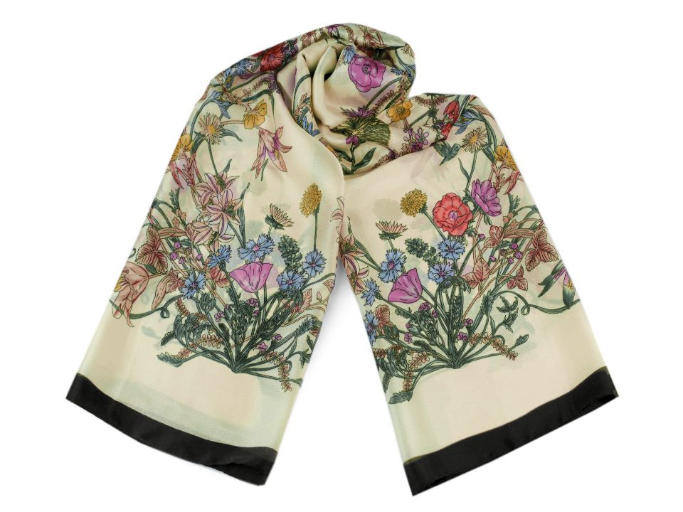 Dámský saténový šátek se záplavou květů připomíná letní louku. Lehounký, měkký materiál šátku je příjemný na dotek. Šátek potěší všechny ženy, které mají rády estetické doplňky. Hodí se do společnosti i na všední nošení ke kabátu, saku, halence, svetříku, šatům apod.