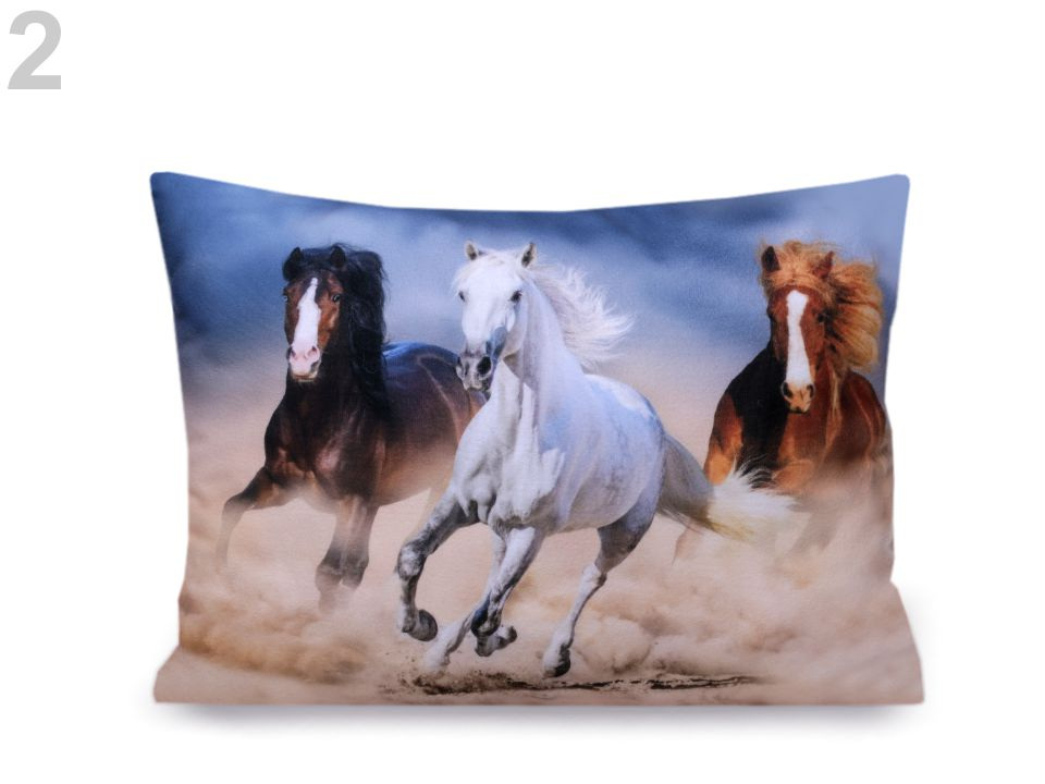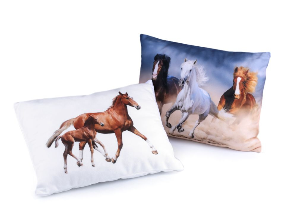 Polštáře s fototiskem koní mají jemný mikroplyšový povrch. Jsou měkké, ale zároveň poskytují pevnou oporu pod hlavu. Jsou jednostranné, doladí gauče či dětské postele.