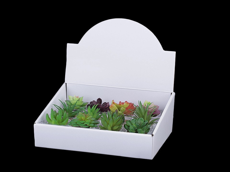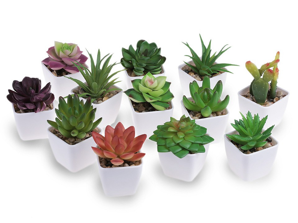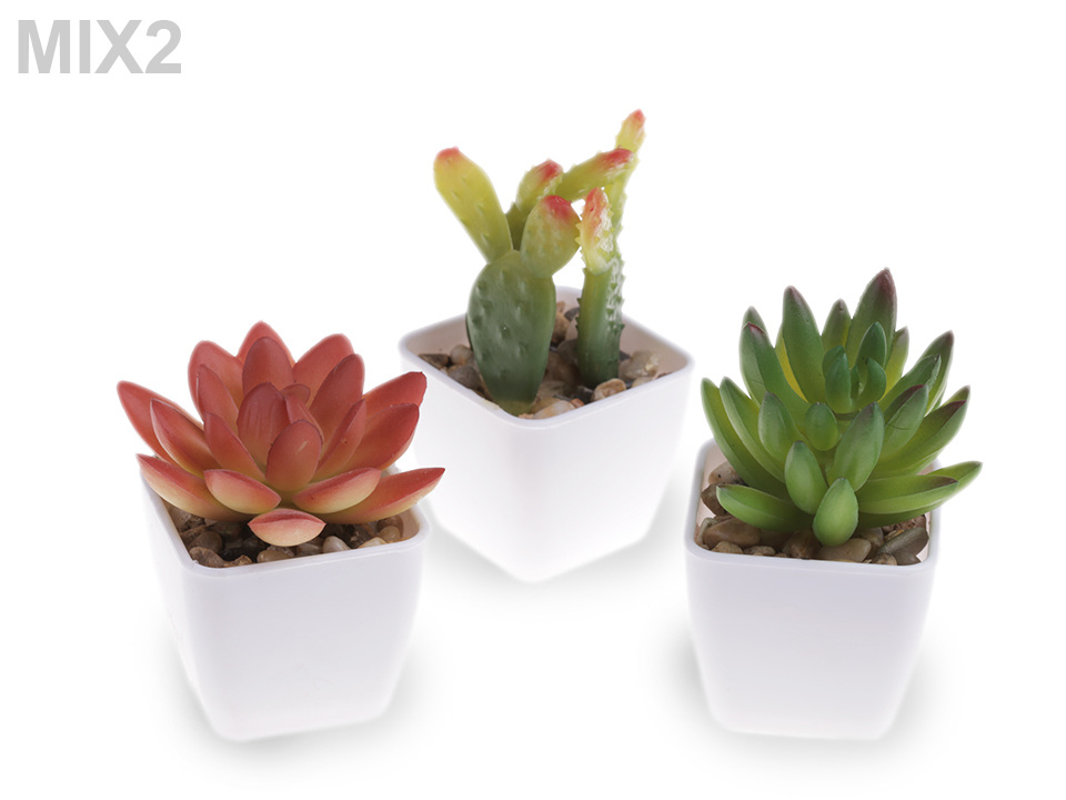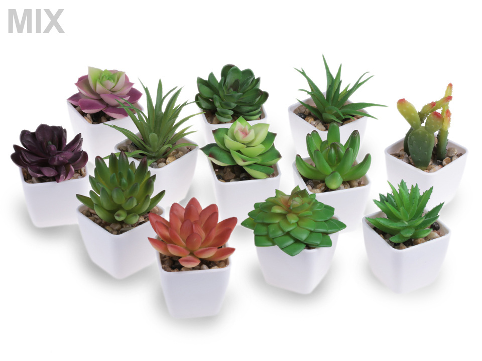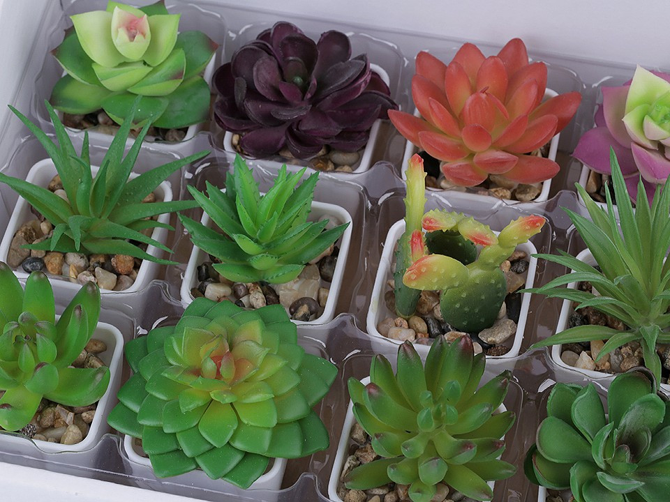 Umělé sukulenty věrně kopírují svou živou předlohu. Vnitřní část květináče pokrývají přírodní kamínky. Sukulenty můžete mezi sebou vzájemně kombinovat. Doladí každý interiér.