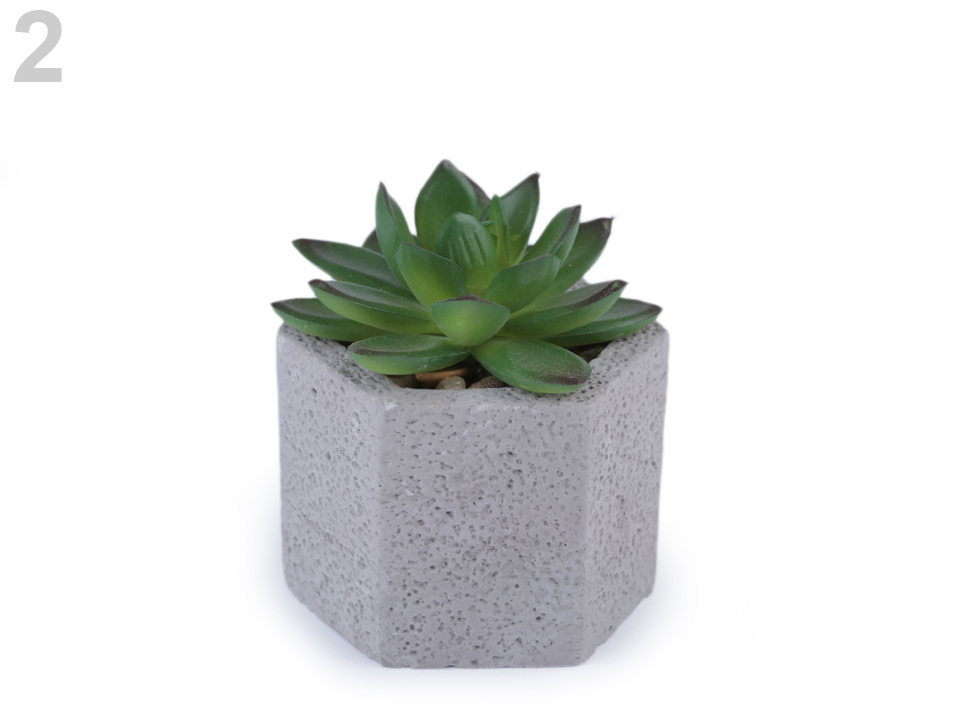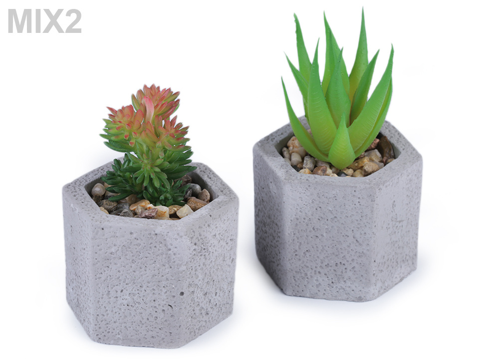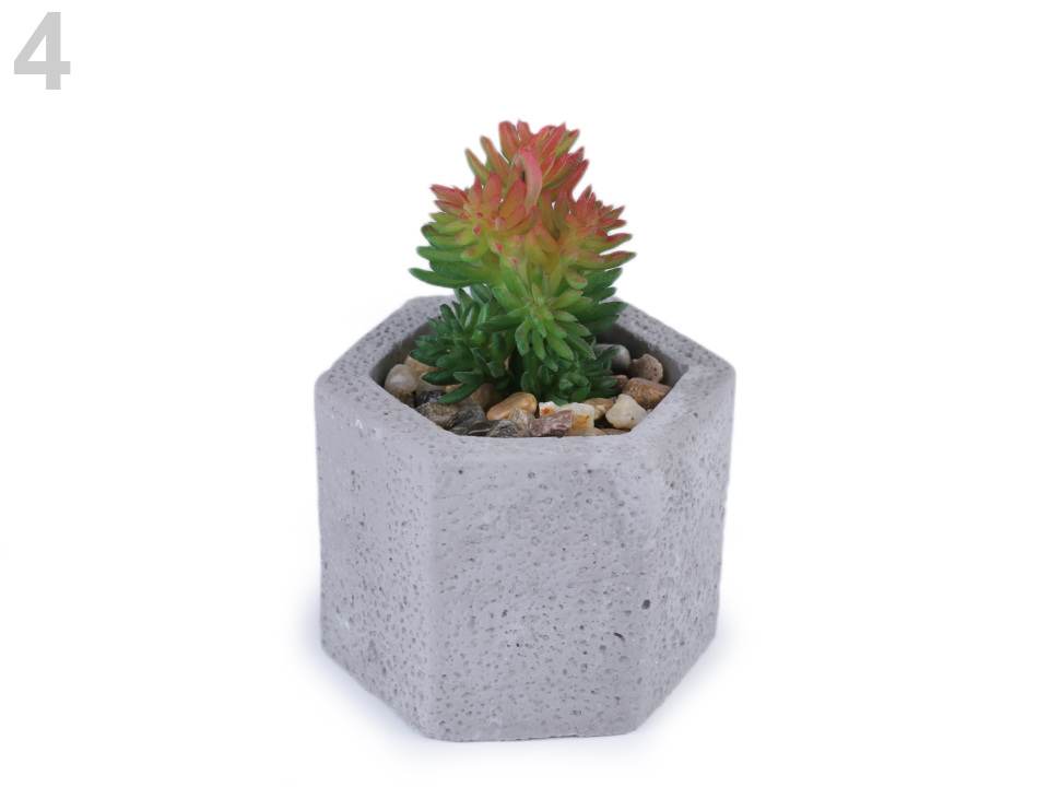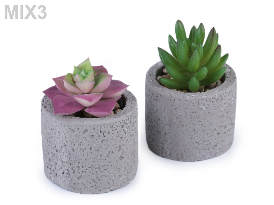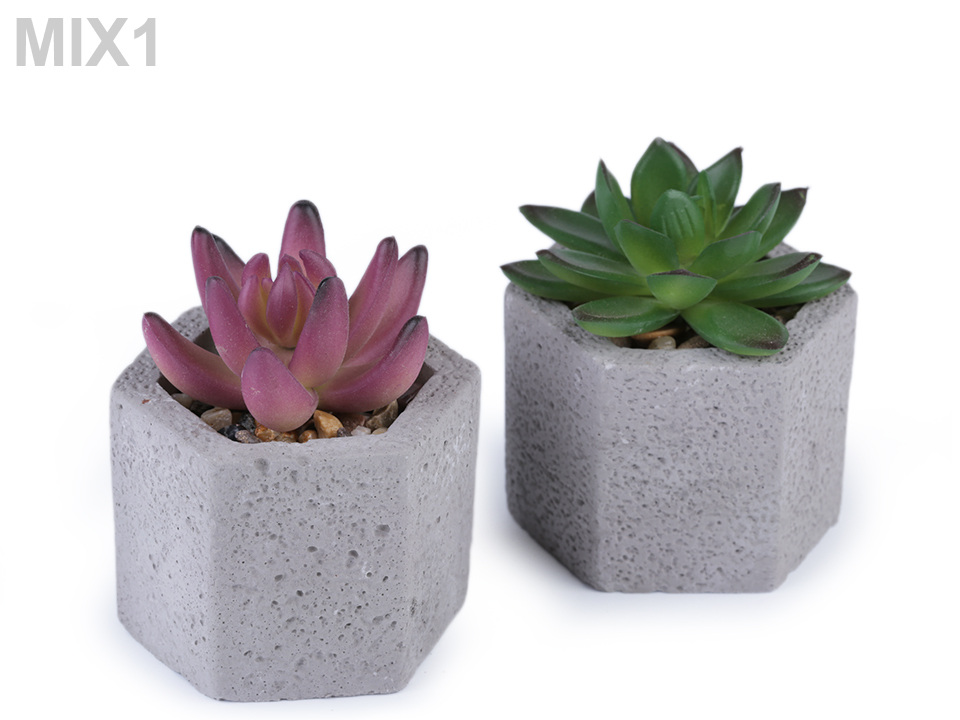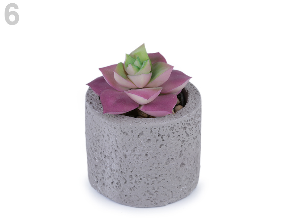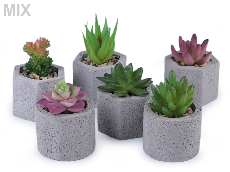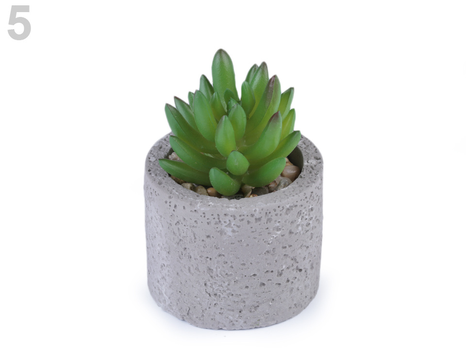 Umělé sukulenty jsou ve stylovém betonovém květináči. Vnitřní část květináče je pokryta přírodními kamínky. Sukulenty věrně kopírují svou živou předlohu. Můžete je mezi sebou vzájemně kombinovat. Doladí jakýkoli interiér.