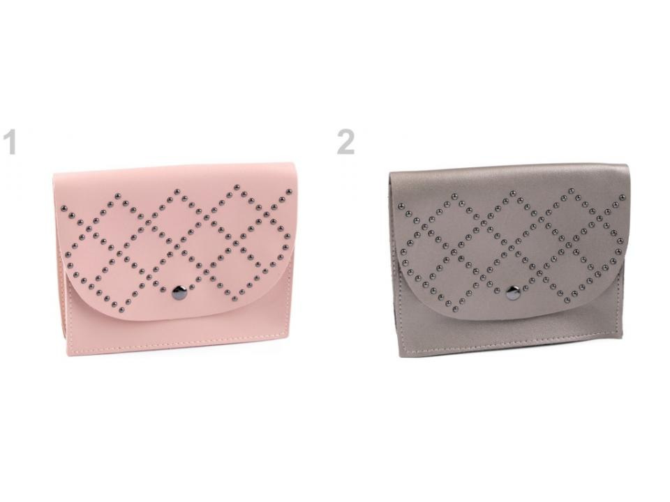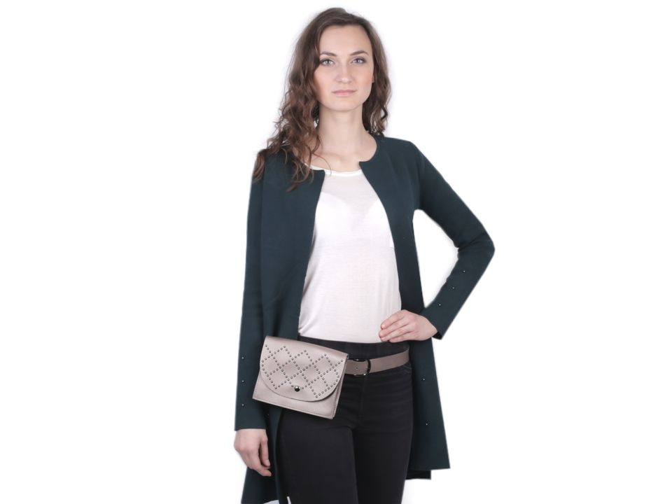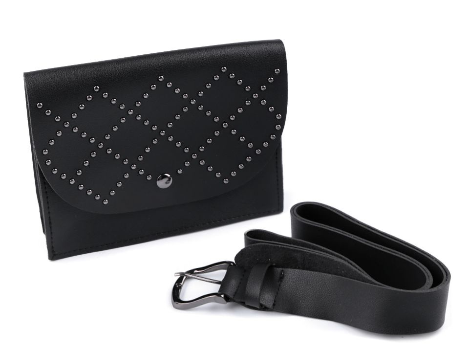Kabelka na opasku bude nevšedním doplňkem vašeho outfitu. Oproti ledvince se jedná o elegantnější verzi praktického módního doplňku, který vám umožní uložení základních věcí potřebných pro rychlé vyběhnutí do města, obchodu nebo jen tak na procházku. Přední stranu kabelky zdobí geometrický ornament složený z drobných cvočků. Tašku je možné nosit také v ruce jako psaníčko.