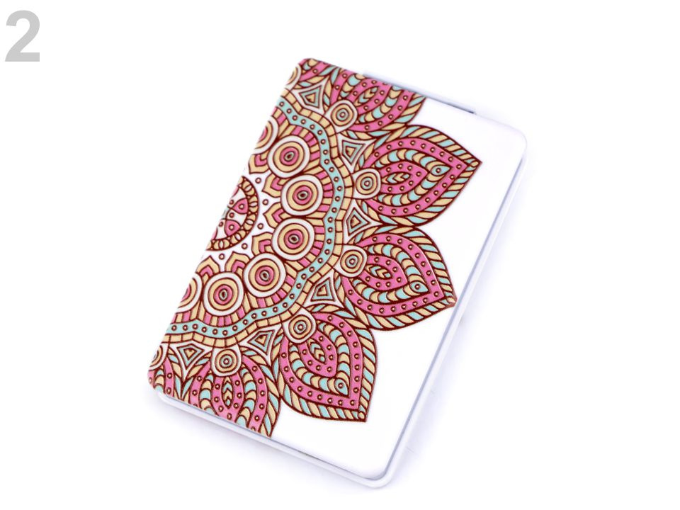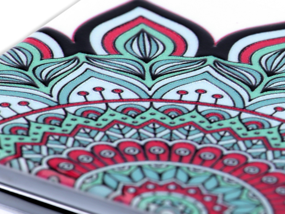 Otevírací zrcátko s reliéfním potiskem mandaly vás potěší každý den. Je výborným pomocníkem pro opravu make-upu. Je ploché, ideální na nošení v kabelce. Má kvalitní zpracování. Uvnitř jsou 2 zrcátka, jedno je zvětšovací.