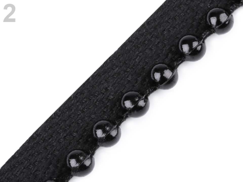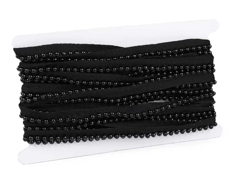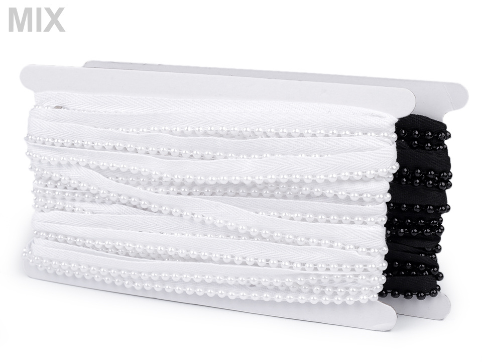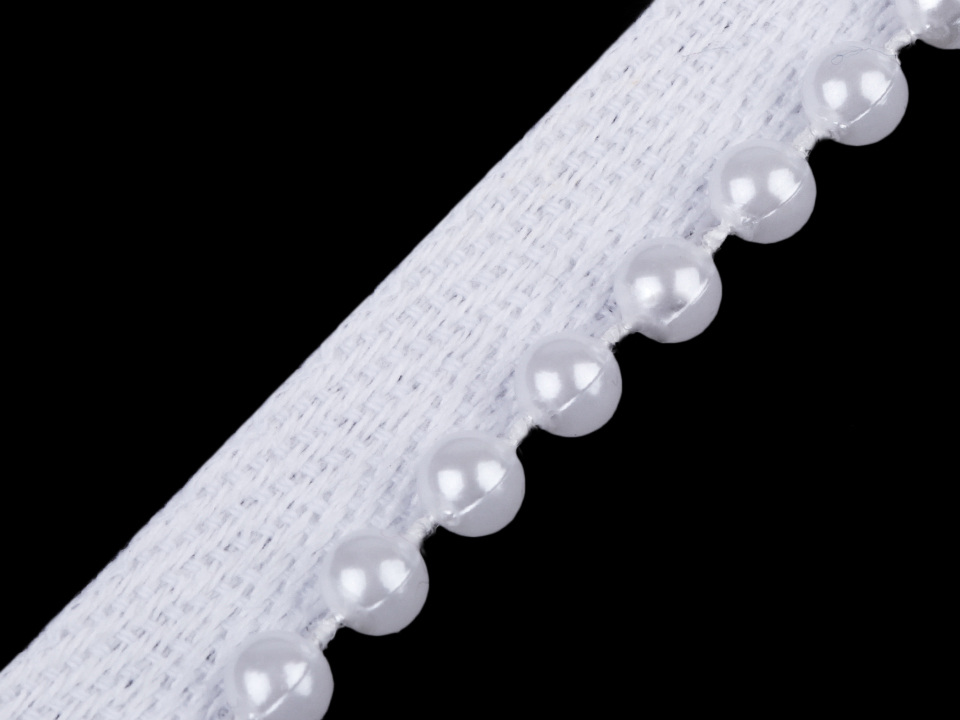 Prýmek s perlami váš oděv zjemní a dodá mu nádech elegance. Jednotlivé perly jsou přišité monofilovou nití k jemně lesklé bavlněné keprovce. Vyniknou na halenkách, sukních či kostýmcích.