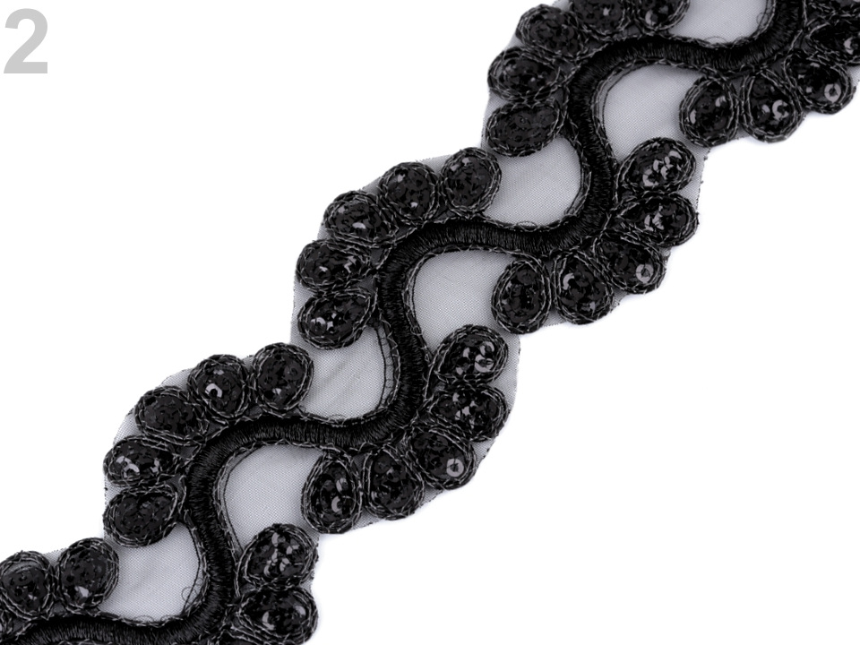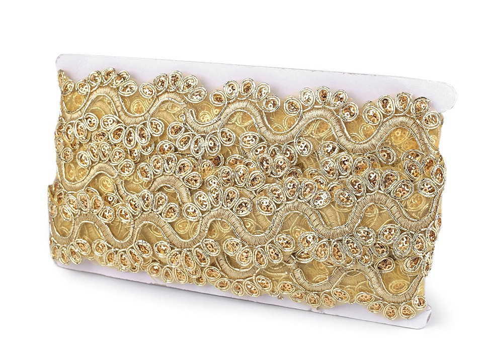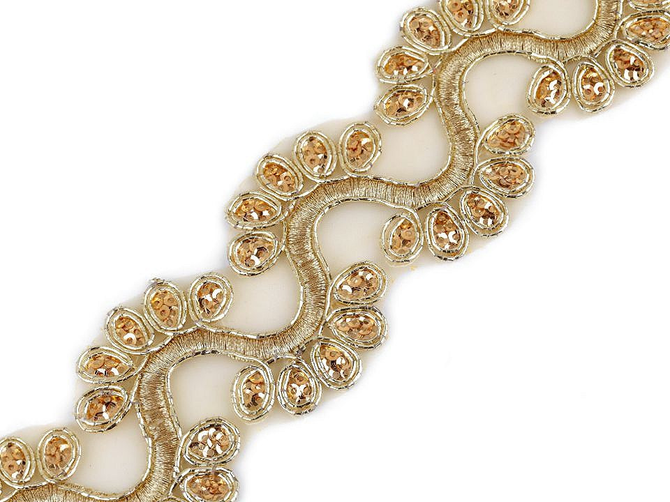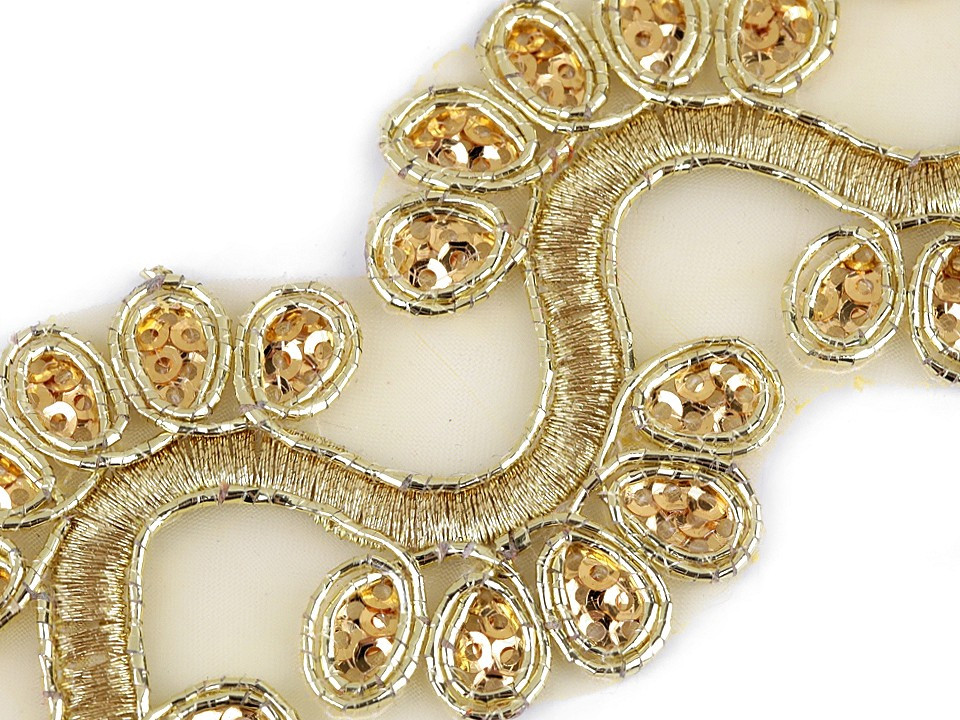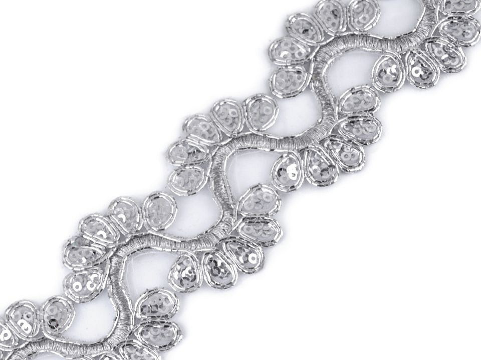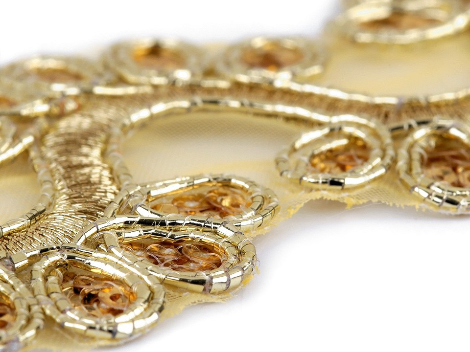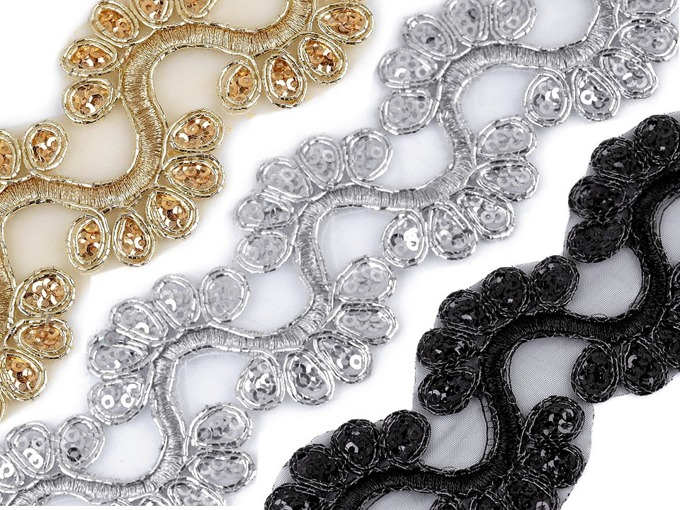 Prýmek na monofilu zdobí výšivka, která se elegantně třpytí díky lurexovým vláknům a drobným flitrům. Prýmek využijete ke zdobení společenských a plesových šatů, halenek nebo kostýmů. Můžete ho použít do dekoltů, na lemy, apod. Je také vhodný k oživení psaníček nebo bytového textilu.