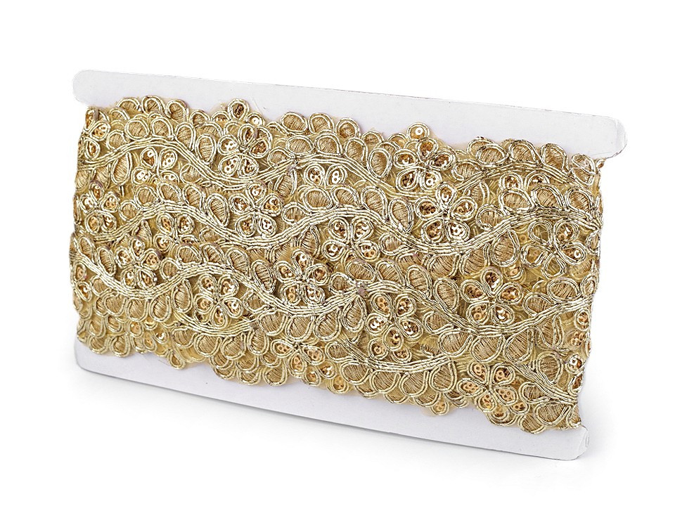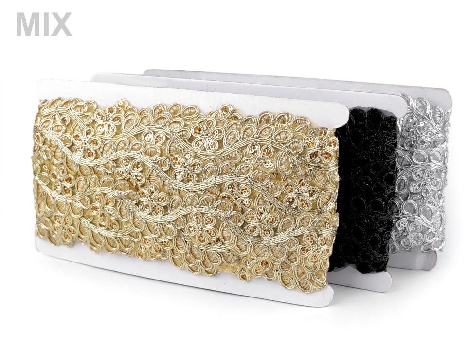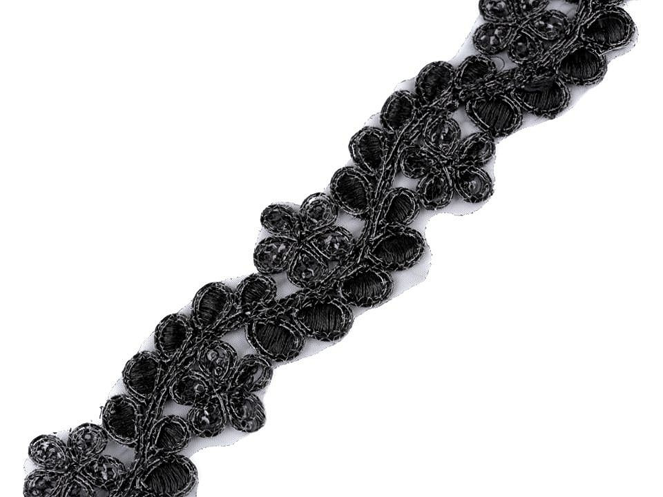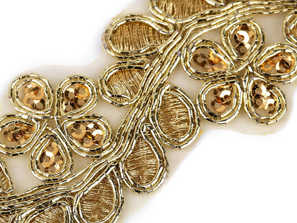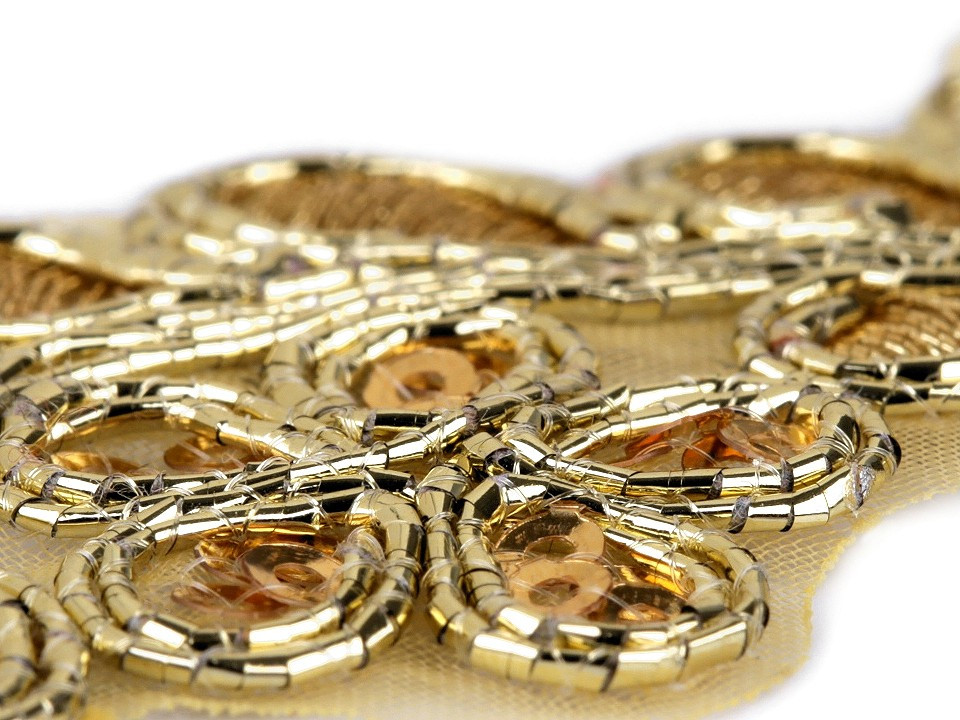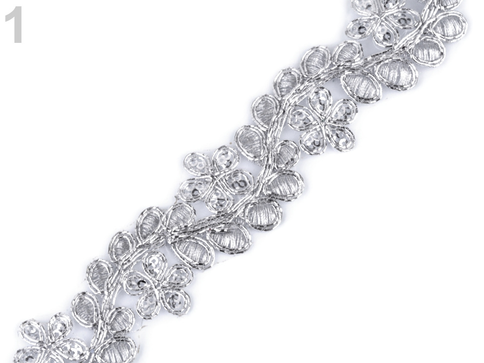 Prýmek na monofilu zdobí lesklá květinová výšivka s lurexem. Jednotlivé okvětní lístky jsou vyplněny drobnými flitry. Prýmek využijete ke zdobení společenských a plesových šatů, halenek nebo kostýmů. Můžete ho použít na lemy, do dekoltů apod. Je vhodný také k oživení psaníček, bolerek, nebo bytového textilu.