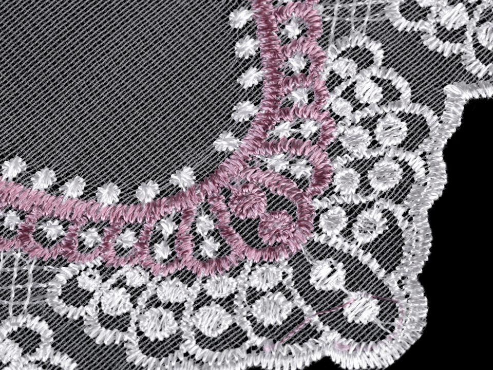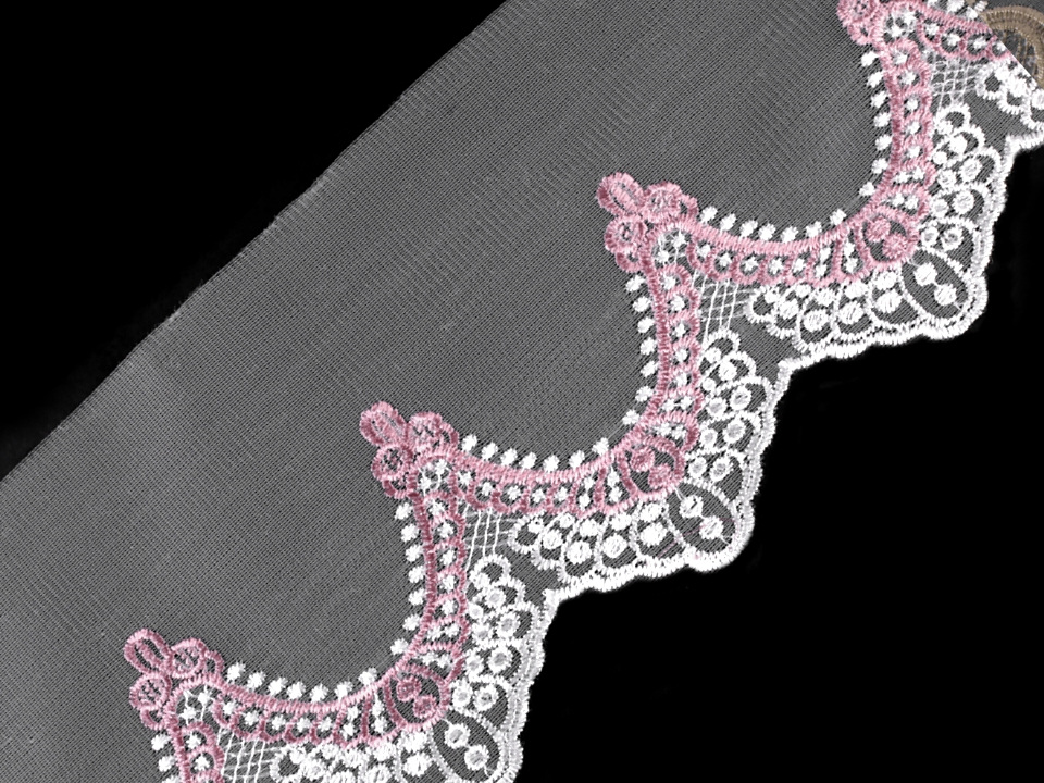 Prýmek na monofilu je vyšívaný. V jeho dolní části jej zdobí jemné ornamenty ve tvaru obloučků. Prýmek můžete použít k ozdobení šatů, sukní, kostýmů nebo bytového textilu.