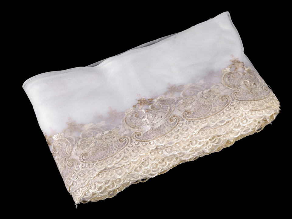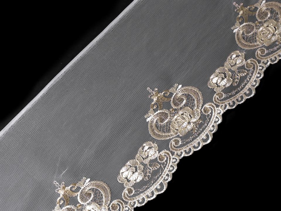 Prýmek na monofilu je vyšívaný. V jeho dolní části jej zdobí ornamenty ve tvaru obloučků s květinovým motivem. Prýmek můžete použít k ozdobení šatů, sukní, kostýmů nebo bytového textilu.