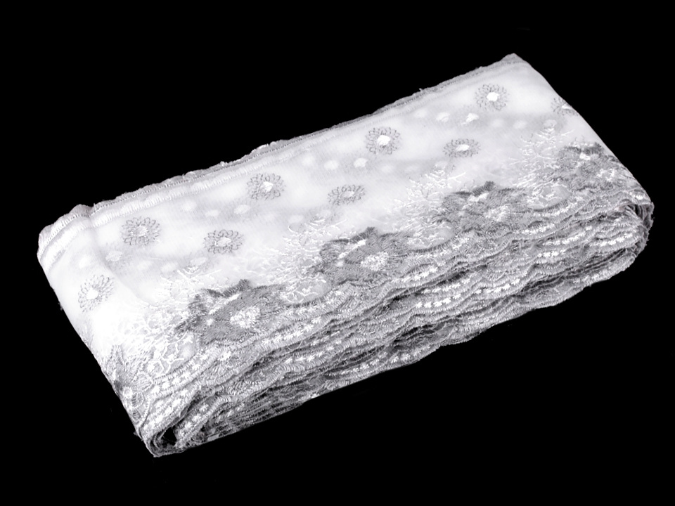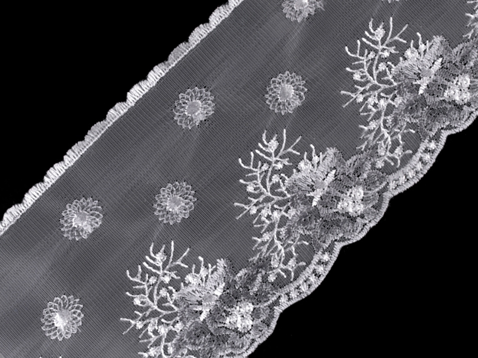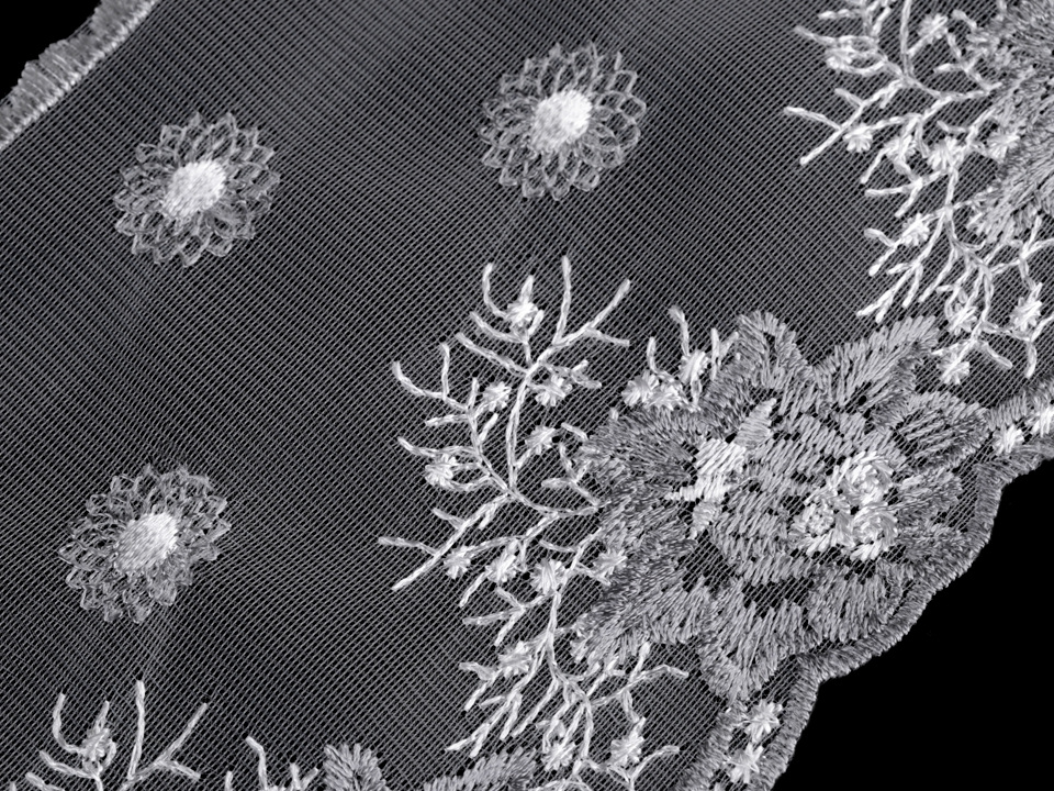 Vyšívaný prýmek na monofilu je ozdobený květinovým motivem. Ze spodní i vrchní strany je vyšitý do tvaru obloučků. Prýmek můžete použít k ozdobení šatů, sukní, kostýmů nebo bytového textilu.