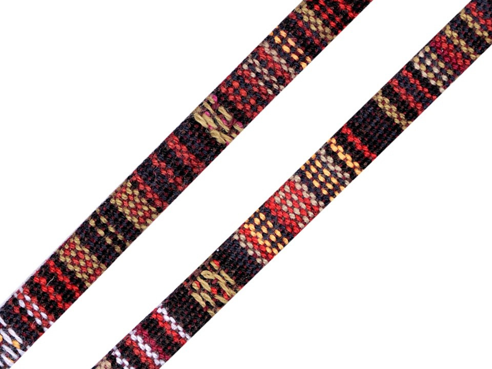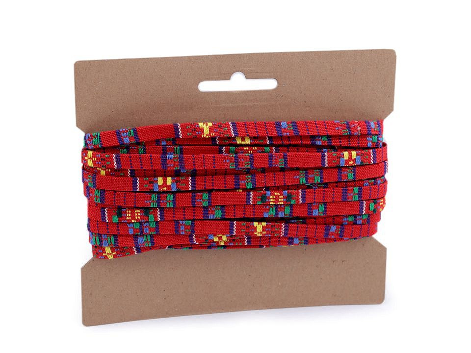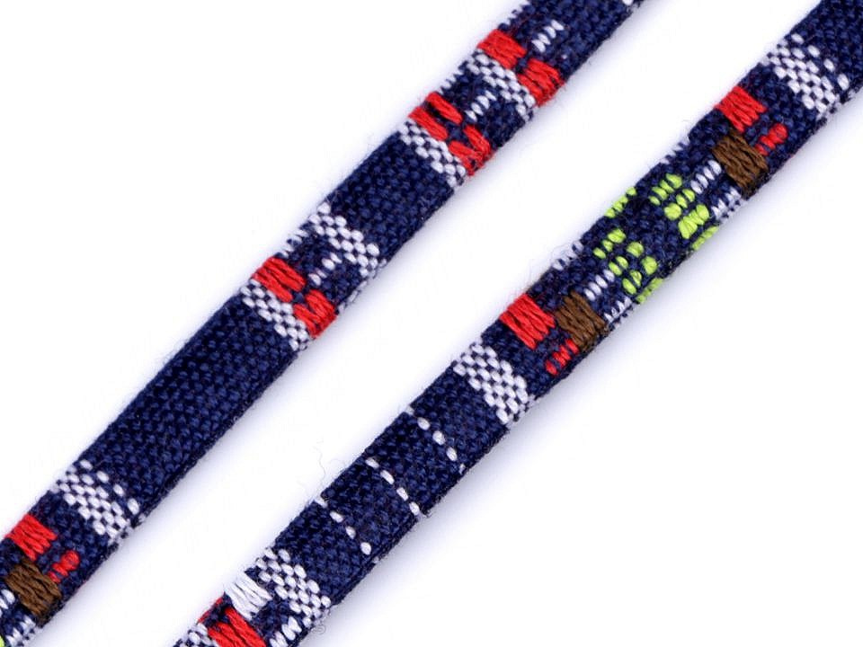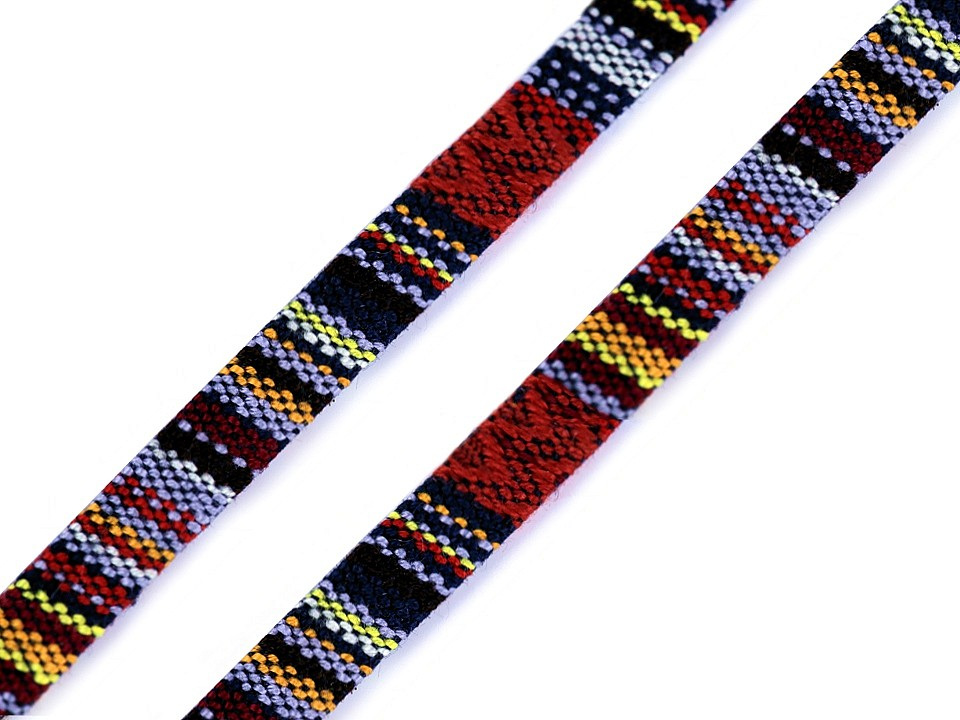 Pevná plochá šňůra vás zaujme svým barevným indiánským vzorem. Uplatnění najde v textilní galanterii ale také při výrobě dekorací. Nevšedně s ní ozdobíte, boty, klobouky nebo tašky. Využijete ji také do tunýlků kapucí mikin, kalhot či bund.