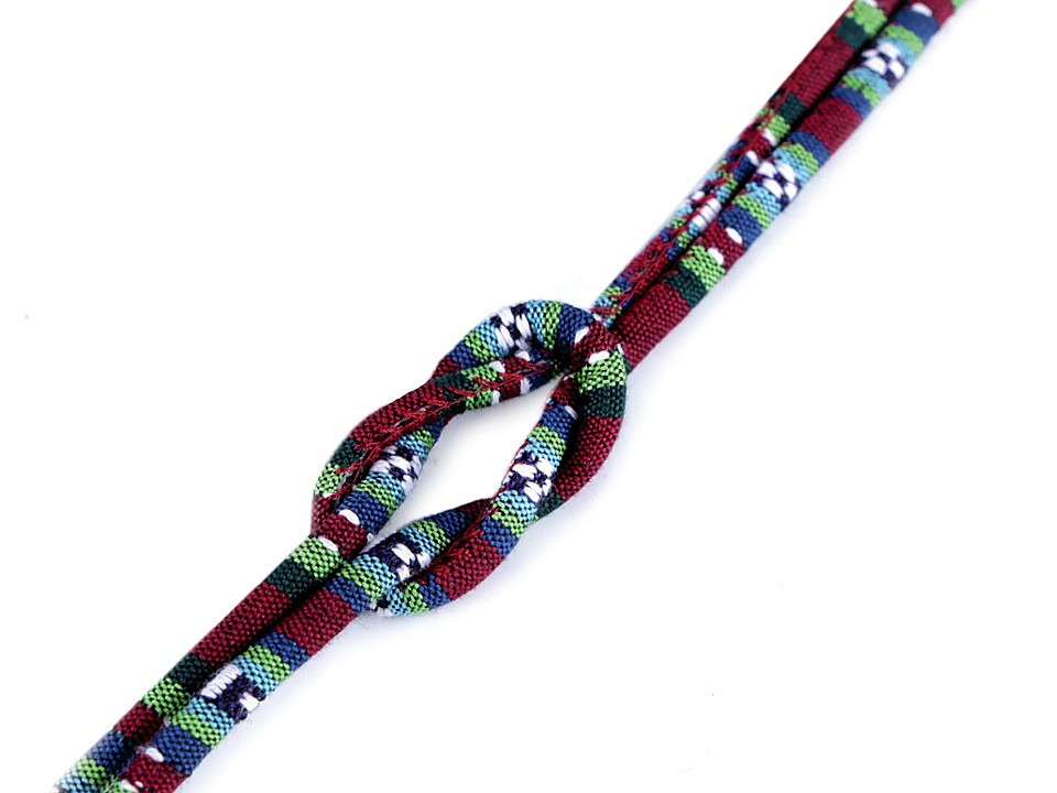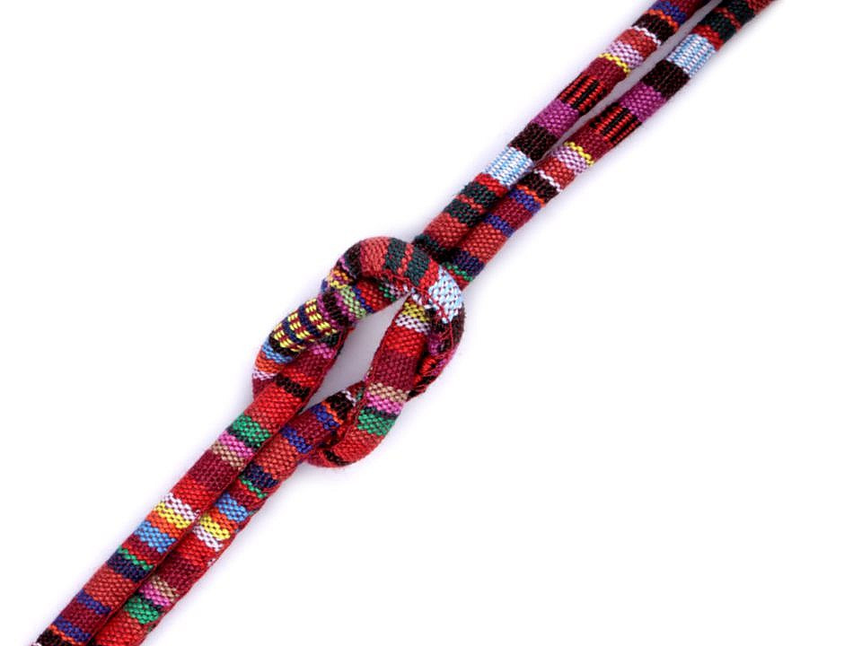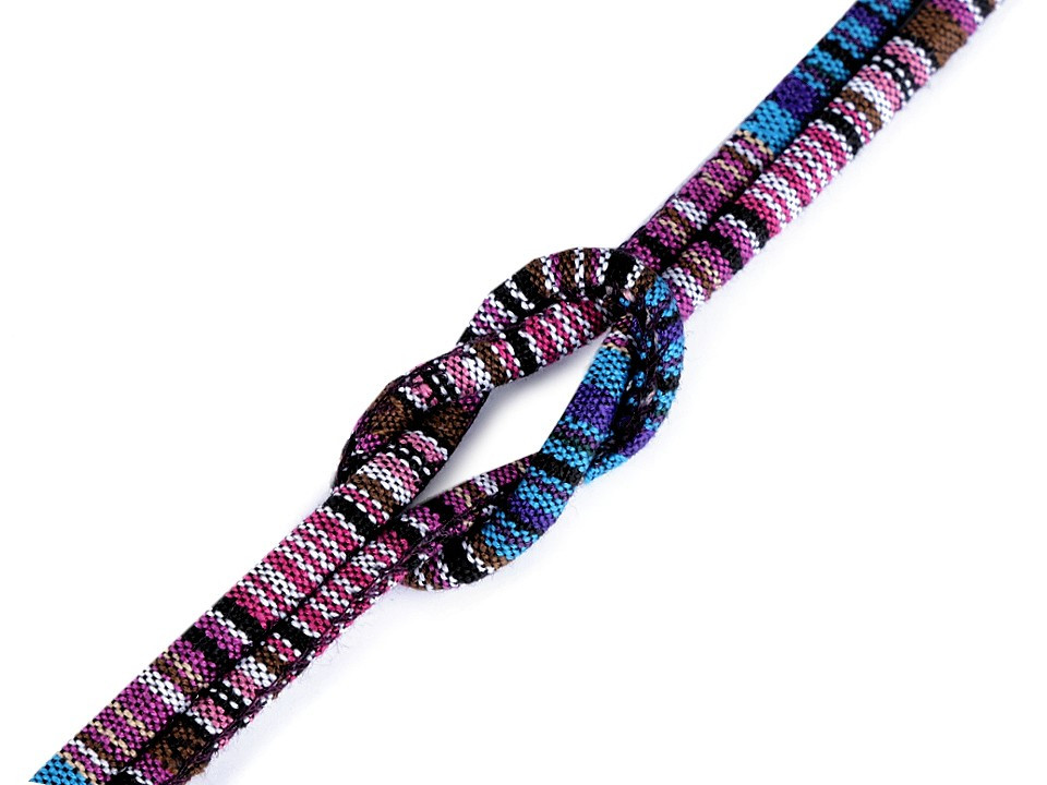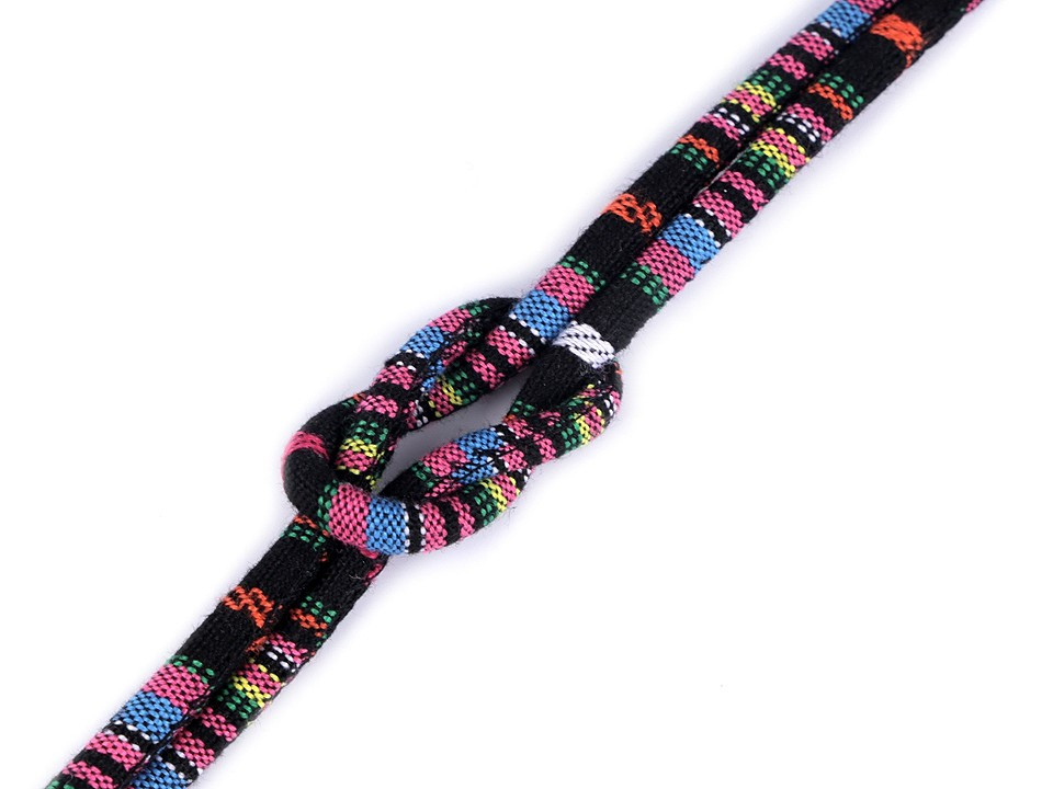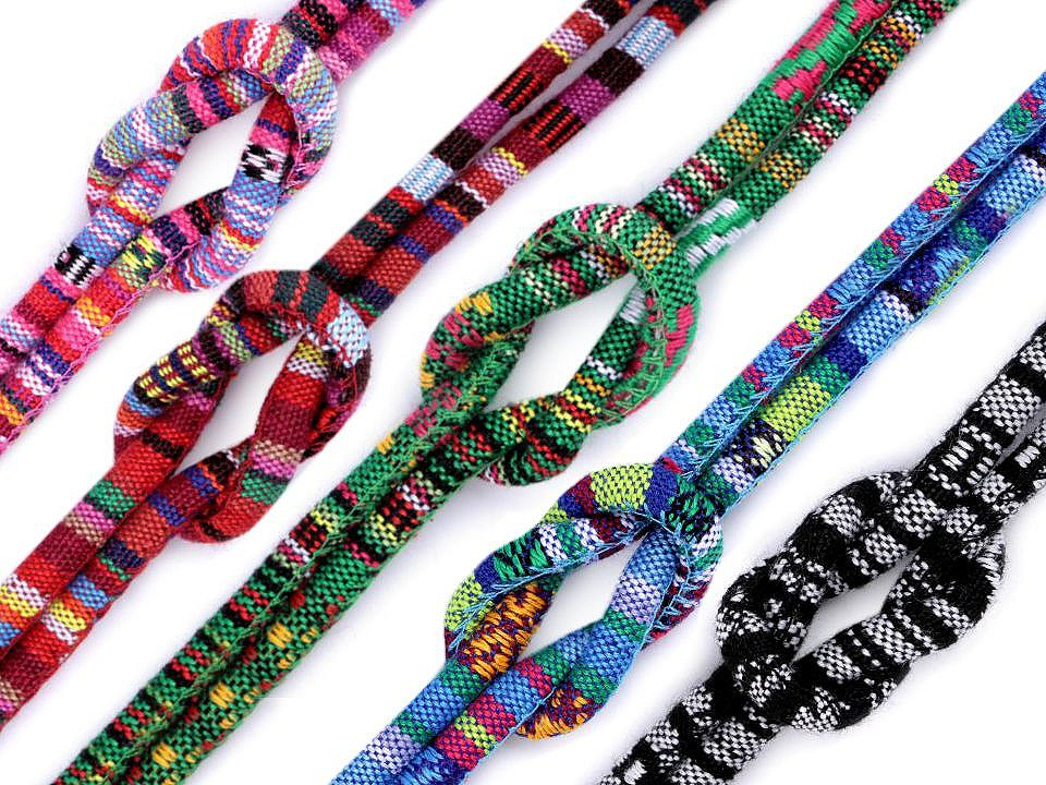 Barevnou šňůru s indiánským motivem a výplní využijete do tunýlků mikin, kalhot nebo bund, nebo jako nevšední ozdobu oděvů či obuvi. Vytvoříte z něj jednoduchý trendy pásek, náhrdelník či náramek. Šňůra je pevná, skvěle se tak uplatní při výrobě vaků na záda nebo tašek.