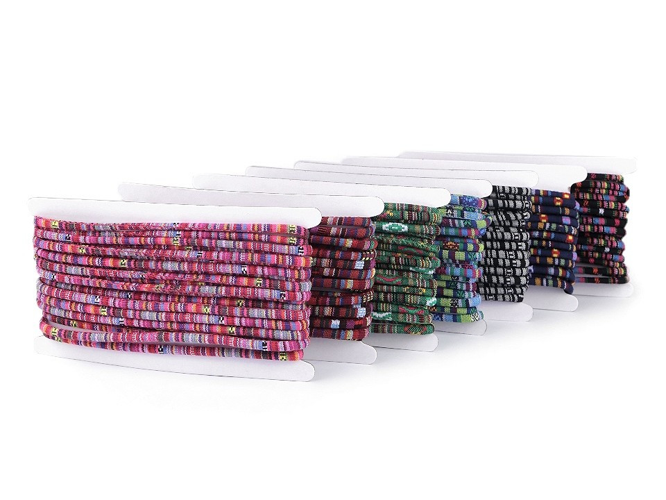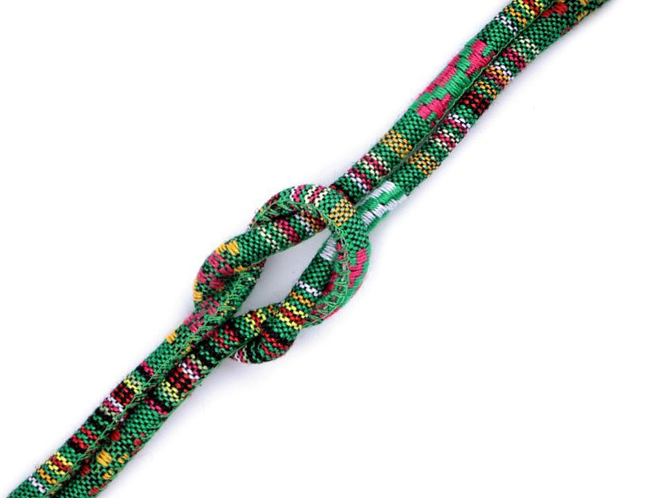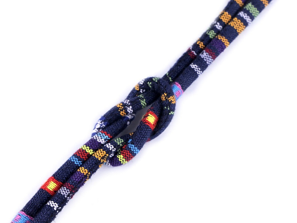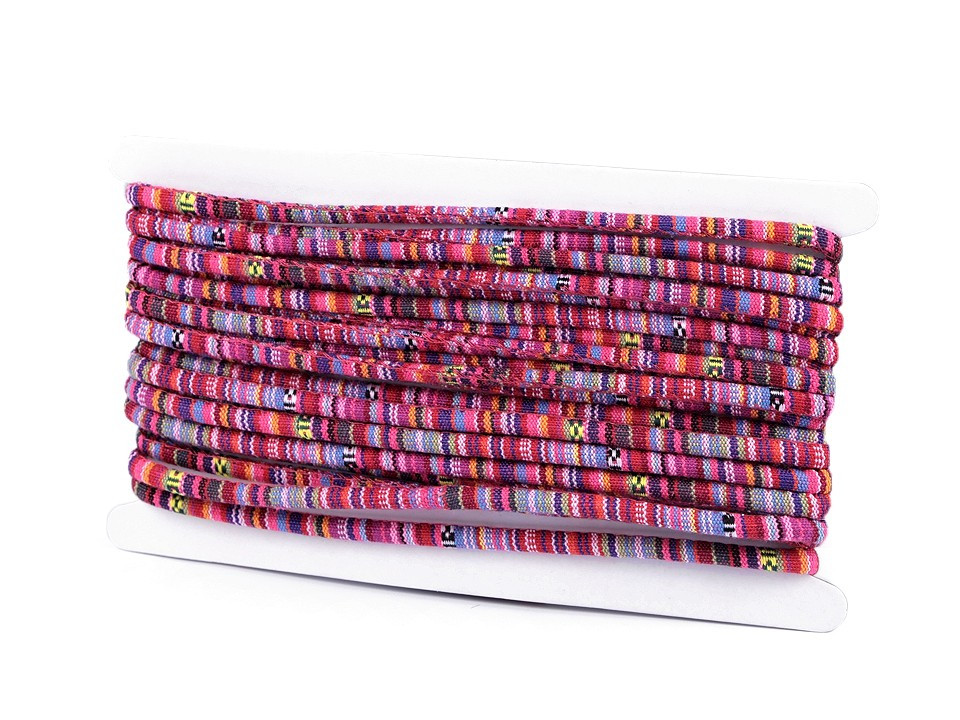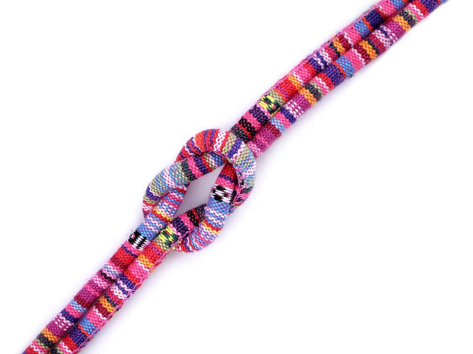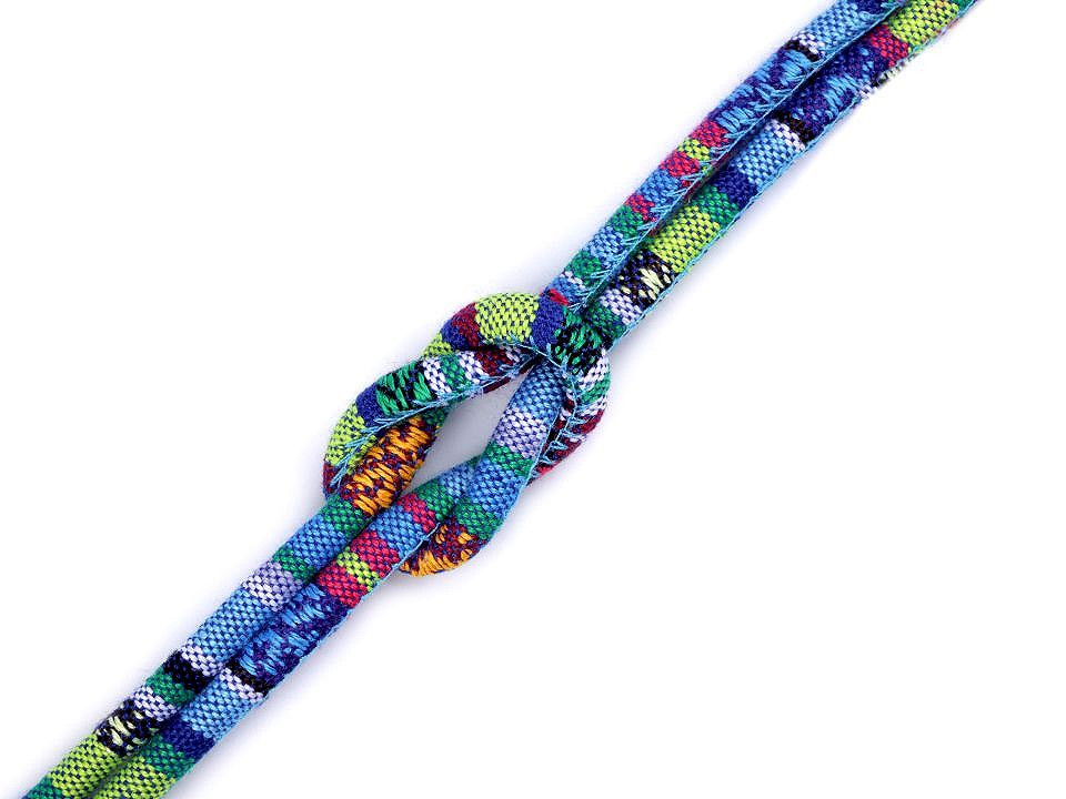 Barevnou šňůru s indiánským motivem a výplní využijete do tunýlků mikin, kalhot nebo bund, nebo jako nevšední ozdobu oděvů či obuvi. Vytvoříte z něj jednoduchý trendy pásek, náhrdelník či náramek. Šňůra je pevná, skvěle se tak uplatní při výrobě vaků na záda nebo tašek.