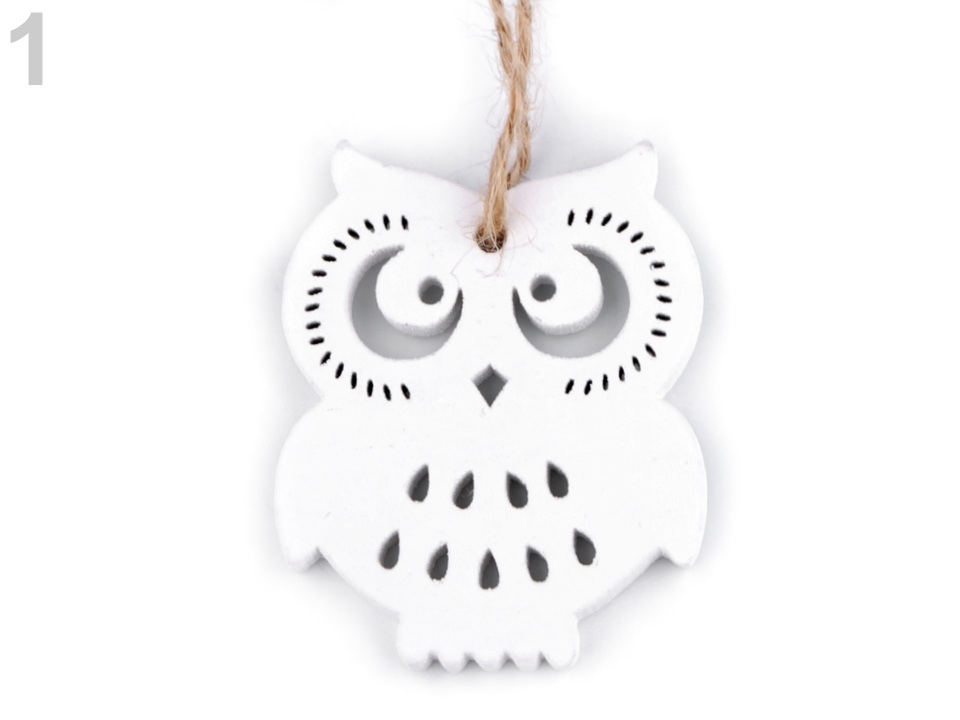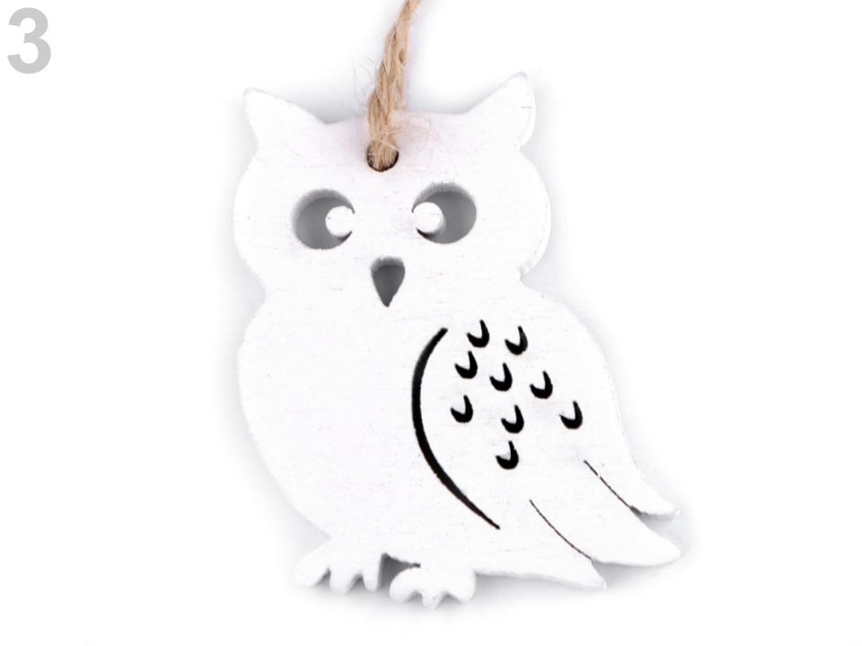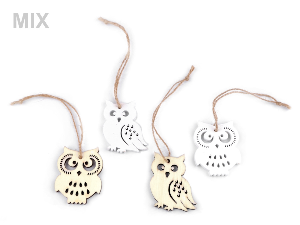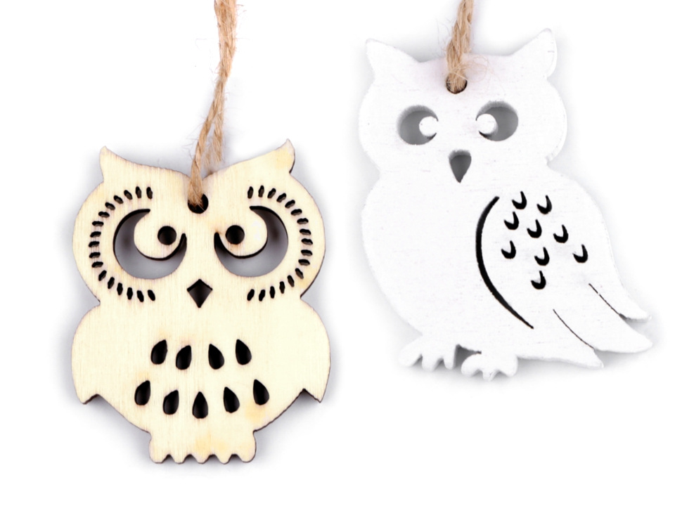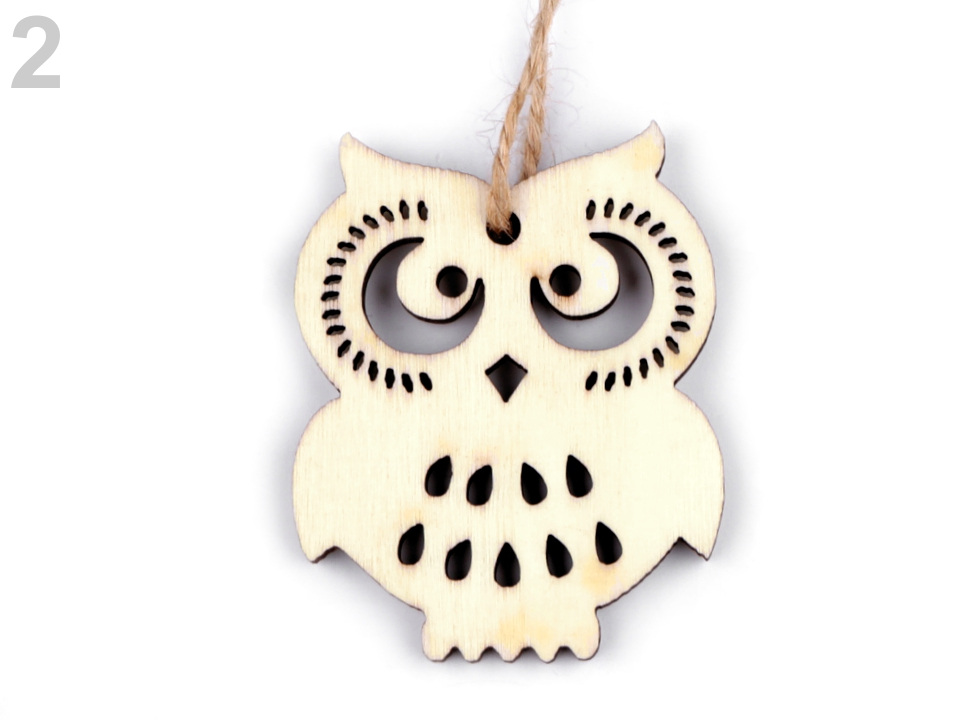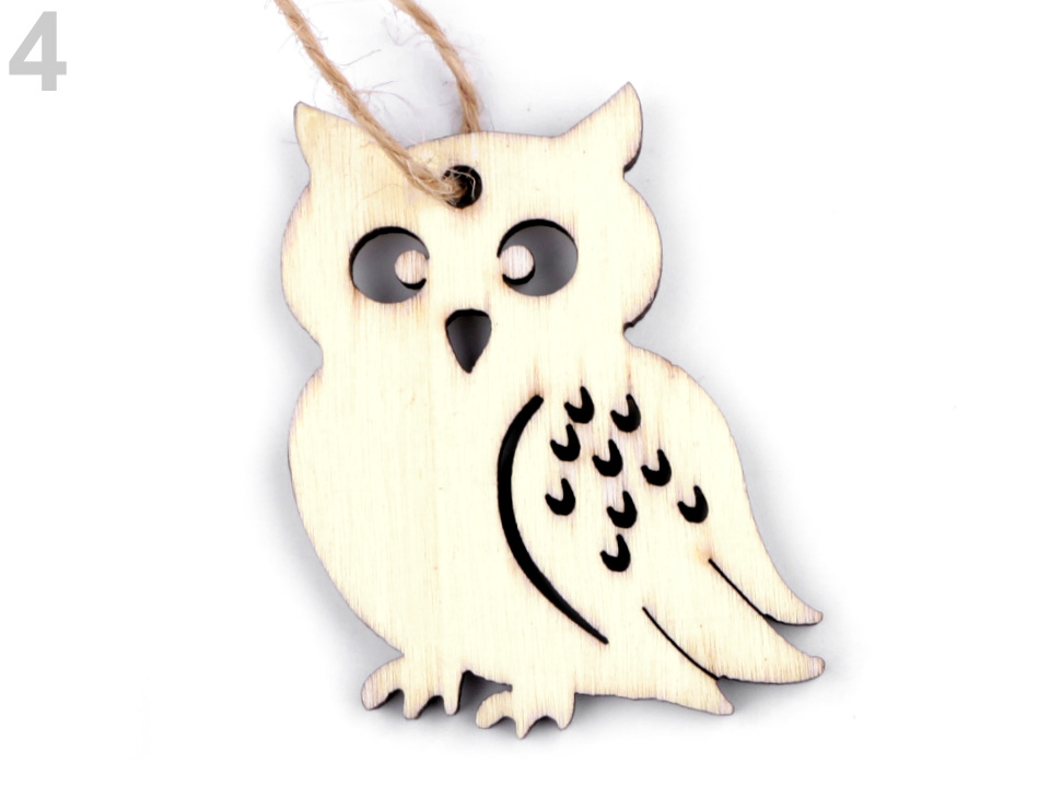Dřevěná dekorace sova na jutovém provázku se hodí na ozdobení dárků, lahví, věnců nebo květináčů. Zajímavě vynikne také na větvičkách ve váze či zakomponovaná v květinových vazbách.