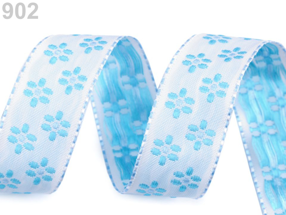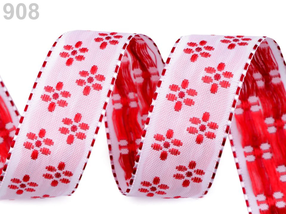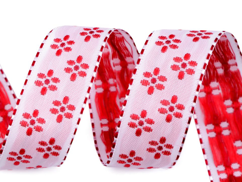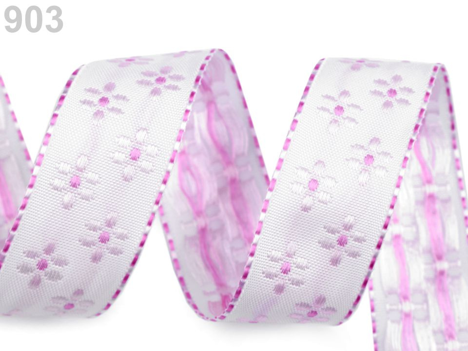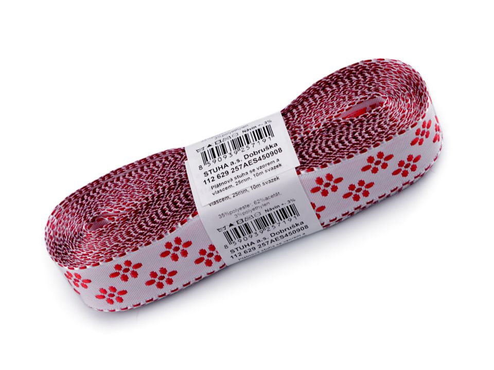 Plátnovou stuhu s vlascem zdobí vzor květů. Je pevná a velmi kvalitní. Díky vlascům po stranách se dá pohodlně rovnoměrně nařasit. Květinový vzor je jednostranný.