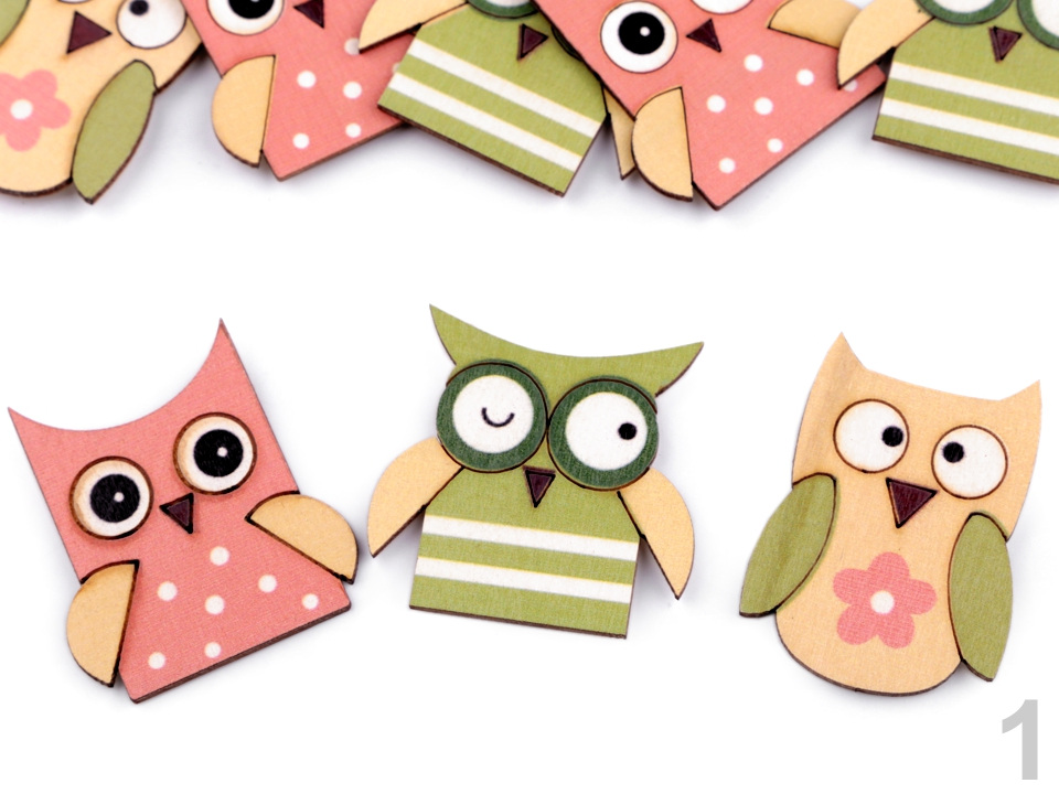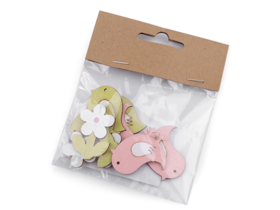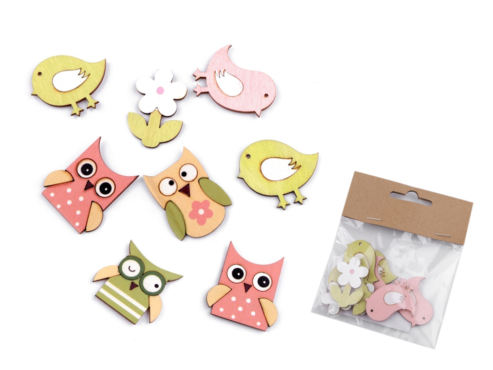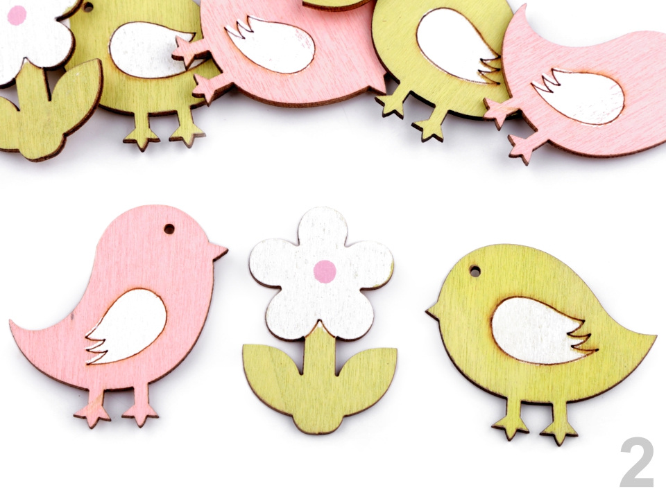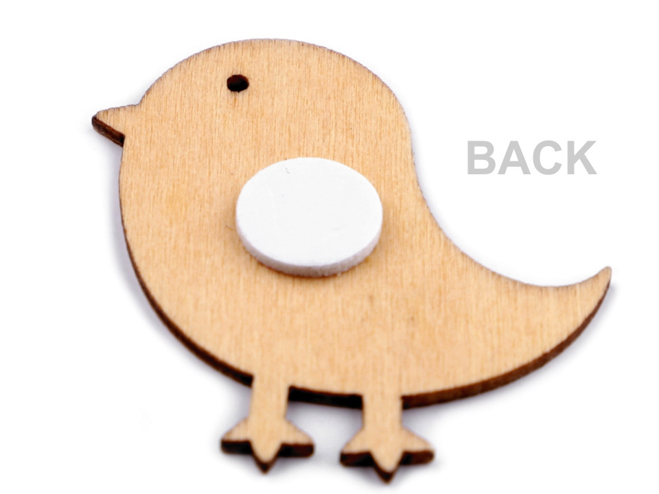 Dřevěné ozdoby se budou skvěle vyjímat na jarních a velikonočních věncích, květinových vazbách, větvičkách či jiných dekoracích. Na zadní straně mají samolepicí plochu o průměru 1 cm, lze je nalepit také na krabičky, dárky, přání, apod.