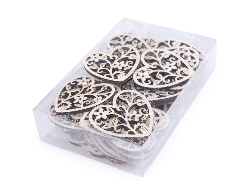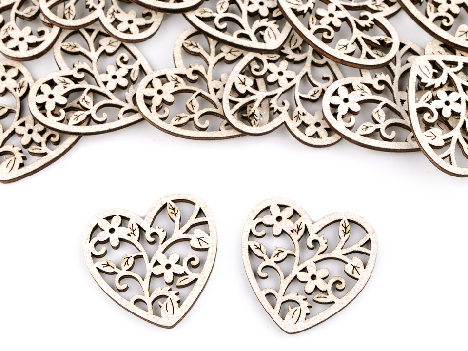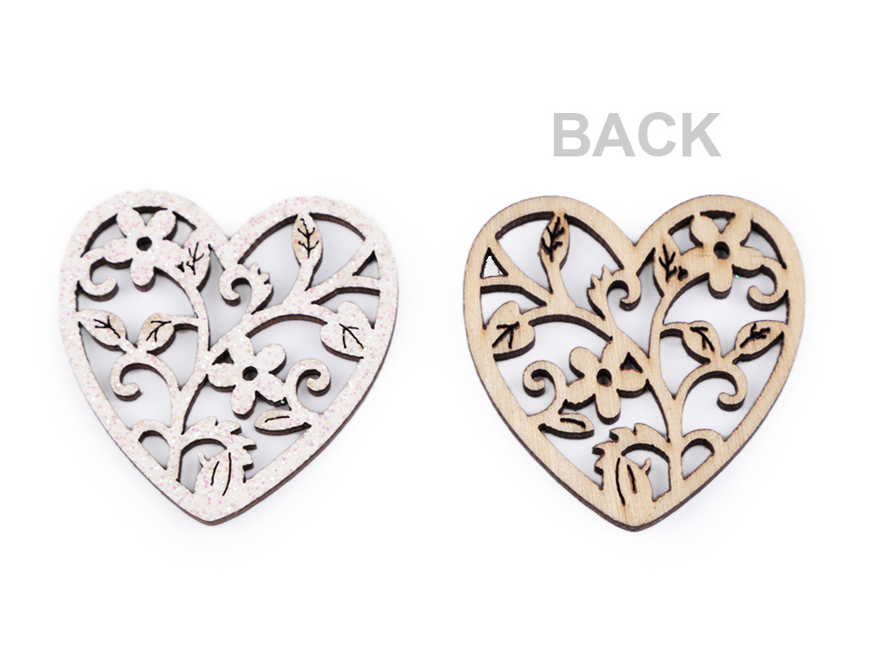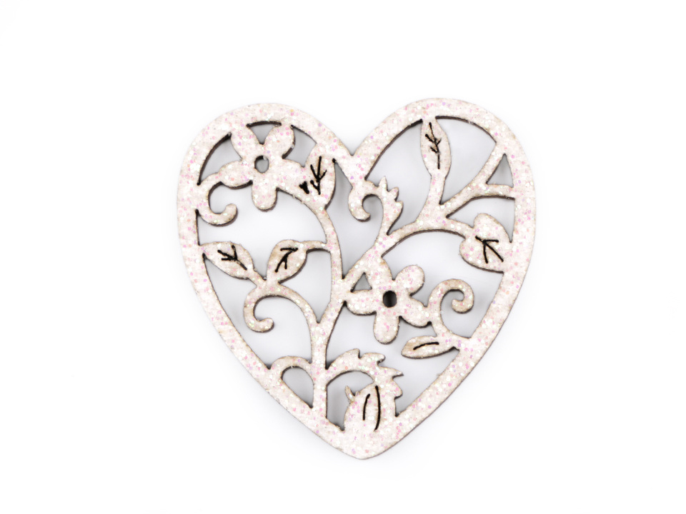 Dřevěné srdíčko okouzlí svým filigránovým výřezem s motivem květů. Zajímavý vzhled dotváří také třpytivé glitry s AB efektem, které jsou na jedné straně srdíčka. Dekorace romanticky doladí svatbu, věnce i květinové vazby.