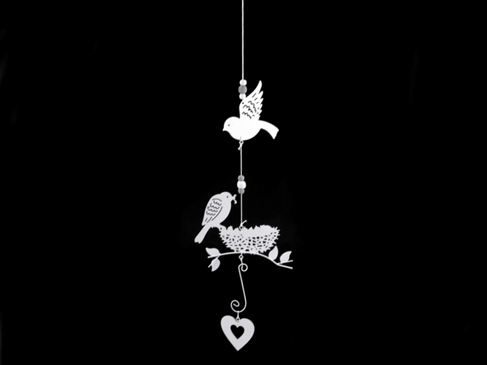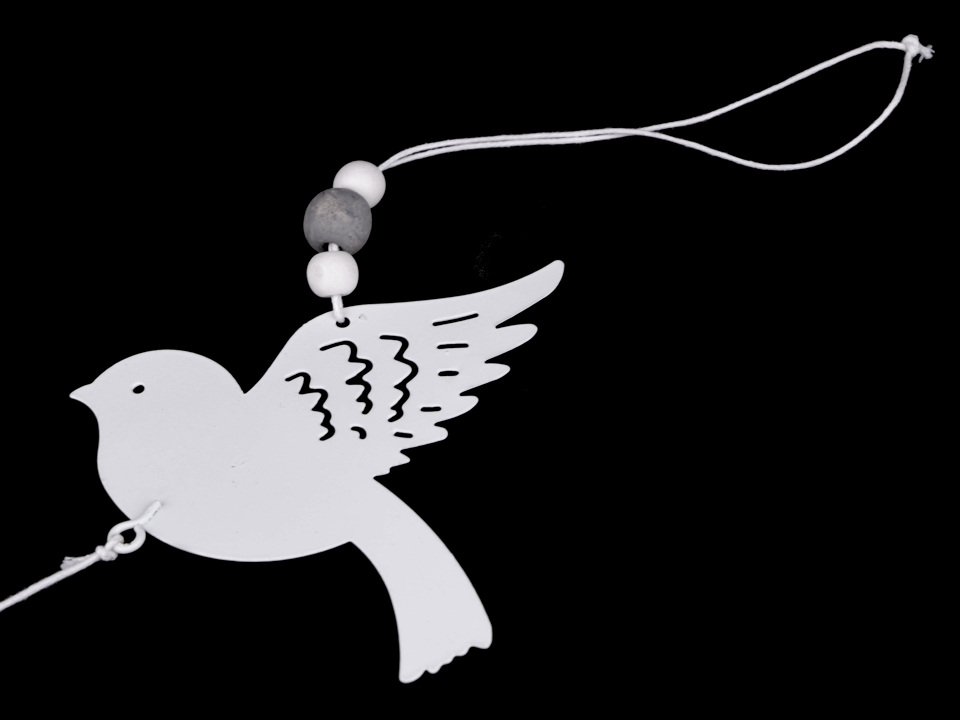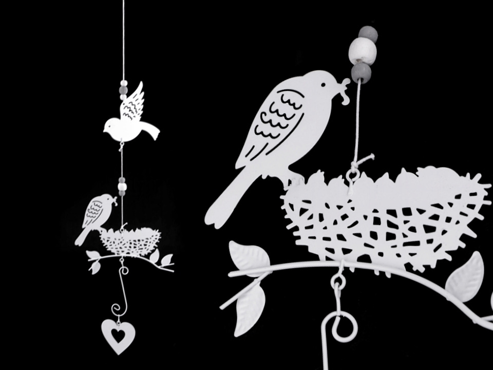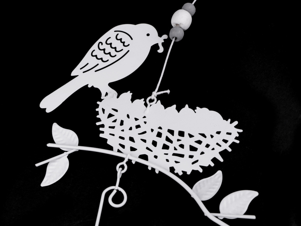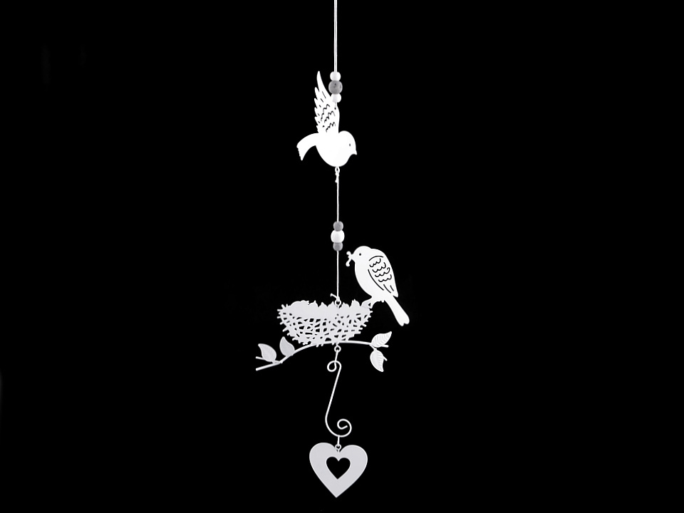 Kovová dekorace s ptáčky vynikne v interiéru jako zajímavý prvek. Jednotlivé části jsou mezi sebou propojeny provázkem a dozdobeny korálky. Díky poutku můžete dekoraci kamkoli pověsit.