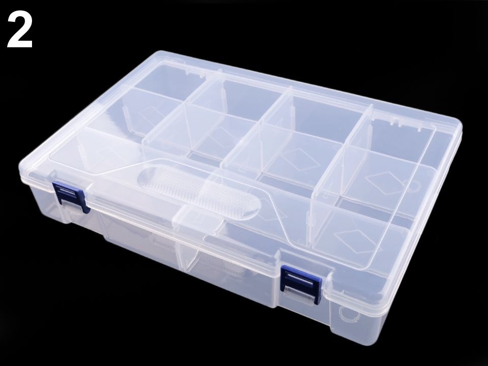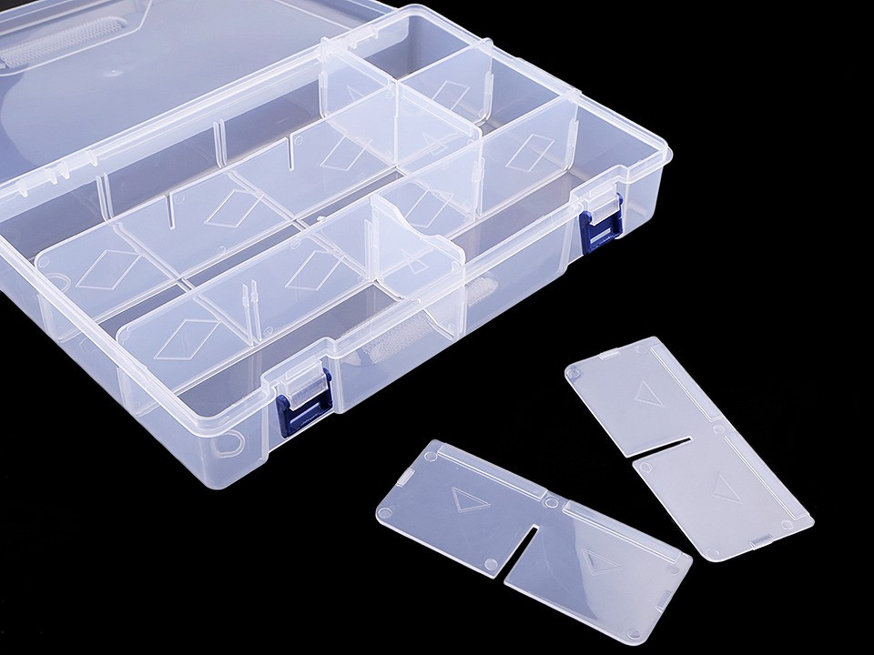 Plastový kufřík je praktickým pomocníkem na skladování drobného nářadí nebo různých potřeb a komponentů pro kreativní tvorbu a korálkování. Je vyrobený z průhledného plastu, má jednoduché pákové uzavírání. Přepážky jsou odnímatelné, přihrádky si můžete libovolně upravovat. Pokud odstraníte všechny přepážky, budete mít prostor velký 19 x 29 cm. Příklopné víko ochrání uskladněné předměty před prachem a jiným znečištěním.