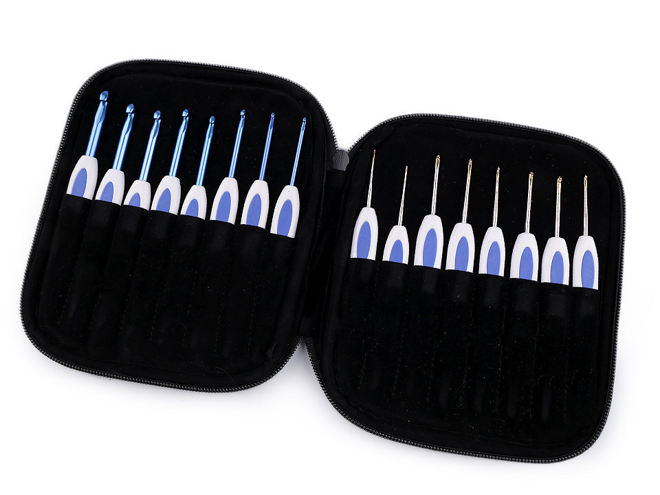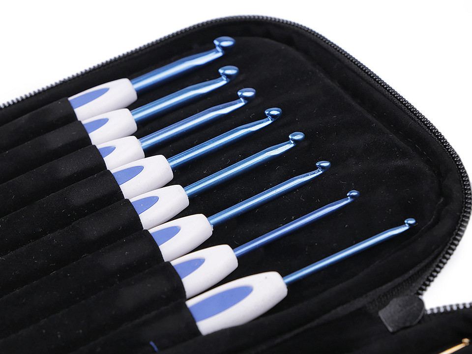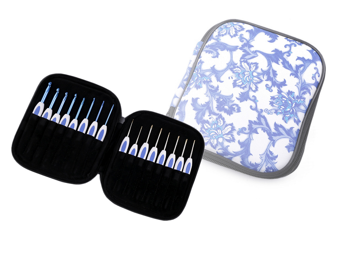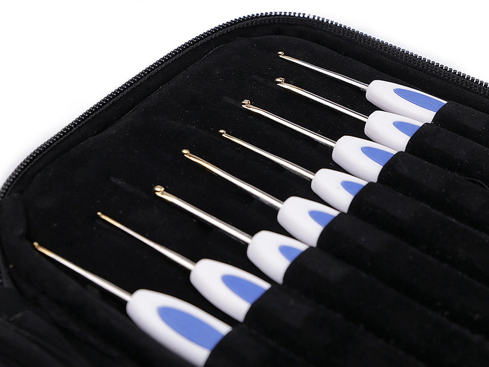 Sada háčků na háčkování je zabalena v pouzdře, které můžete snadno uzavřít pomocí zipu. Vnitřek pouzdra je sametový.
