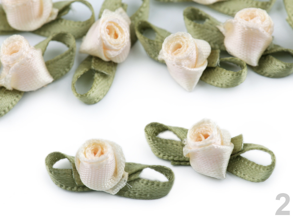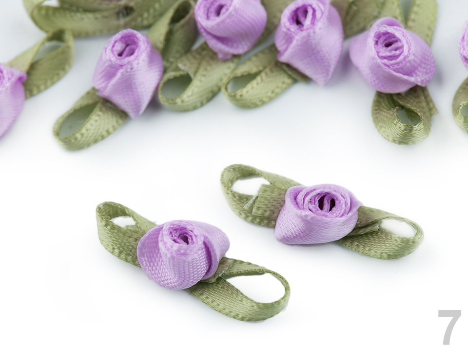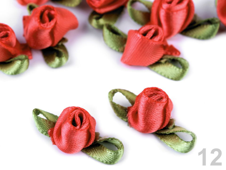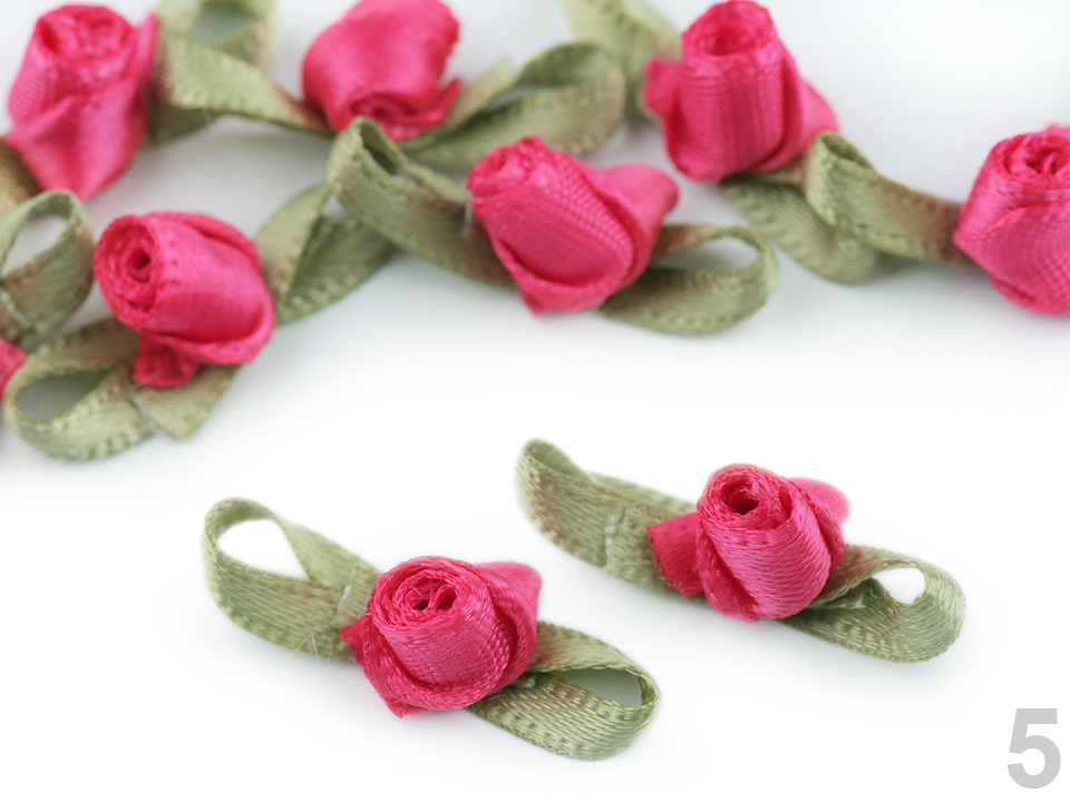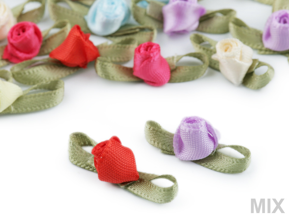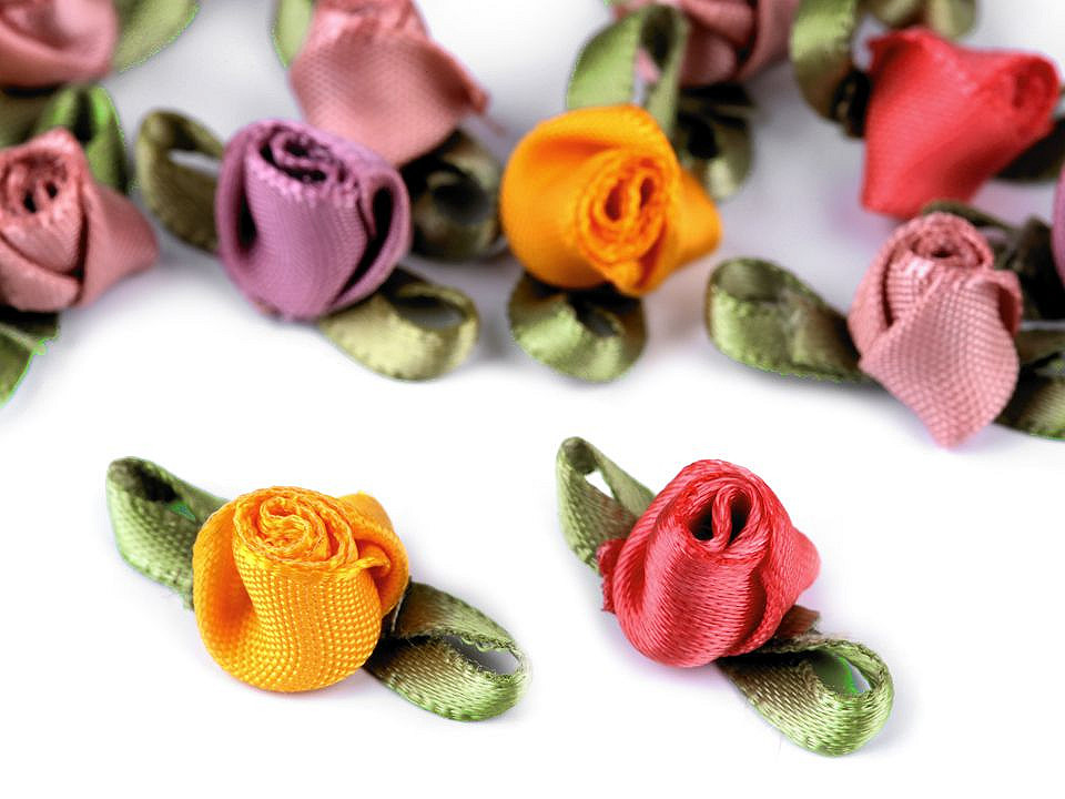 Malé textilní růžičky s lístky jsou vyrobené z jemně lesklé saténové stužky. Hodí se k přišití i k nalepení.