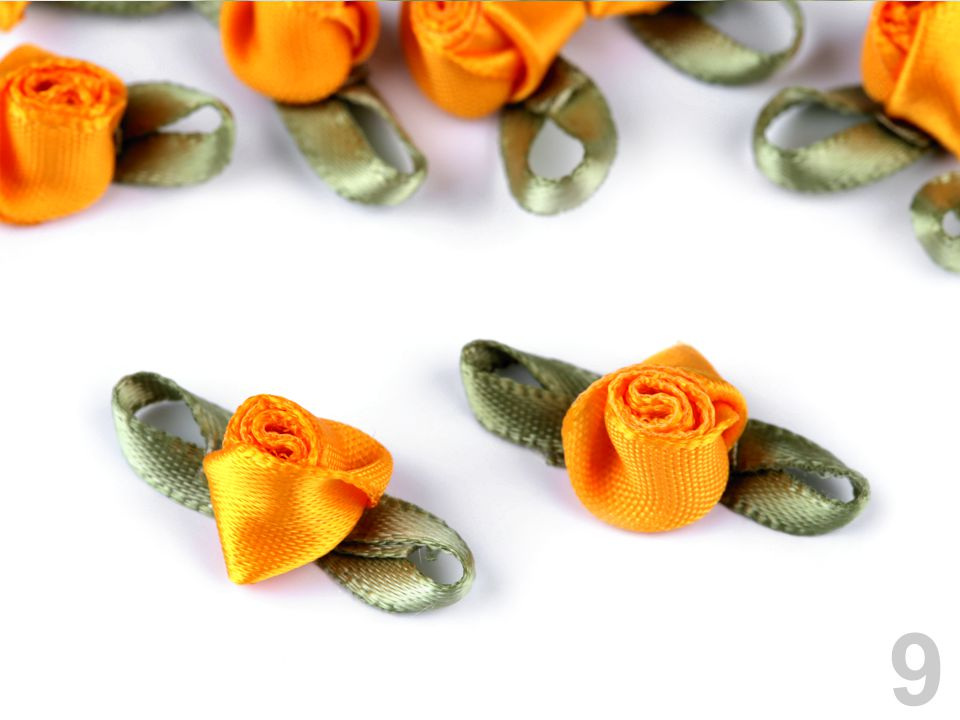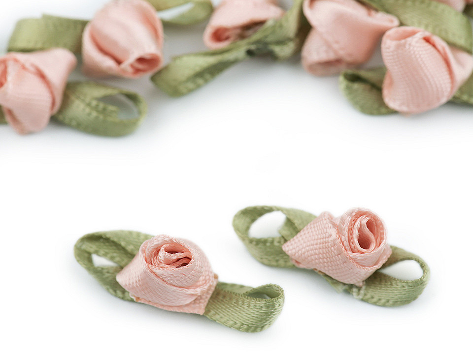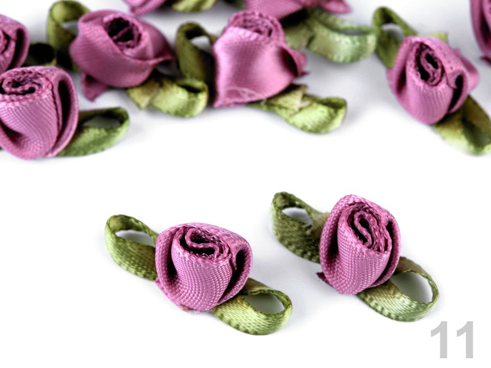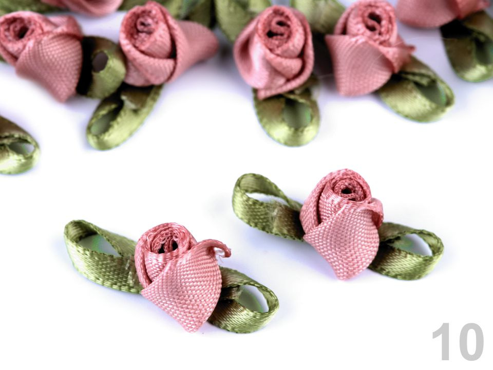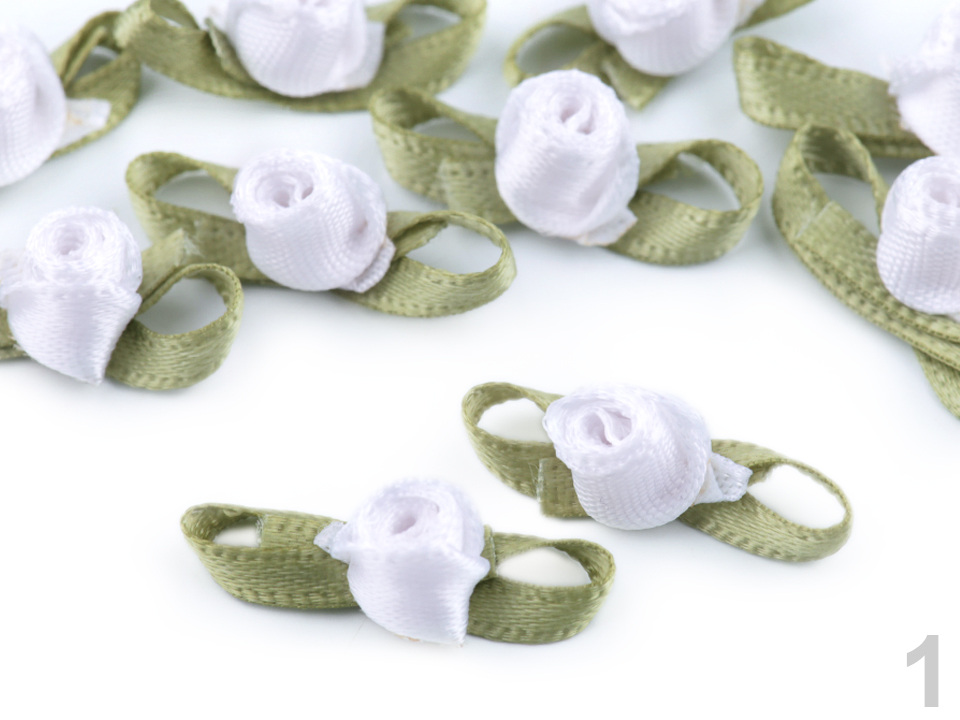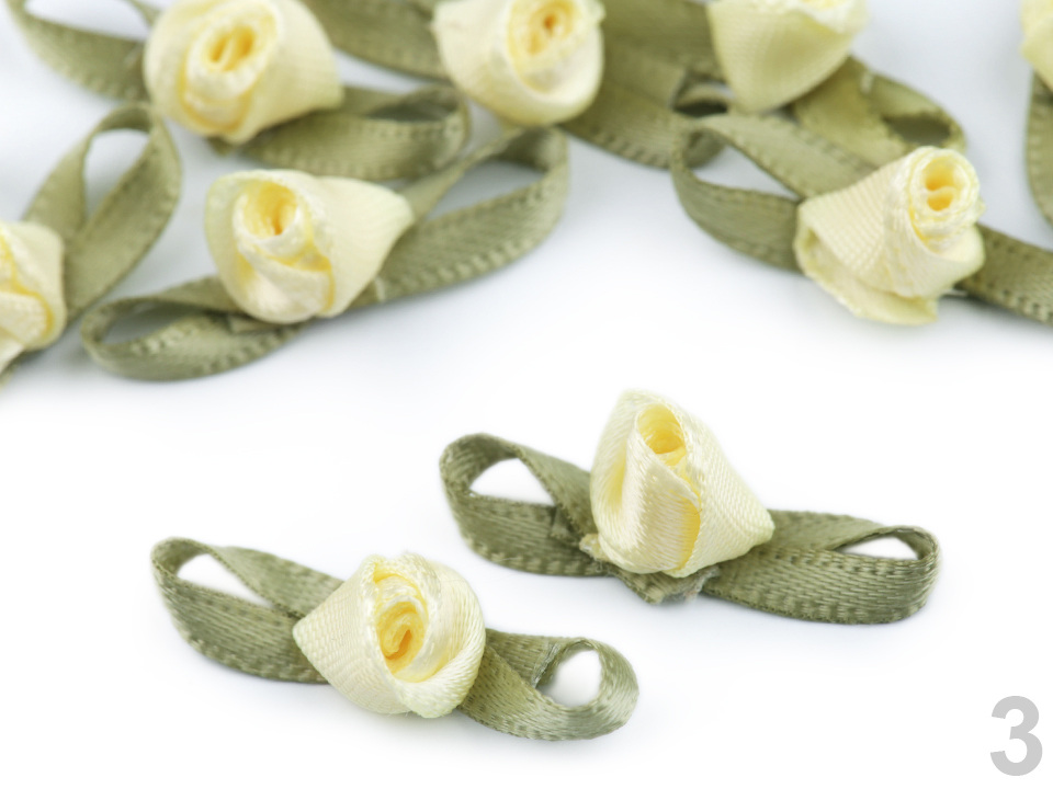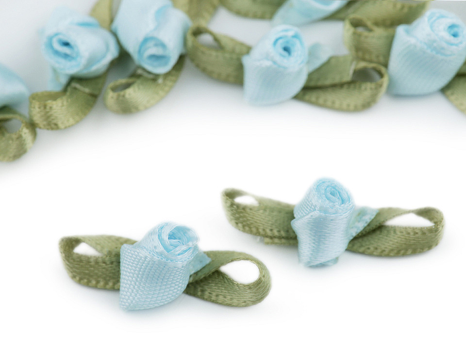 Malé textilní růžičky s lístky jsou vyrobené z jemně lesklé saténové stužky. Hodí se k přišití i k nalepení.