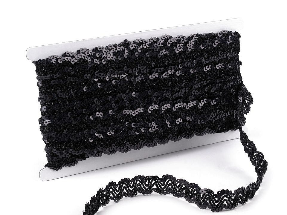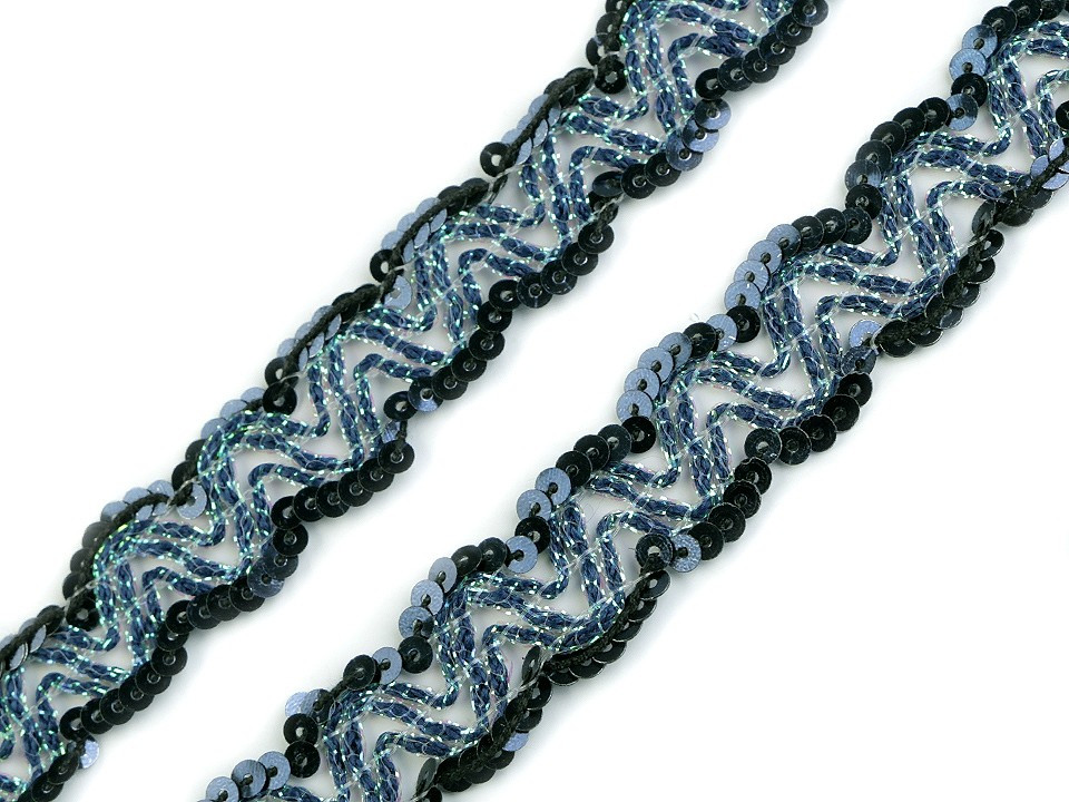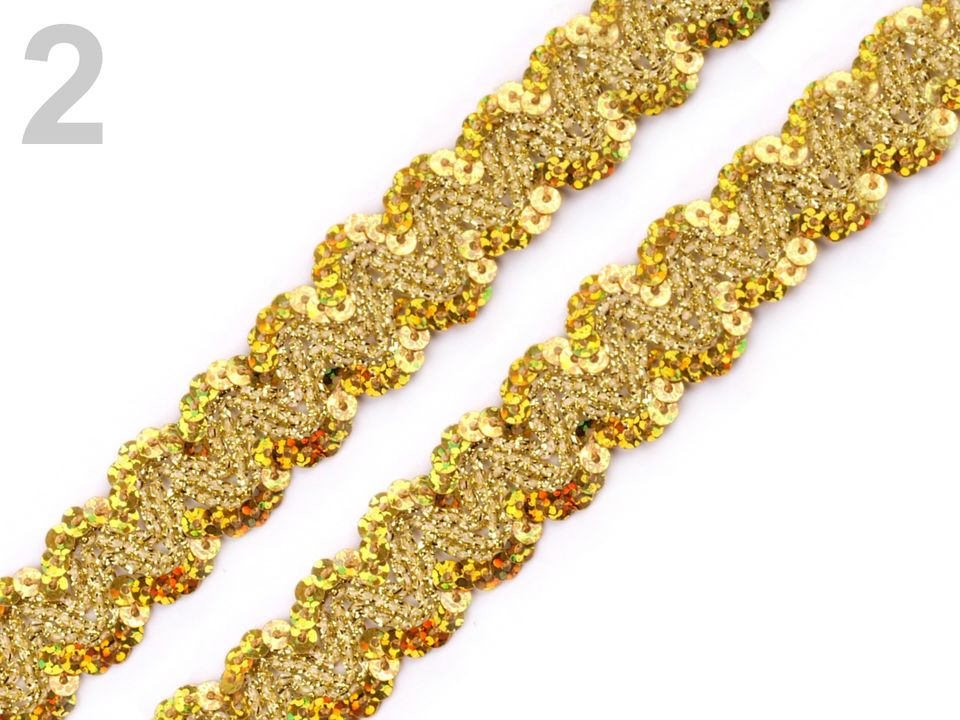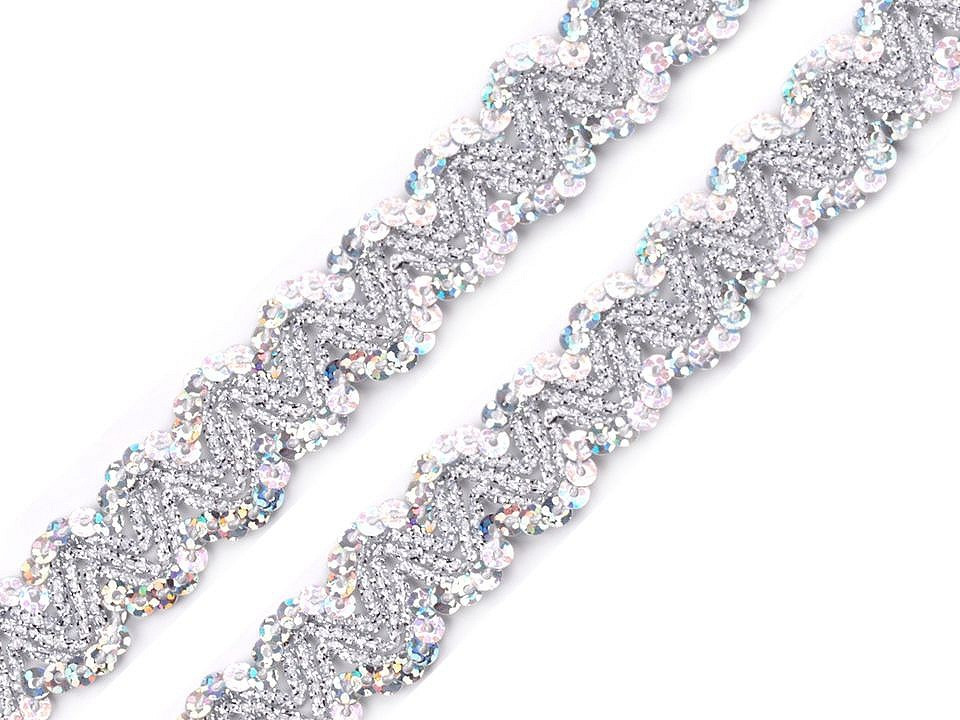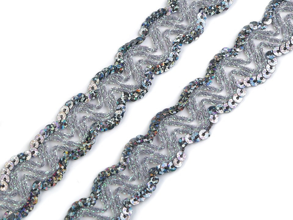 Noblesně působící prýmek s propracovanými detaily. Struktura vlnek je podpořena obloučky z flitrů po okrajích. Efektní třpyt vytváří nejen bohatě vetkaný lurex, ale také hologramová úprava flitrů.