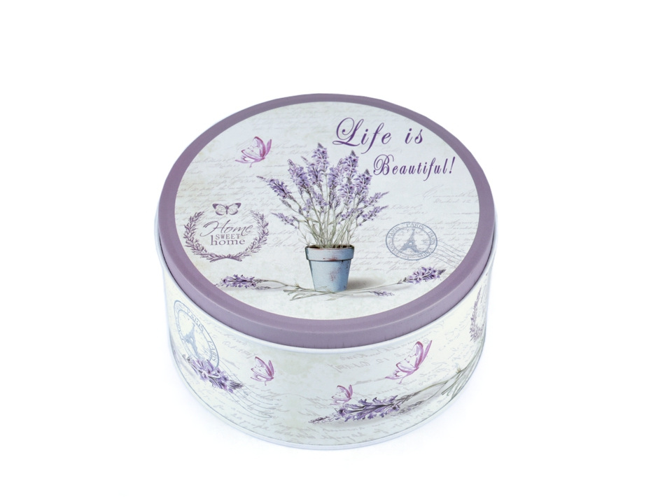Malá kulatá plechová krabice ve vintage stylu s motivem levandule vám připomene romantickou Provence. Je praktickým doplňkem interiéru. Můžete do ní schovat své poklady nebo ji využít na zabalení dárků.