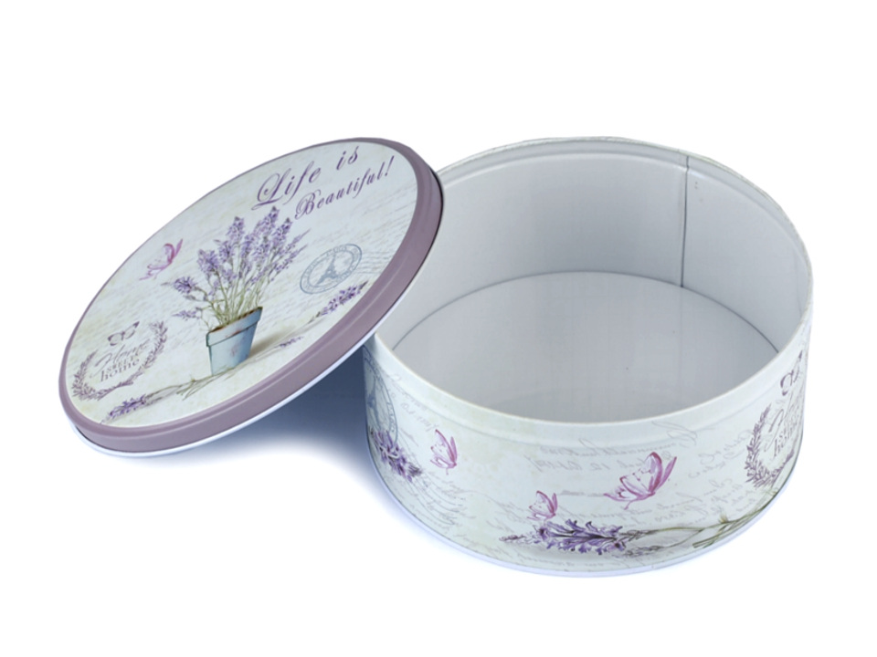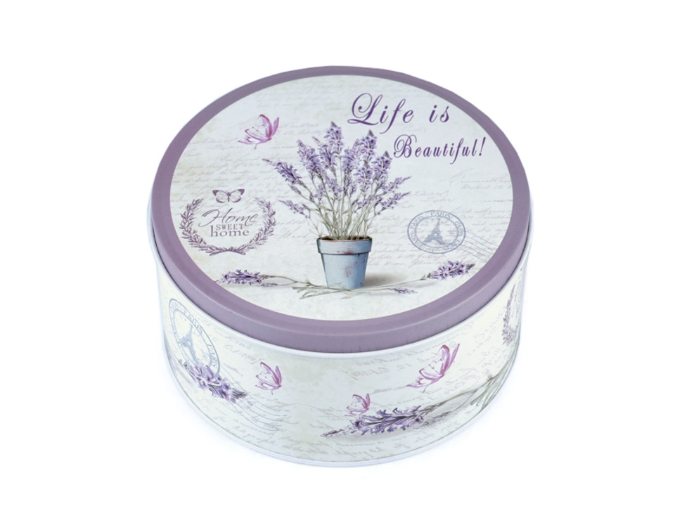 Kulatá plechová krabice ve vintage stylu s motivem levandule vám připomene romantickou Provence. Je praktickým doplňkem interiéru. Můžete do ní schovat své poklady nebo ji využít na zabalení dárků.