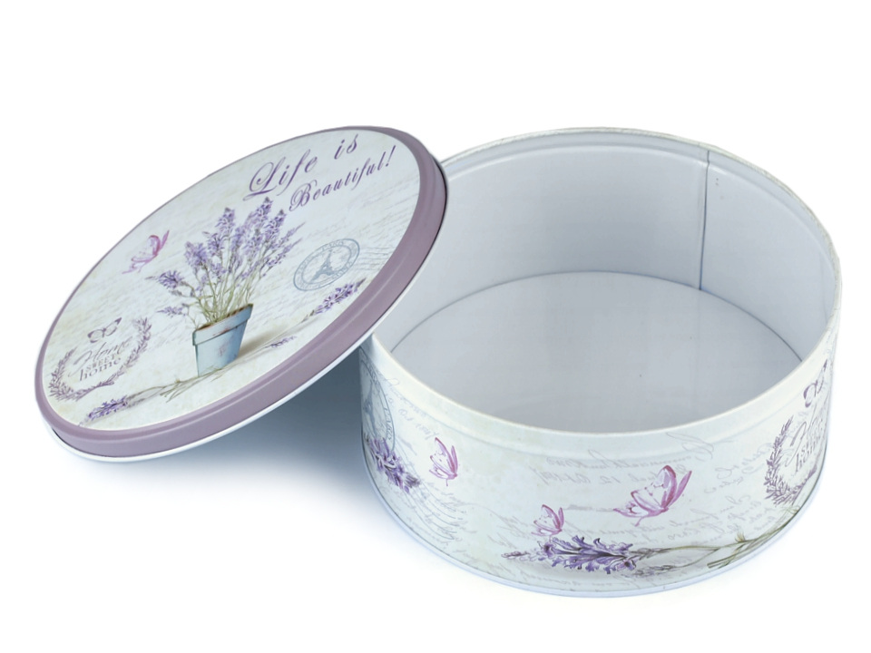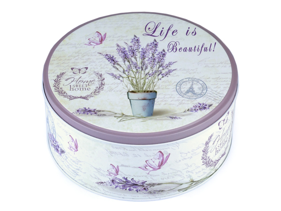 Velká kulatá plechová krabice ve vintage stylu s motivem levandule vám připomene romantickou Provence. Je praktickým doplňkem interiéru. Můžete do ní schovat své poklady nebo ji využít na zabalení dárků.