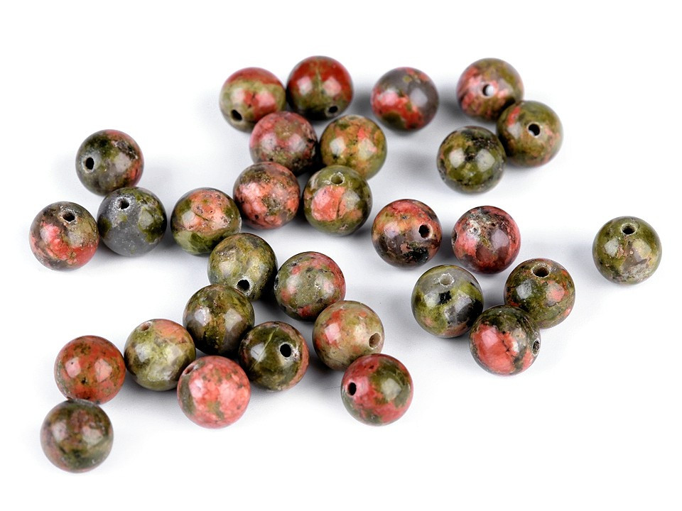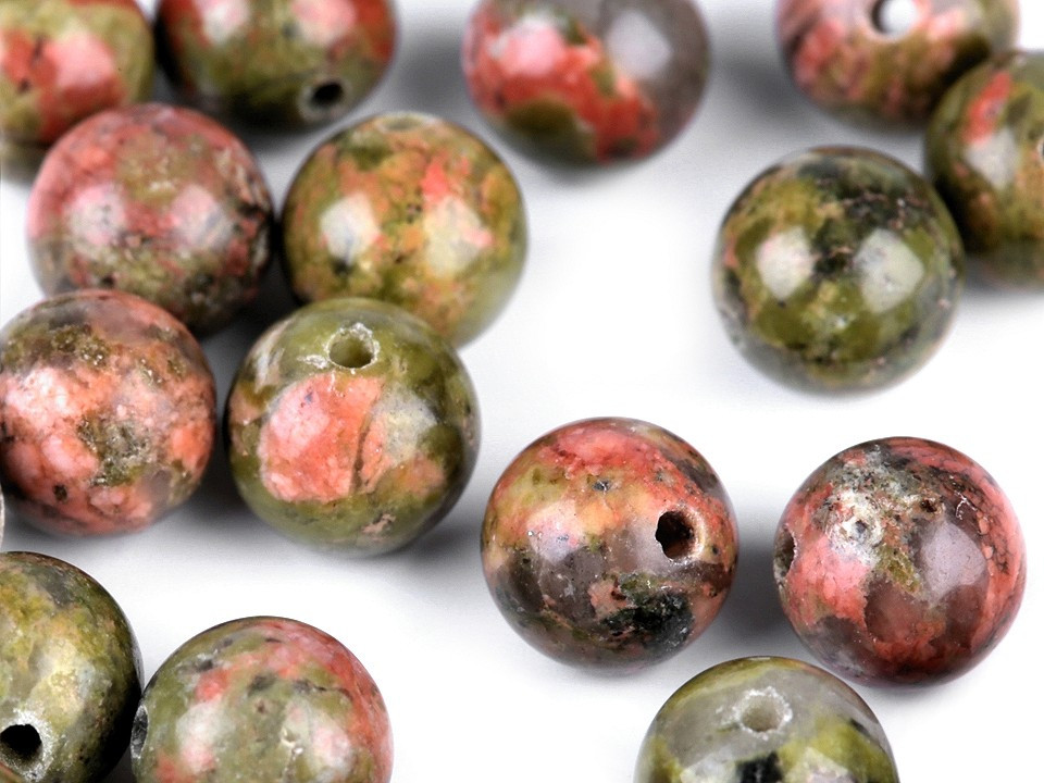 Přírodní minerálové korálky z unakitu jsou oblíbené především šperkaři pro svou zajímavou barvu a kresbu. Svou velikostí jsou ideální na výrobu jemnějších Buddhových náramků. Jsou oblíbené na techniku drátování, v kombinaci s drahými kovy, ale i s obyčejnými drátky. Skvěle vypadají i na jednoduchých návlekových šňůrách , které svým přírodním složením ozvláštní.
