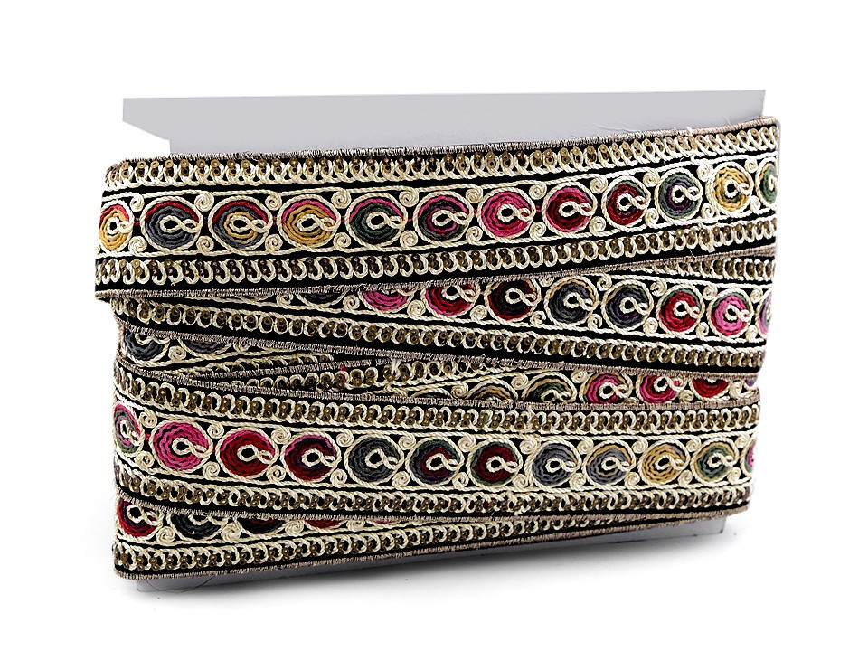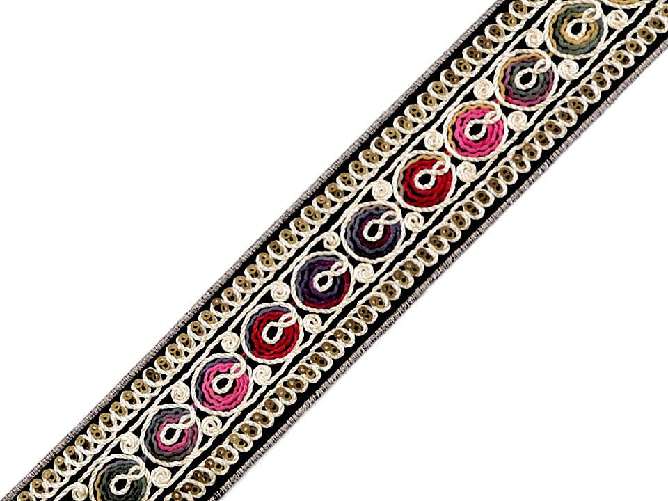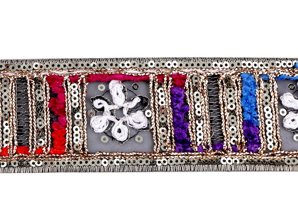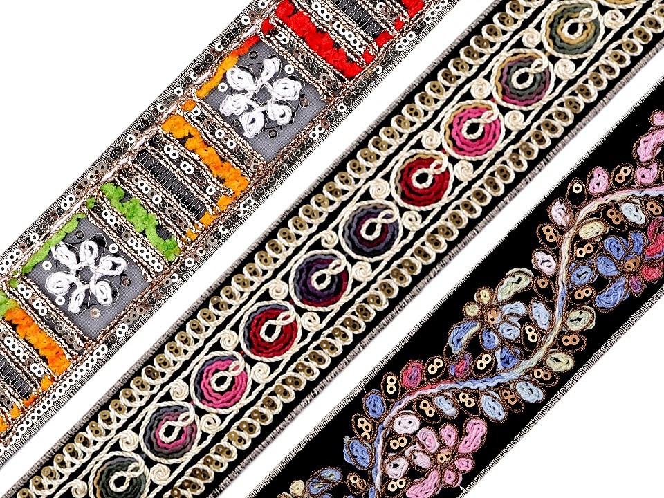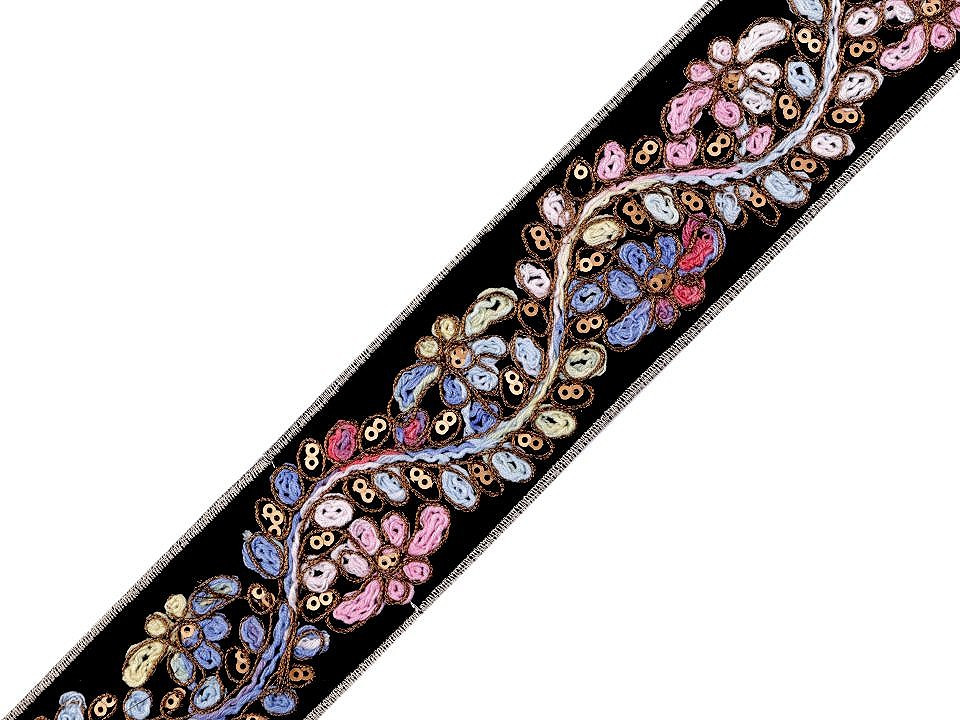 Vyšívaný prýmek s ornamenty. Jemně se třpytí díky všitému lurexovému vláknu a drobným flitrům. Prýmek můžete použít k ozdobení kabátů, svetrů, sak, šatů, sukní, kostýmů nebo bytového textilu. Podklad prýmku je z pevné imitace sametu.
