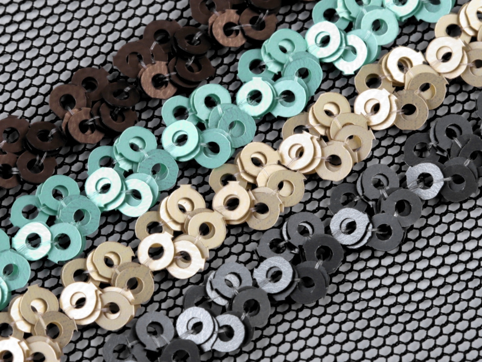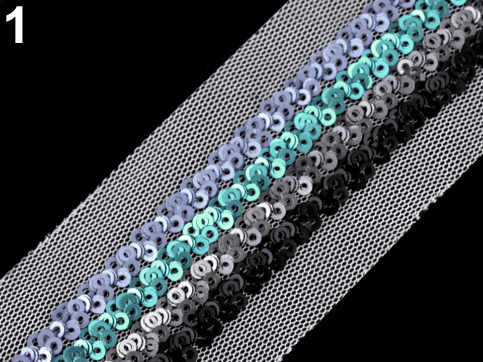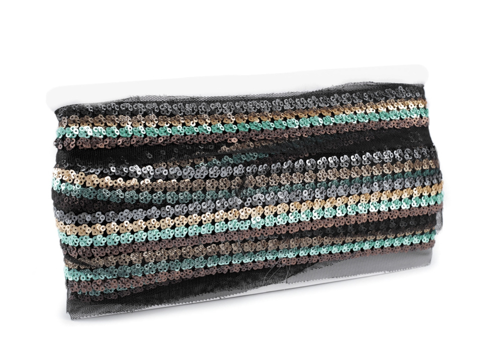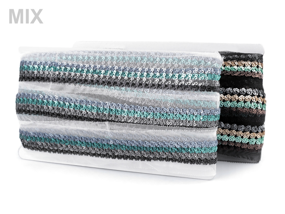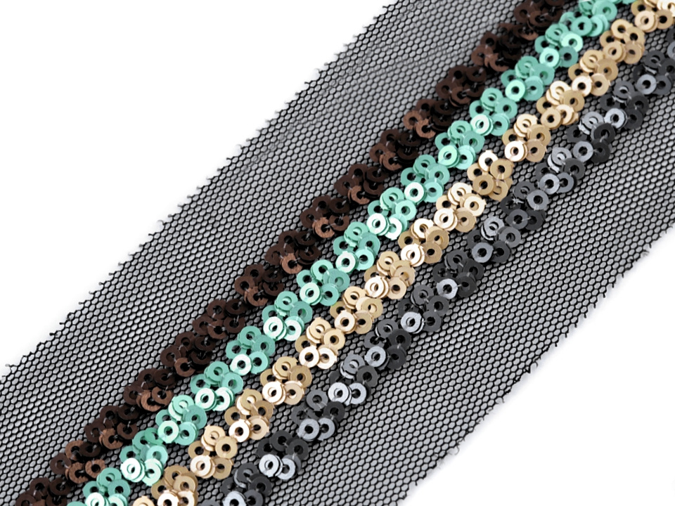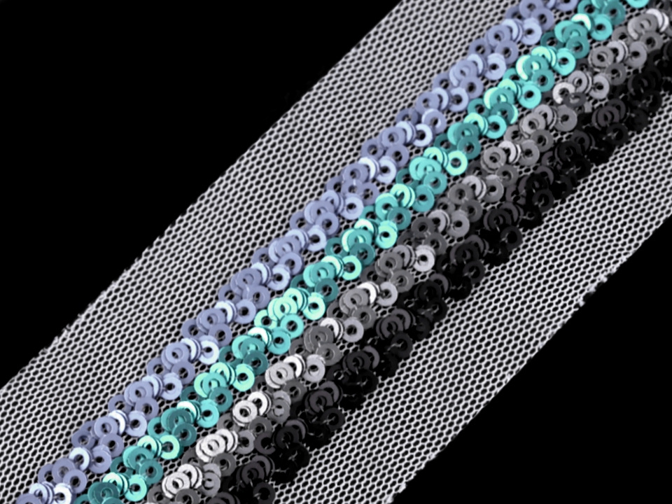 Flitrový prýmek s motivem pruhů na podkladovém monofilu. Díky drobným flitrům se oslnivě leskne. Využijete jej ke zdobení společenských a plesových šatů, halenek nebo kostýmů. Můžete ho použít na lemy, do dekoltů apod. Je vhodný také k oživení psaníček, bolerek, nebo bytového textilu.