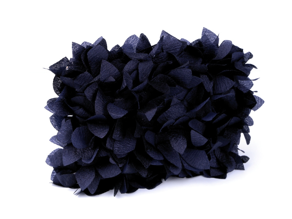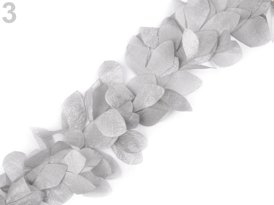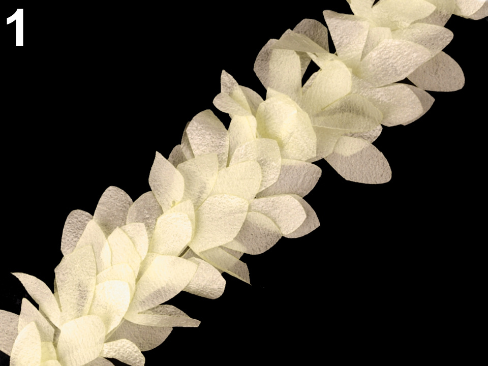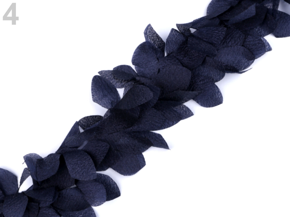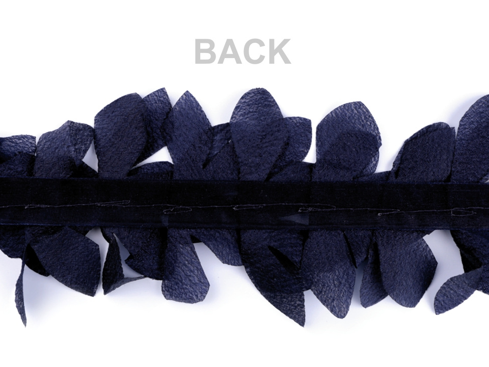 Prýmek je velmi originální díky svému designu lístků. Lístky / květy jsou poskládané za sebou a přišité k monofilové stuze. Působí bohatě a nadýchaně, mají jemný lesk a zajímavou strukturu materiálu.