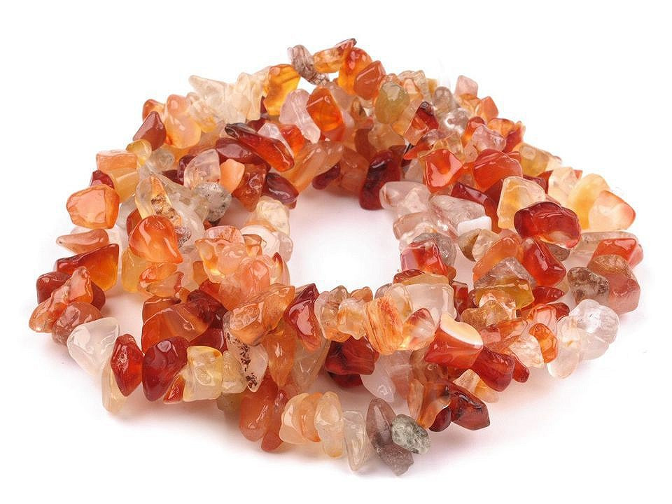 Minerálové zlomky karneolu jsou jedny z nejvariabilnějších bižuterních prvků. Jsou půvabné svým průsvitem a přechody barev. Tyto korálky jsou jedním z našich hitů, což je dáno jejich kvalitou a velmi příznivou cenou. Na jedné šňůře je cca 217 zlomků.