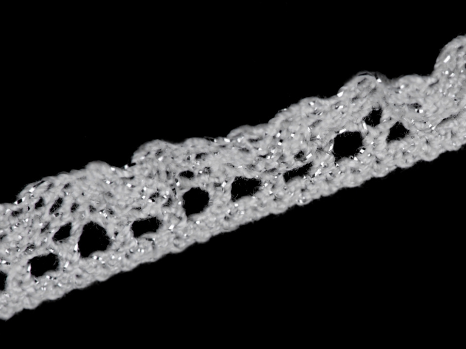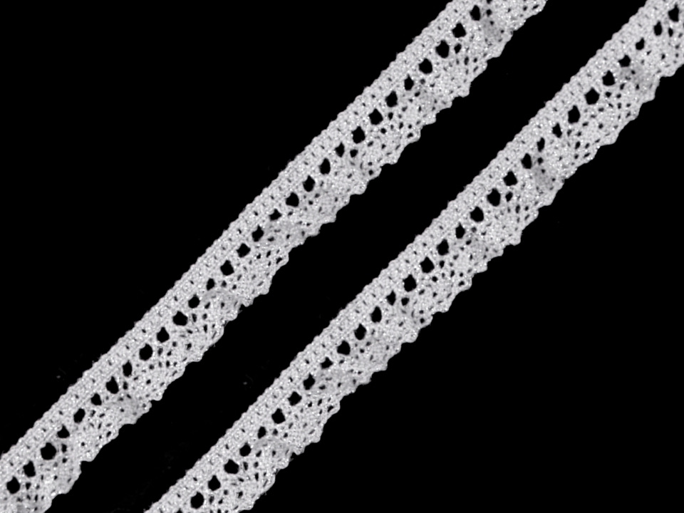 Elastickou krajku zdobí lurex. Krajka vytváří decentní volánky.