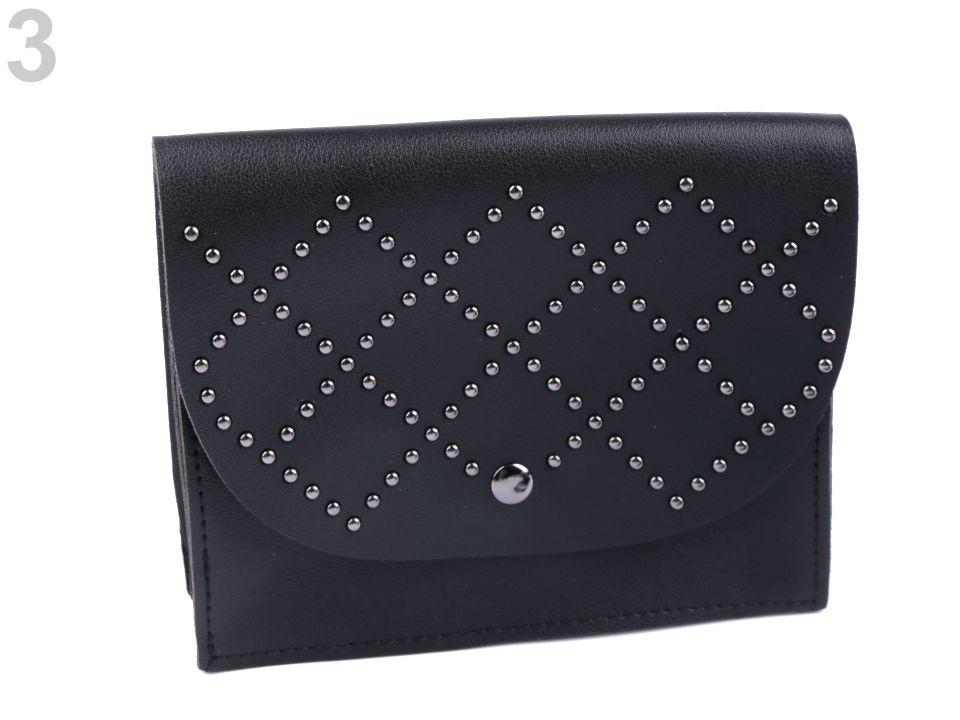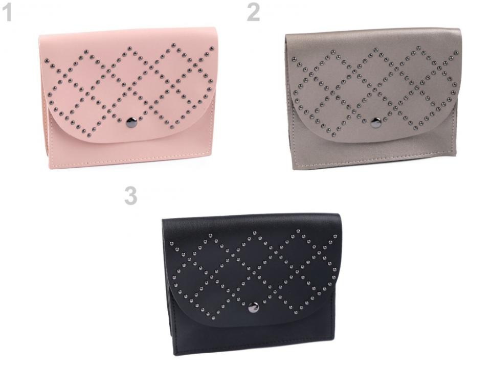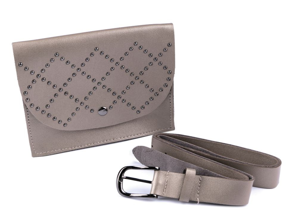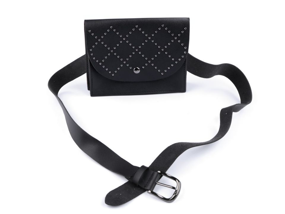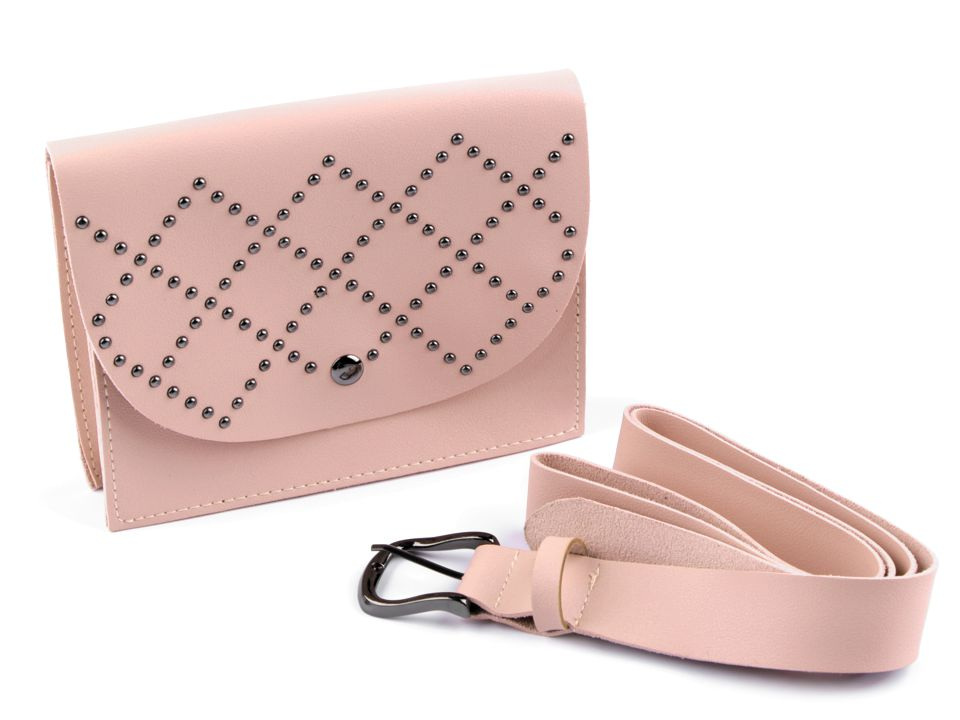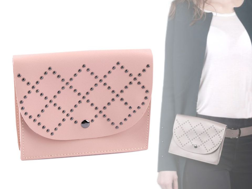 Kabelka na opasku bude nevšedním doplňkem vašeho outfitu. Oproti ledvince se jedná o elegantnější verzi praktického módního doplňku, který vám umožní uložení základních věcí potřebných pro rychlé vyběhnutí do města, obchodu nebo jen tak na procházku. Přední stranu kabelky zdobí geometrický ornament složený z drobných cvočků. Tašku je možné nosit také v ruce jako psaníčko.