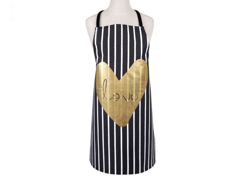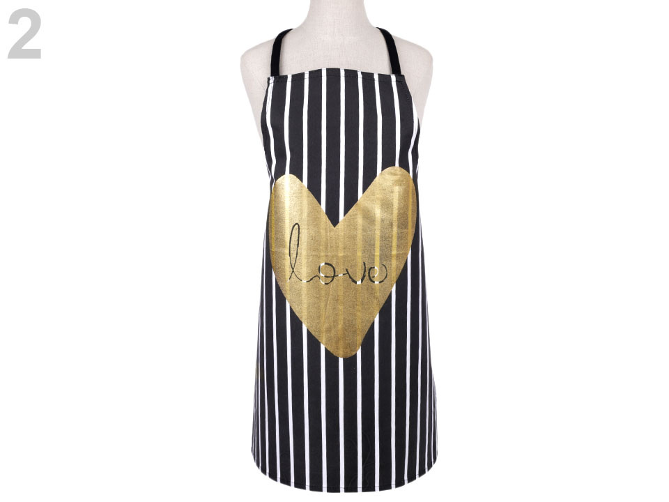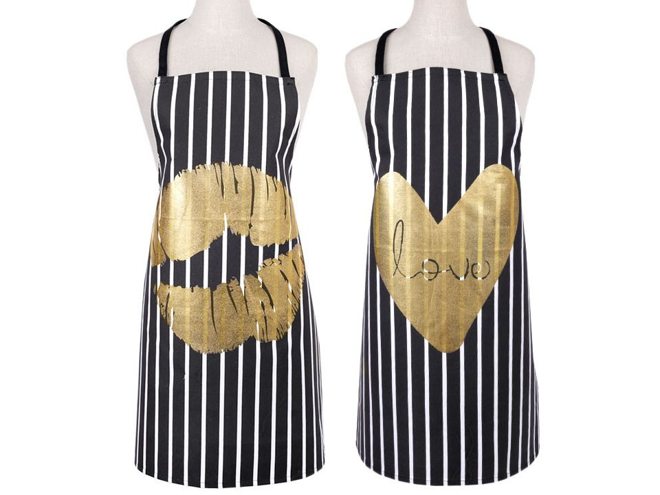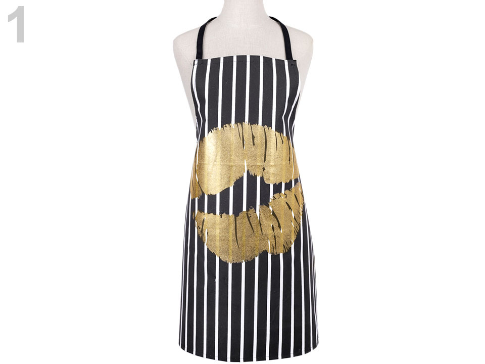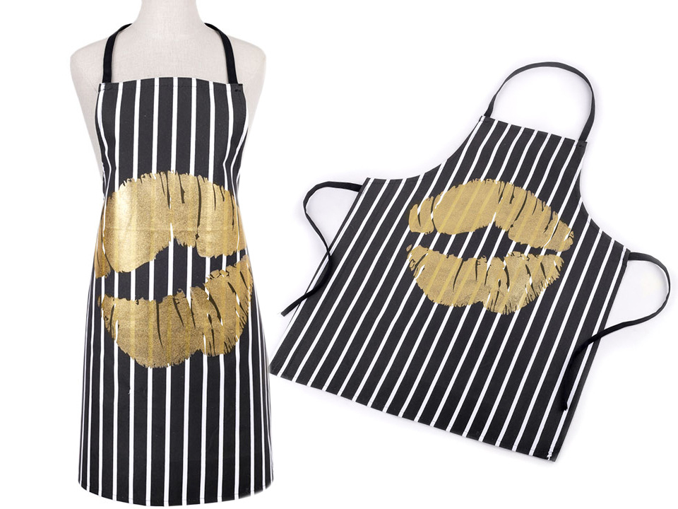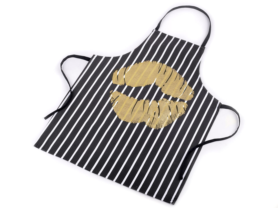 Stylovou kuchyňskou zástěru s pruhy a zlatým potiskem ocení všichni, kdo milují vaření a určité standardy při servírování pokrmů.