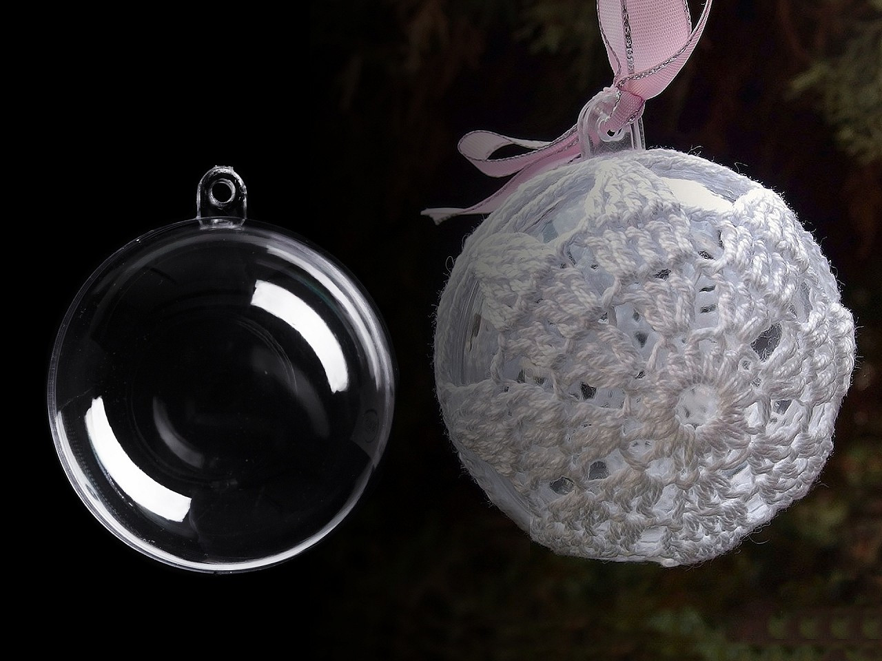 Průhledná plastová koule se skládá ze dvou dílů, které spojíte a díky očku pověsíte jako dekoraci. Je určena k dalšímu dozdobení např. ji můžete obháčkovat, dekorovat metodou quilling, ubrouskovou technikou, dozdobit glitry atd.