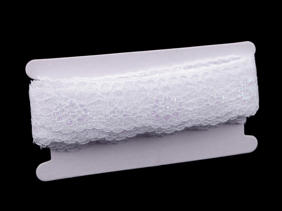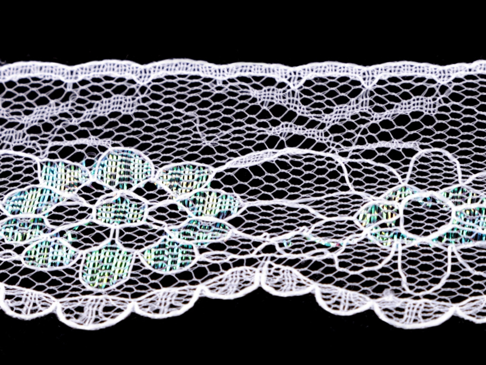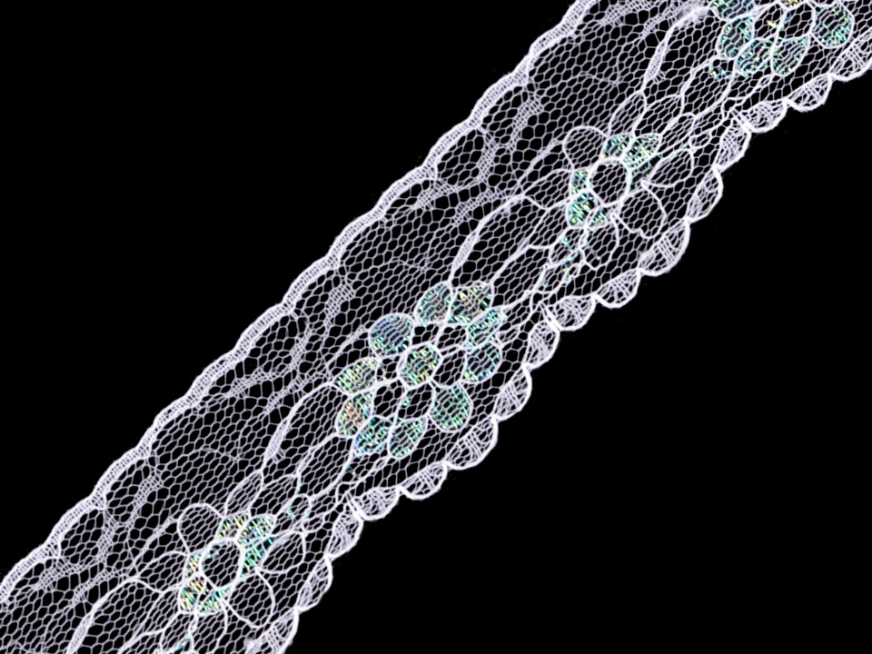Syntetická krajka je zajímavá díky motivům květů, které jsou doplněné lurexem s AB efektem.