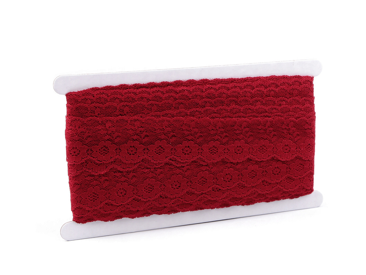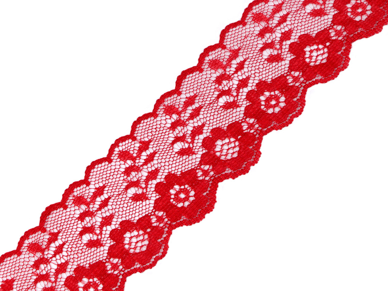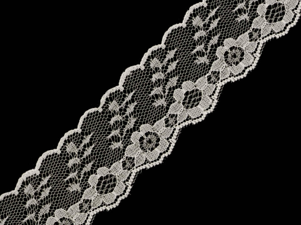 Syntetická krajka působí jemně a její okraje zdobí motivy květů. Krajka je pevná, není pružná.