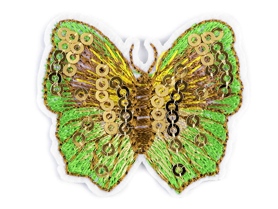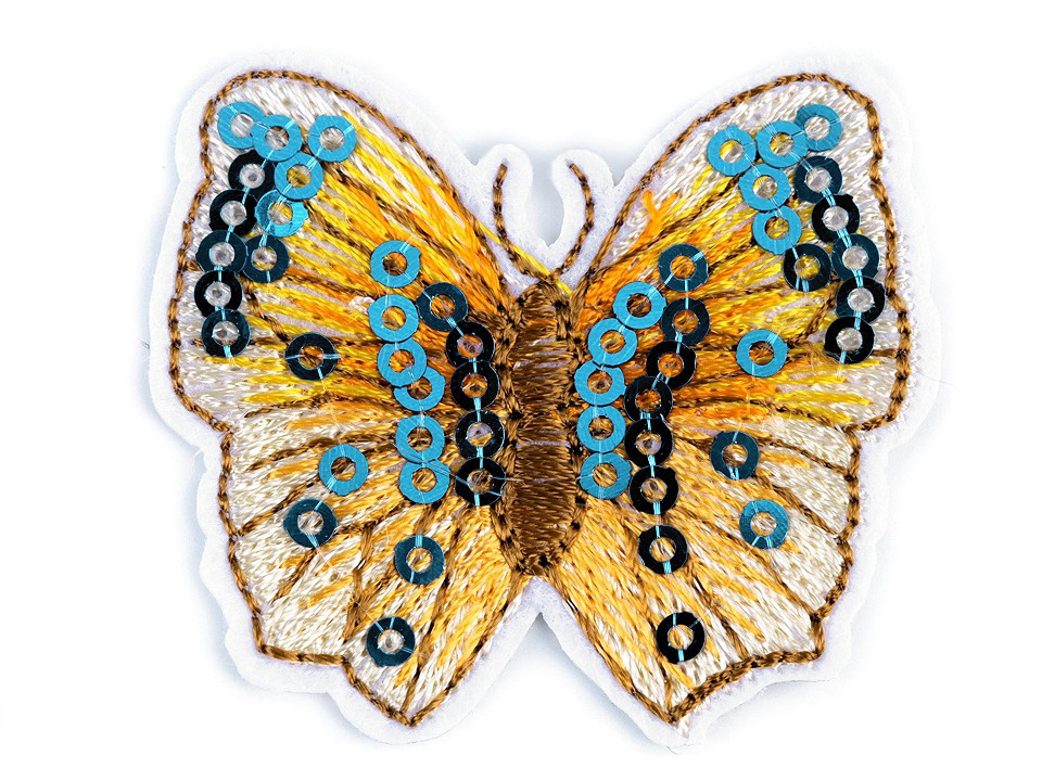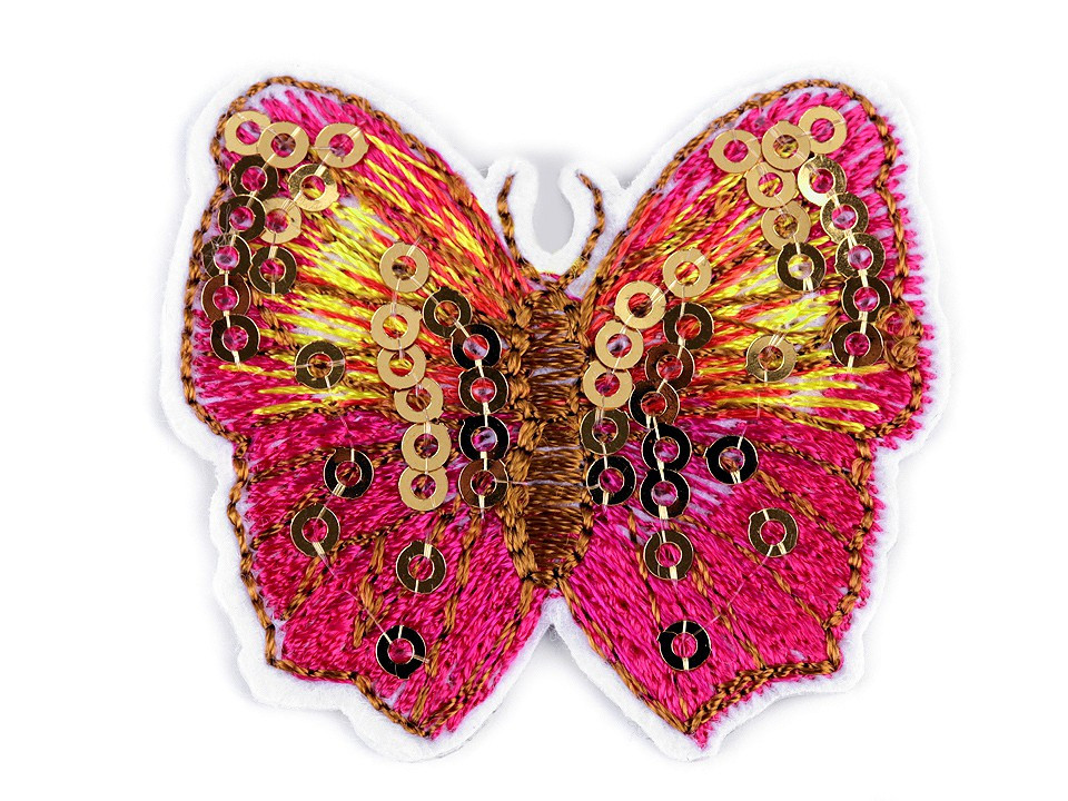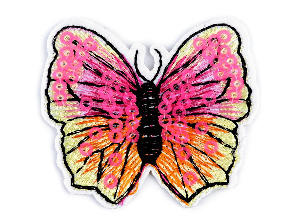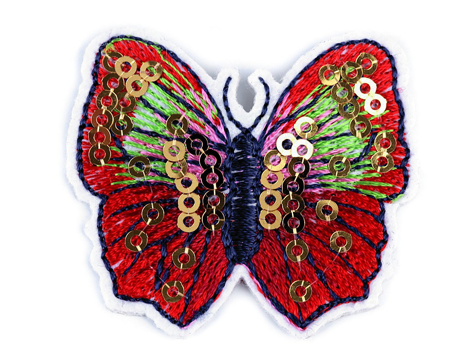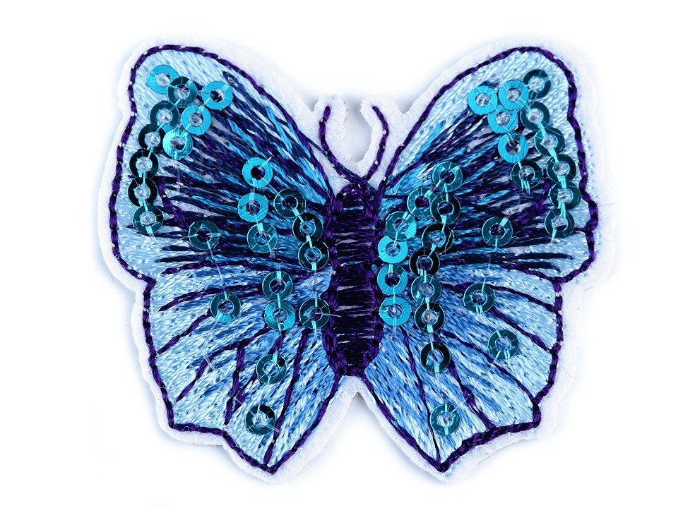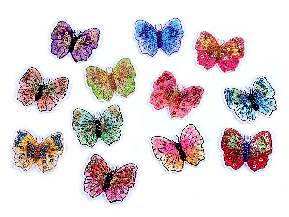 Nažehlovačka s motivem barevného motýla posetého flitry potěší všechny slečny. Díky lesklým flitrům a detailní celoplošné výšivky bude nepřehlédnutelným prvkem, oživujícím oblečení i doplňky.