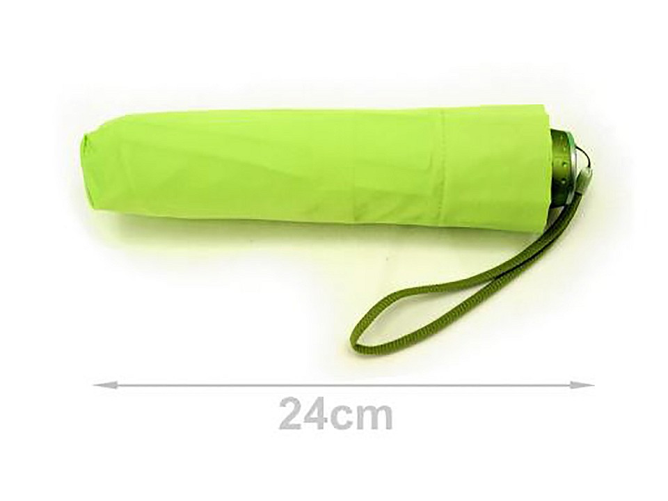 Rozevřený deštník má Ø98 cm a délka 55cm. Ve složeném stavu měří 24cm. Konstrukce je z kovového drátu. Obal se zapíná na zip.