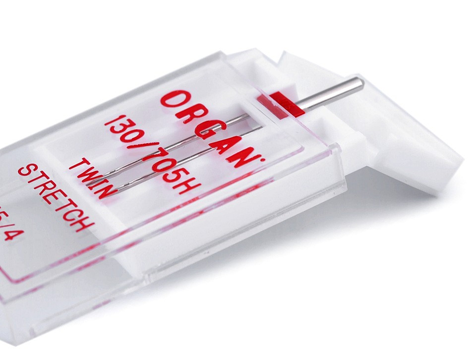 Dvojjehla Stretch Organ je vhodná na elastické materiály, jako jsou stretch a lycra. Rozteč jehly je 4 mm. Jehly mají z jedné strany plošku.