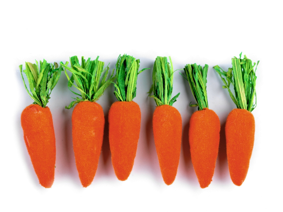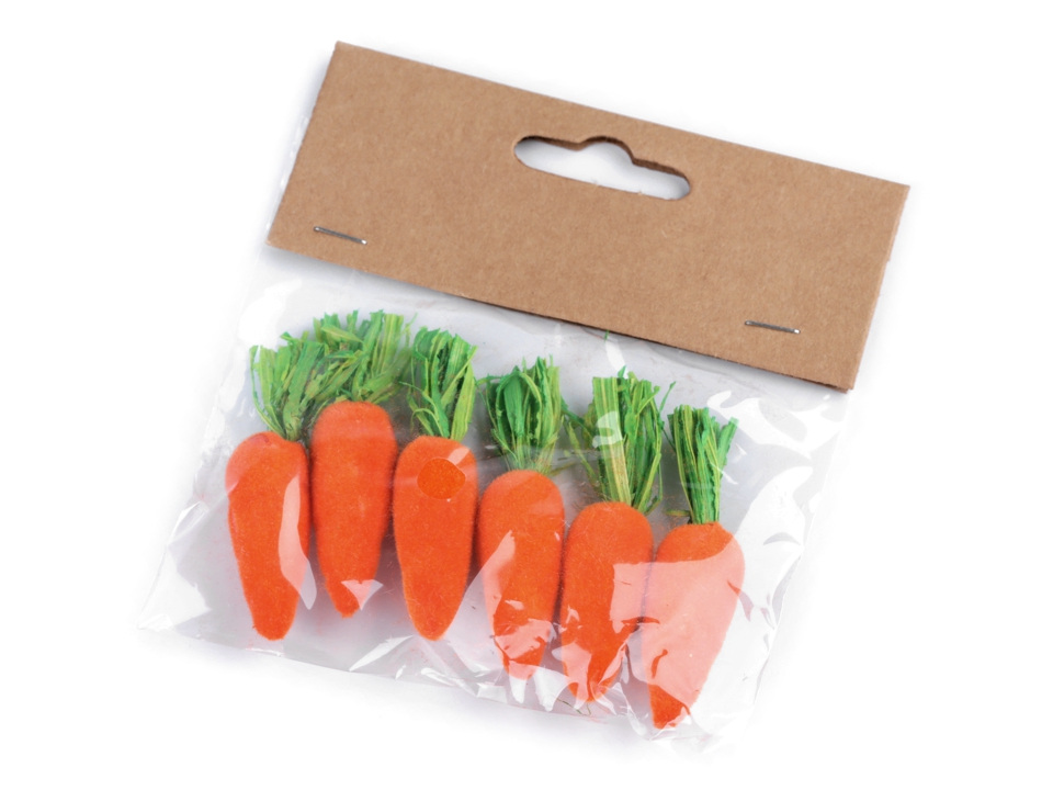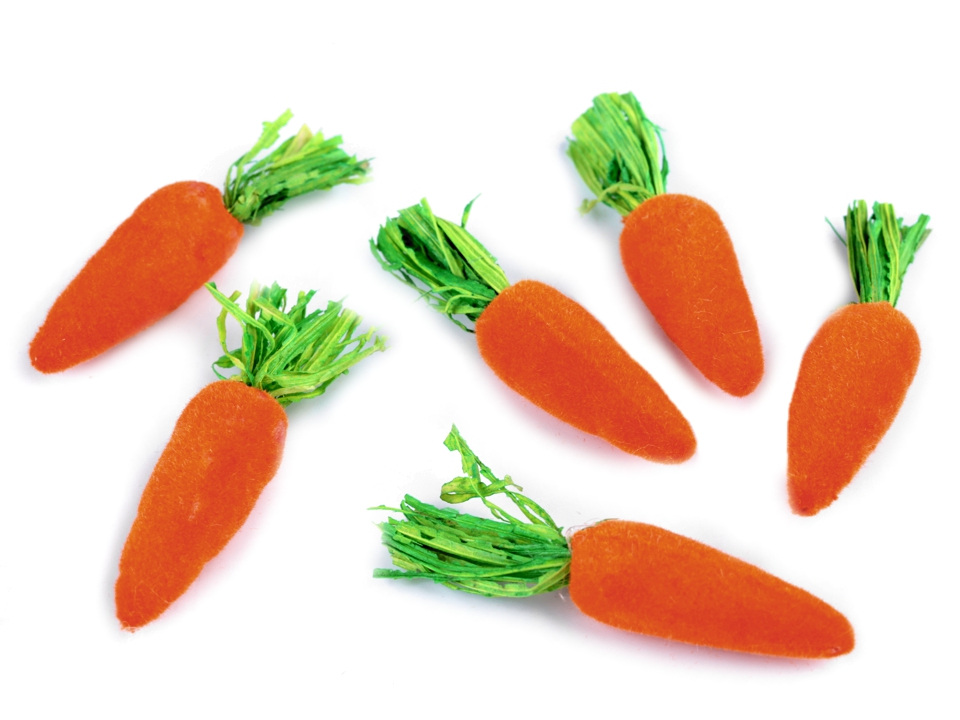 Dekorační mrkvička je z polystyrenu, který má povrch obalený jemným plyšem. Mrkvičky využijete na ozdobení věnců, květináčů, květinových vazeb i jako vtipnou dekoraci dárku.