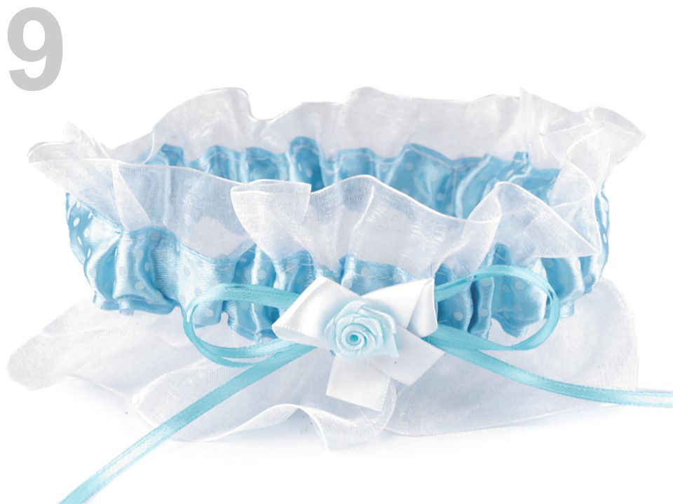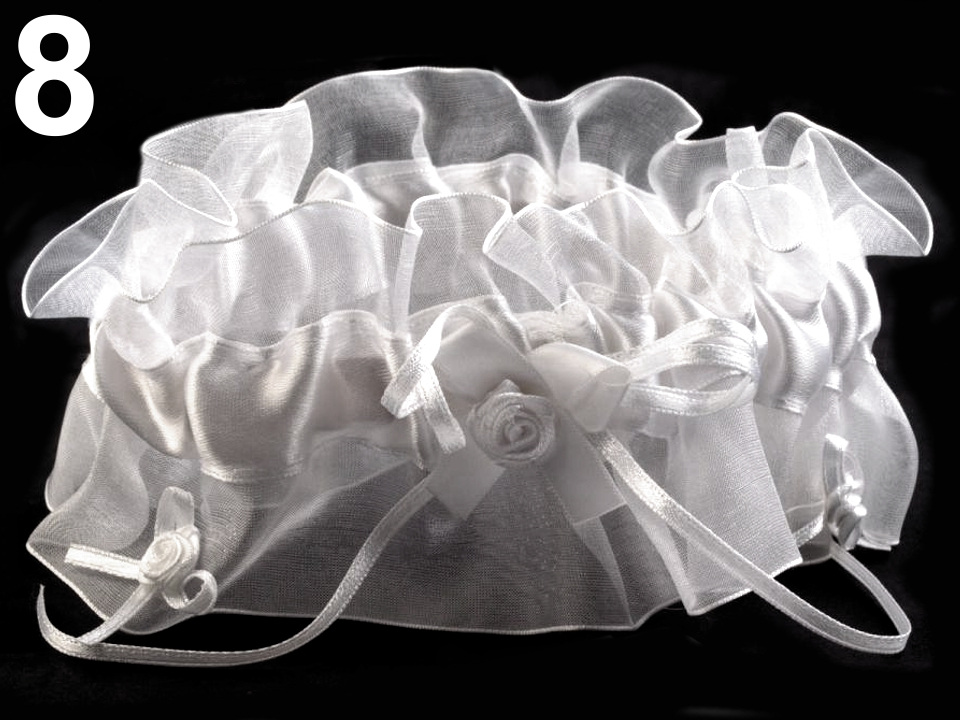 Podvazek Ø 14 cm, obvod volně položený 34 cm, výška v rozmezí od 70 - 80 mm. Dá se natáhnout na obvod stehna do 75 cm, je vhodný nejen pro štíhlé nevěsty, ale i pro korpulentnější dámy.