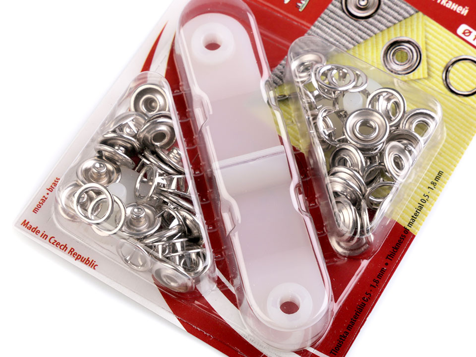 Knoflíky se používají ke spojování jemných a poddajných druhů látek - froté, úplet, košilovina aj. Nýtování se provádí mini lisem, který je součást balení.