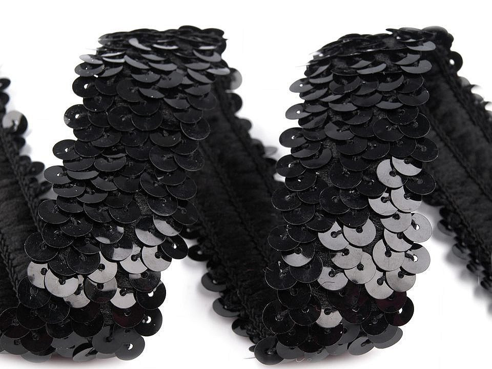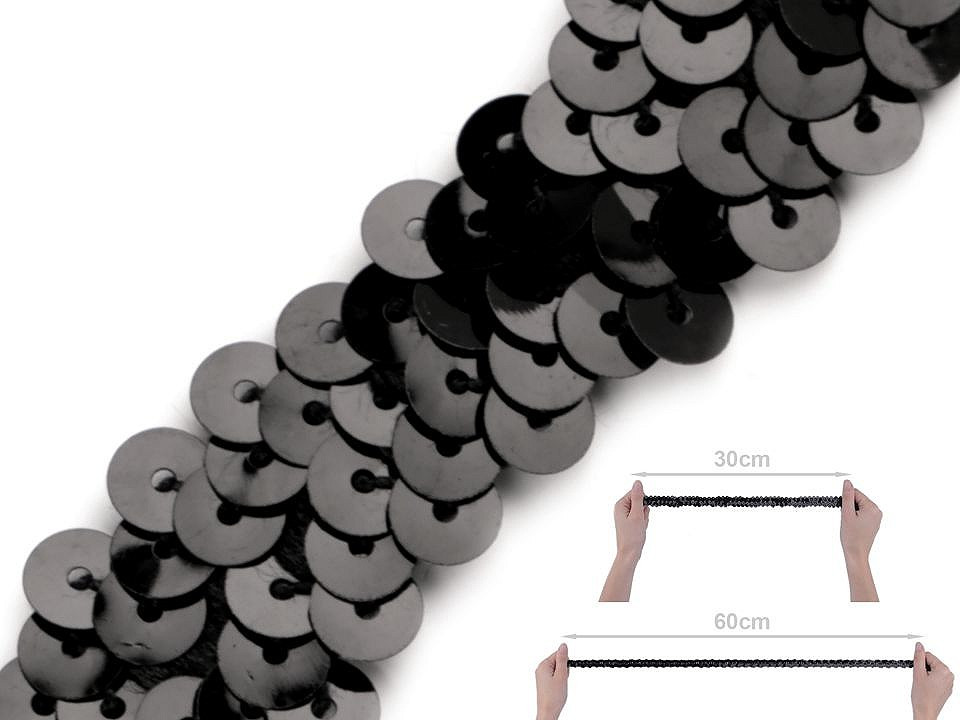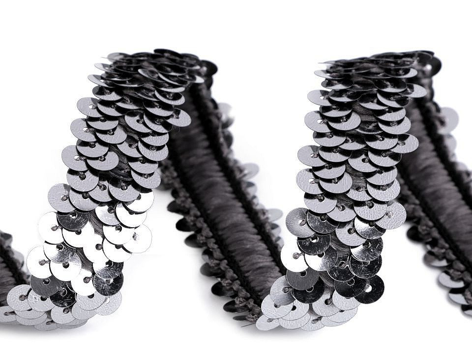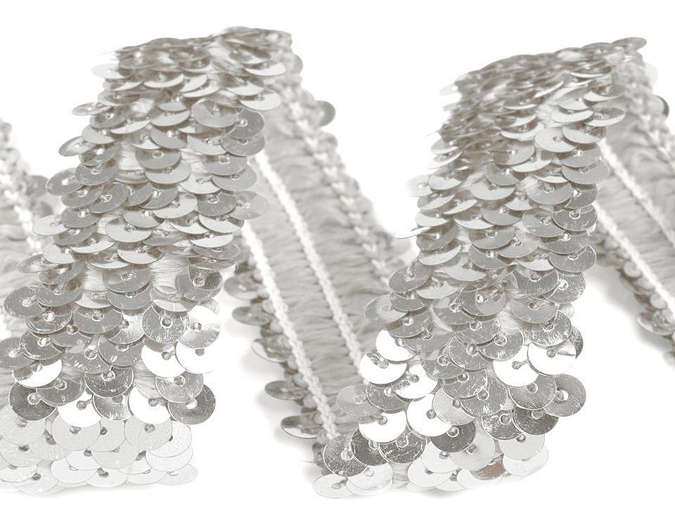 Prýmek je hustě pošitý flitry, které se díky odrážejícímu světlu třpytí ze všech úhlů. Ve spodní straně je zašitá guma, takže je elastický.