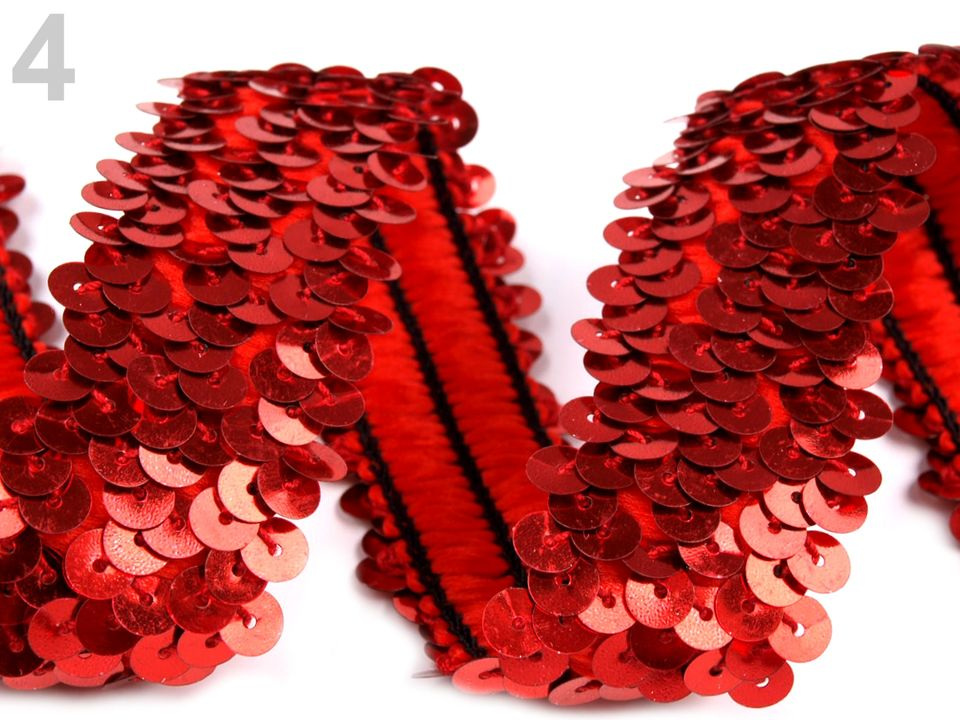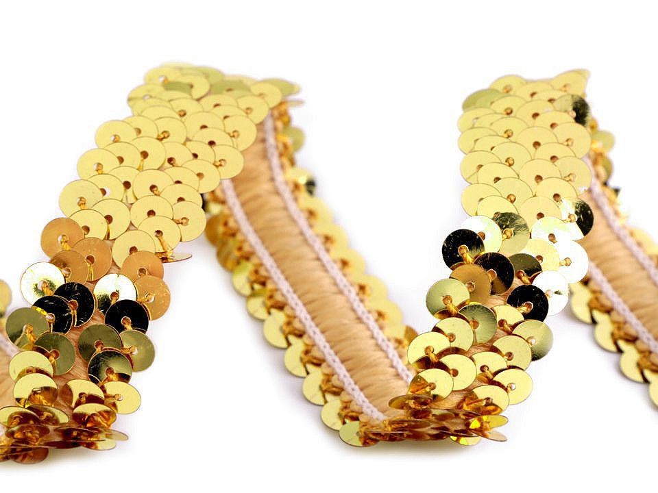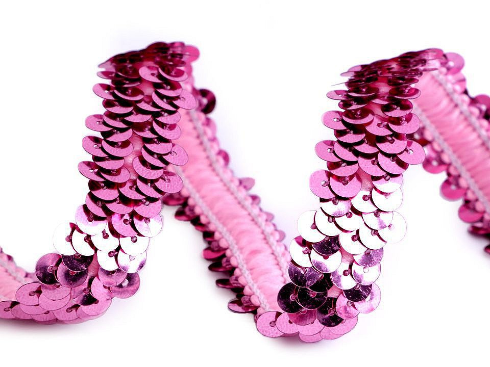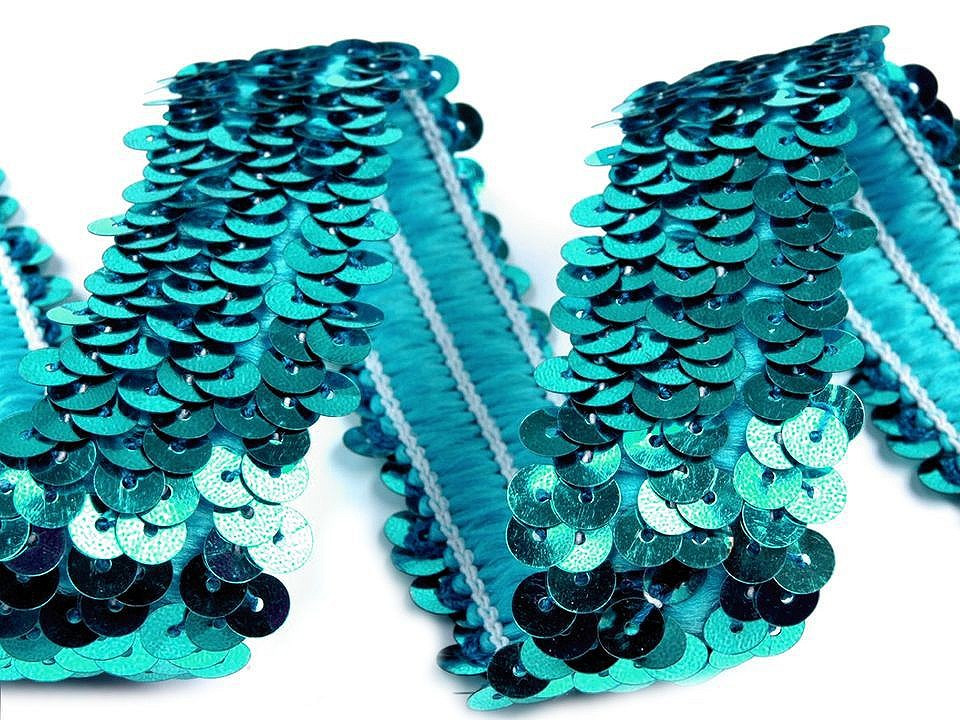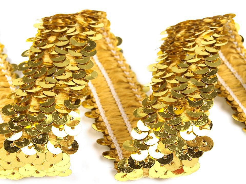 Prýmek je hustě pošitý flitry, které se díky odrážejícímu světlu třpytí ze všech úhlů. Ve spodní straně je zašitá guma, takže je elastický.