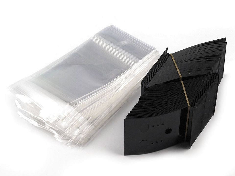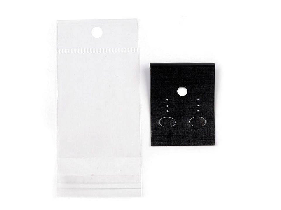 Na bižuterní kartu můžete zavěsit náušnice. Karty mají tmavý i světlý povrch, bižuterie s povrchovou úpravou stříbra, zlata, mědi i chirurgická ocel vynikne. Součástí karty je i sáček.
